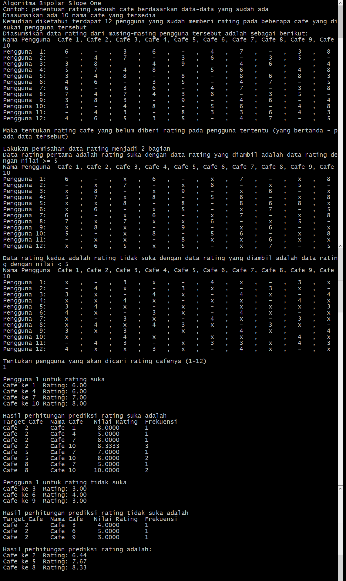 Maka tentukan rating cafe yang belum diberi rating pada pengguna tertentu (yang bertanda – pada data tersebut)