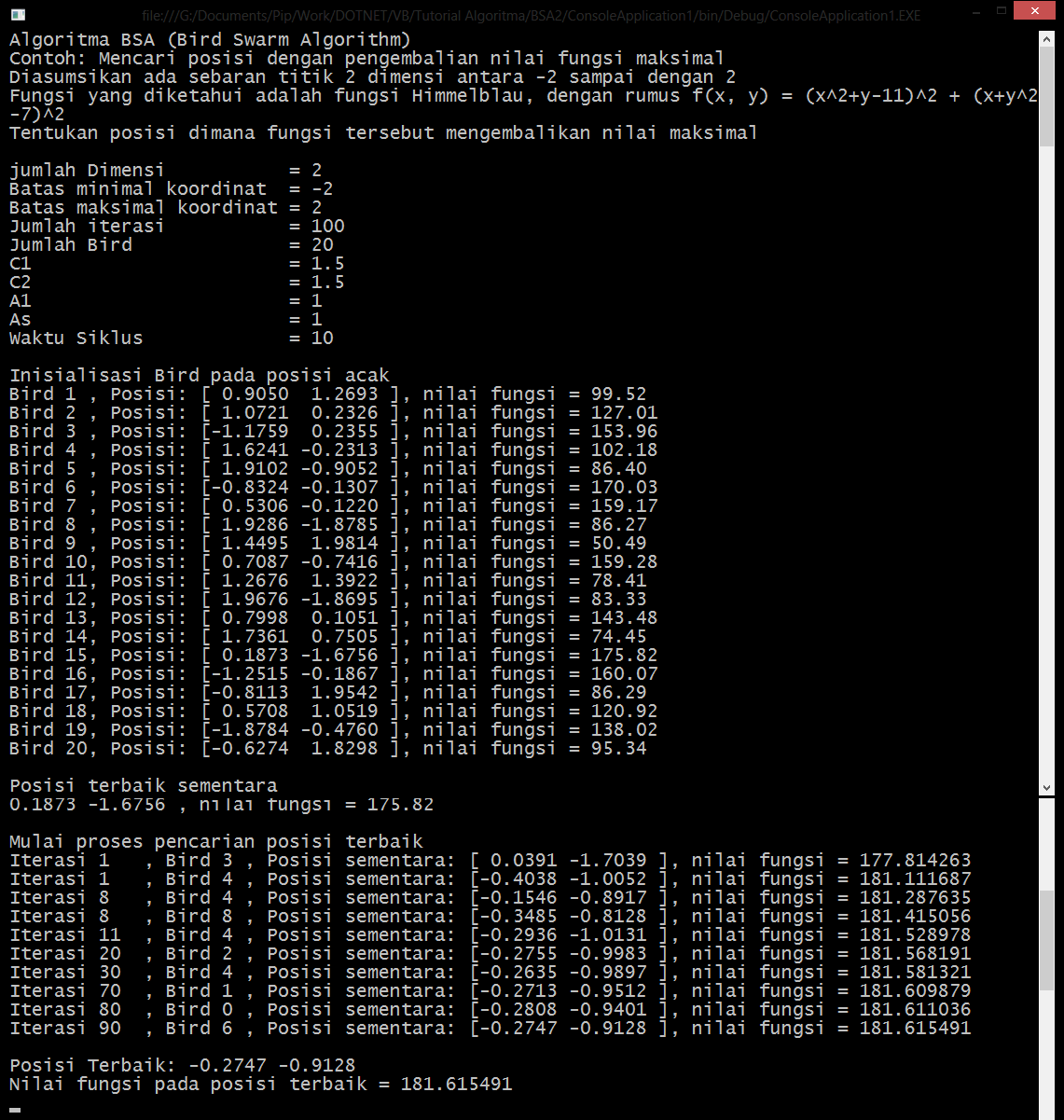 Dim posisiTerbaik() As Double = BSA(dimensi, minPosisi, maksPosisi, jumlahIterasi, jumlahBird, _ c1, c2, a1, a2, waktuSiklus)