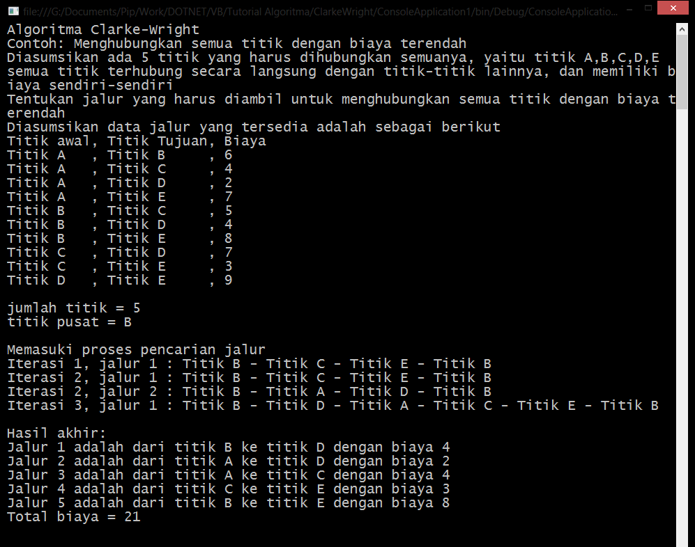 Console.WriteLine("Jalur " & i + 1 & " adalah dari titik " & garis.titikAwal.Label & " ke titik " & garis.titikTujuan.Label & " dengan biaya " & garis.biaya)