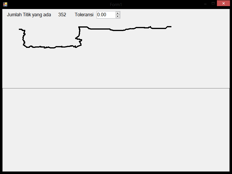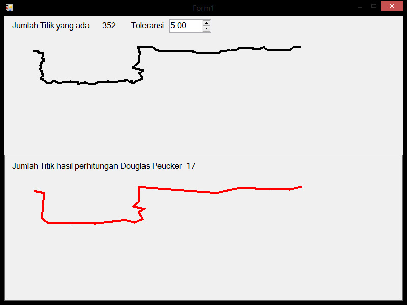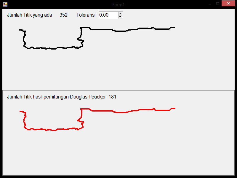 If isHitungDouglasPeucker Then Dim daftarTitikDP As List(Of Titik) = DouglasPeucker.ProsesDouglasPeucker(daftarTitik, Convert.ToDouble(numToleransi.Value)) daftarTitikTergambar = New List(Of System.Drawing.Point)() For Each titik As Titik In daftarTitikDP daftarTitikTergambar.Add(New System.Drawing.Point(Convert.ToInt32(titik.X), Convert.ToInt32(titik.Y))) Next 'e.Graphics.DrawLines(New Pen(Brushes.Blue, 4), daftarTitikTergambar.ToArray()) lblTitikHasilAkhir.Text = daftarTitikTergambar.Count.ToString() Dim bmp As Bitmap = New Bitmap(PictureBox1.Width, PictureBox1.Height) Dim gr As Graphics = Graphics.FromImage(bmp) gr.DrawLines(New Pen(Brushes.Red, 4), daftarTitikTergambar.ToArray()) PictureBox1.Image = bmp.Clone bmp.Dispose() End If