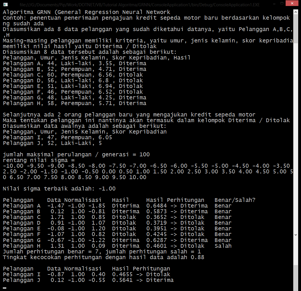 Jika nilai output bernilai lebih dari 0.5 maka pelanggan tersebut memiliki nilai hasil Diterima