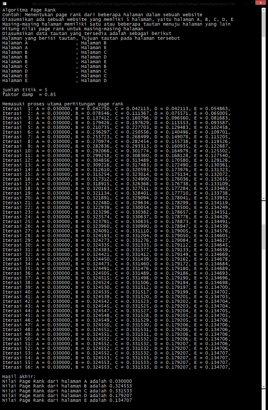 Console.WriteLine("Nilai Page Rank dari halaman " & Chr(i + 65) & " adalah " & daftarTitik(i).PageRank.ToString("F6"))