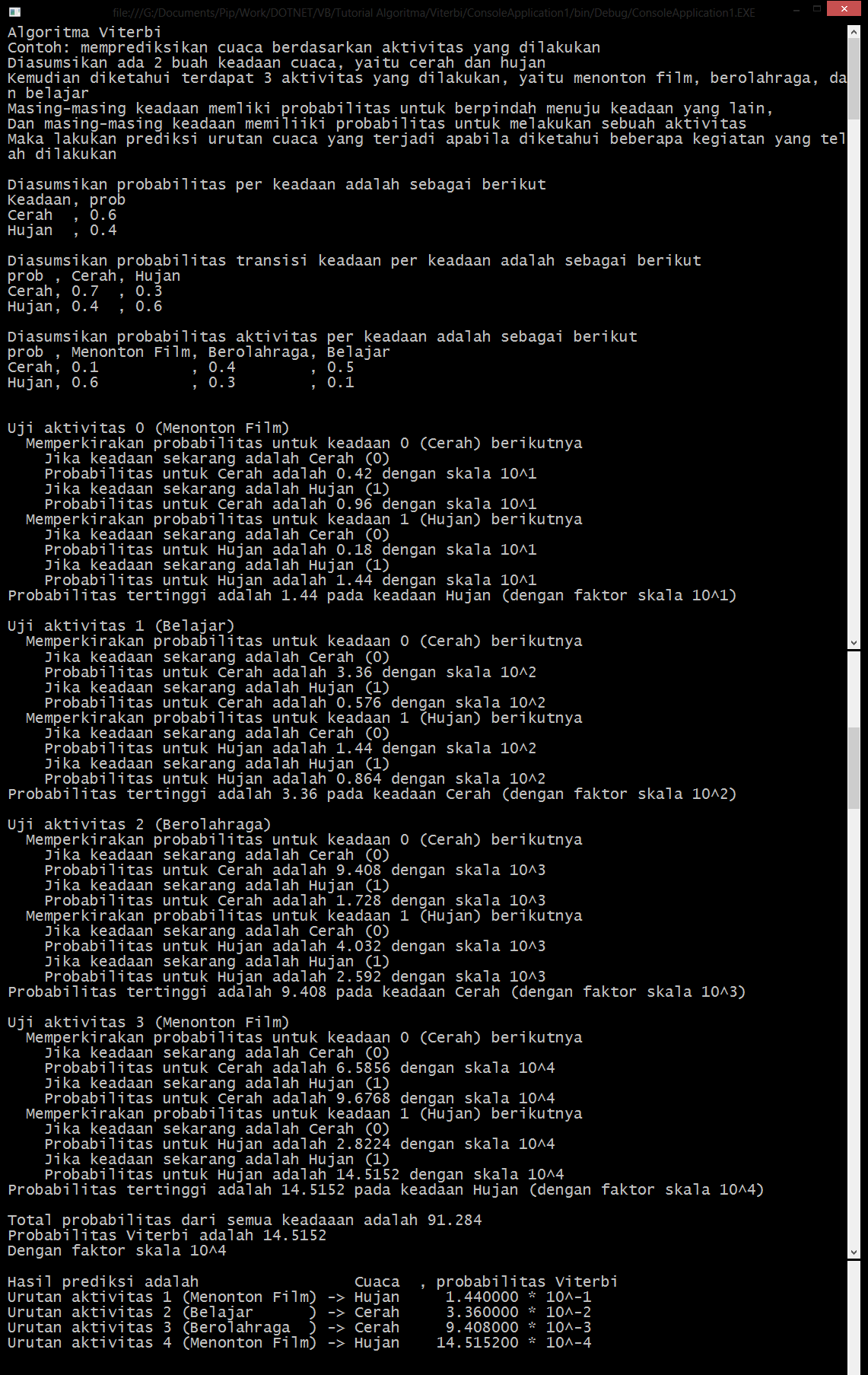 Algoritma Viterbi adalah salah satu algoritma yang dapat digunakan untuk melakukan prediksi. Contoh yang dibahas kali ini adalah mengenai memprediksikan cuaca berdasarkan data aktivitas yang dilakukan.