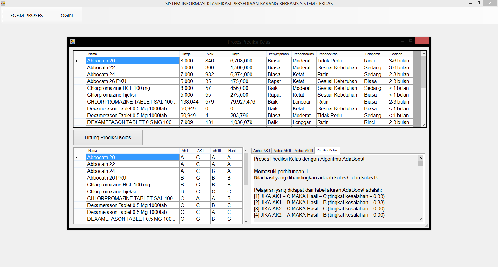 Ada berbagai data barang yang memiliki 8 atribut, yaitu Harga, Stok, Biaya, Status Penyimpanan, Status Pengendalian, Status Pengecekan, Status Pelaporan, Status Sediaan. Setelah melakukan penyimpanan terhadap data barang yang digunakan, maka selanjutnya adalah melakukan prediksi kelas untuk masing-masing data barang.