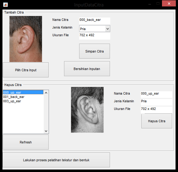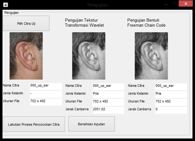 | Ada berbagai citra daun telinga yang telah disediakan. Pada figure Input Data Citra, Citra-citra ini akan disimpan ke dalam database sebagai citra latih, dan kemudian dilatih untuk mendapatkan nilai pelatihan dari masing-masing metode. Selanjutnya pada figure Pengujian, akan diinputkan sebuah citra uji yang nantinya akan dihitung nilainya, dan dibandingkan dengan semua nilai pelatihan yang sudah disimpan dalam database. Nilai yang paling mendekati akan terpilih sebagai jawaban. Metode yang digunakan adalah metode FCC (Freeman Chain Code) dan DWT (Discrete Wavelet Transform). Nantinya dapat dibandingkan tingkat akurasi manakah yang lebih akurat diantara kedua metode tersebut. Tutorial dari masing-masing metode dapat dilihat pada link diatas. | |