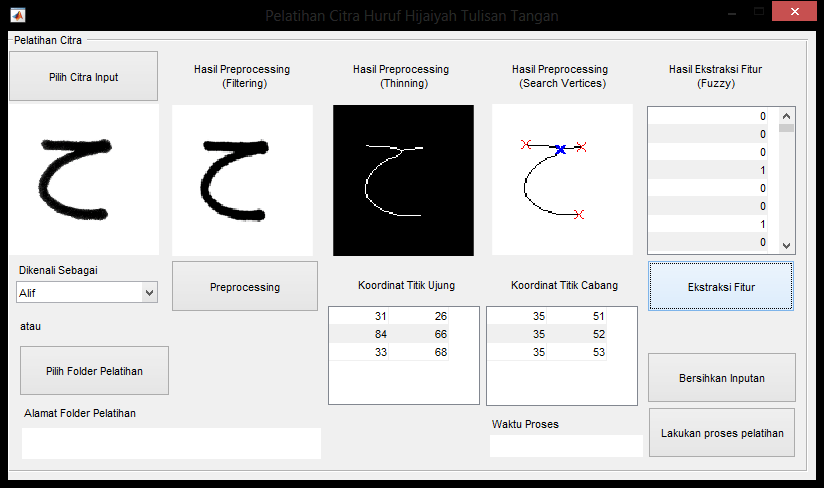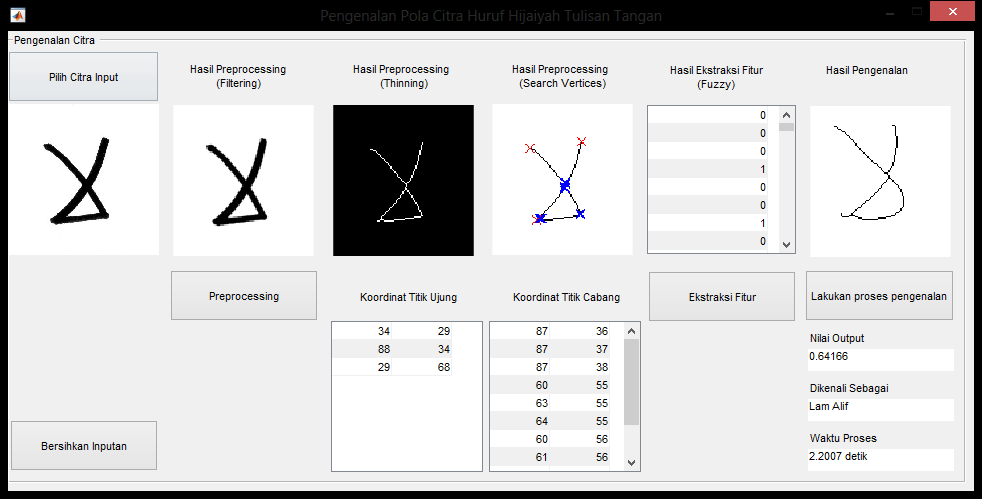 | Ada berbagai data citra tulisan tangan huruf hijaiyah dari berbagai orang. Pada figure Pelatihan, Citra-citra ini akan disimpan ke dalam database sebagai citra latih, dan kemudian dilatih untuk mendapatkan nilai bobot pelatihan. Selanjutnya pada figure Pengujian, akan diinputkan sebuah citra uji yang nantinya akan dihitung nilai outputnya menggunakan nilai bobot dari masing-masing karakter, dan karakter dengan nilai output yang paling mendekati angka 1 akan terpilih sebagai jawaban. Metode yang digunakan adalah metode Fuzzy Feature Extraction dan Back-Propagation. Tutorial dari masing-masing metode dapat dilihat pada link diatas. | |