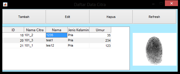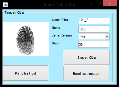 | Ada berbagai data citra sidik yang dapat dijadikan sebagai input. Pada figure Input Data Citra, masing-masing data citra yang terpilih akan disimpan ke dalam database, dan selanjutnya pada figure Pelatihan, data ini akan dilatih untuk mendapatkan nilai bobot pelatihan. Selanjutnya pada figure Pengujian, akan diinputkan sebuah citra uji yang nantinya akan dihitung nilai outputnya menggunakan nilai bobot dari masing-masing sidik jari, dan sidik jari dengan nilai output yang paling mendekati angka 1 akan terpilih sebagai jawaban. Metode yang digunakan adalah metode Minutiae Feature Extraction dan Back-Propagation. Tutorial dari masing-masing metode dapat dilihat pada link diatas. | |