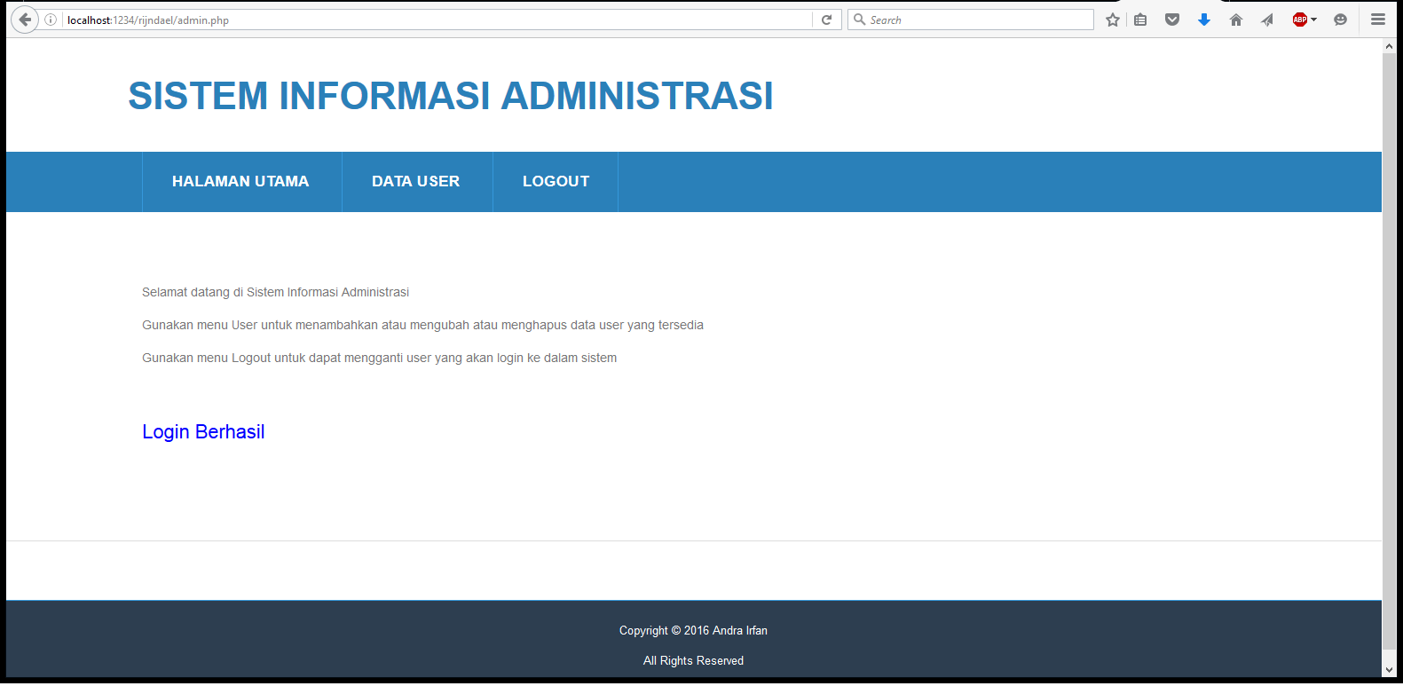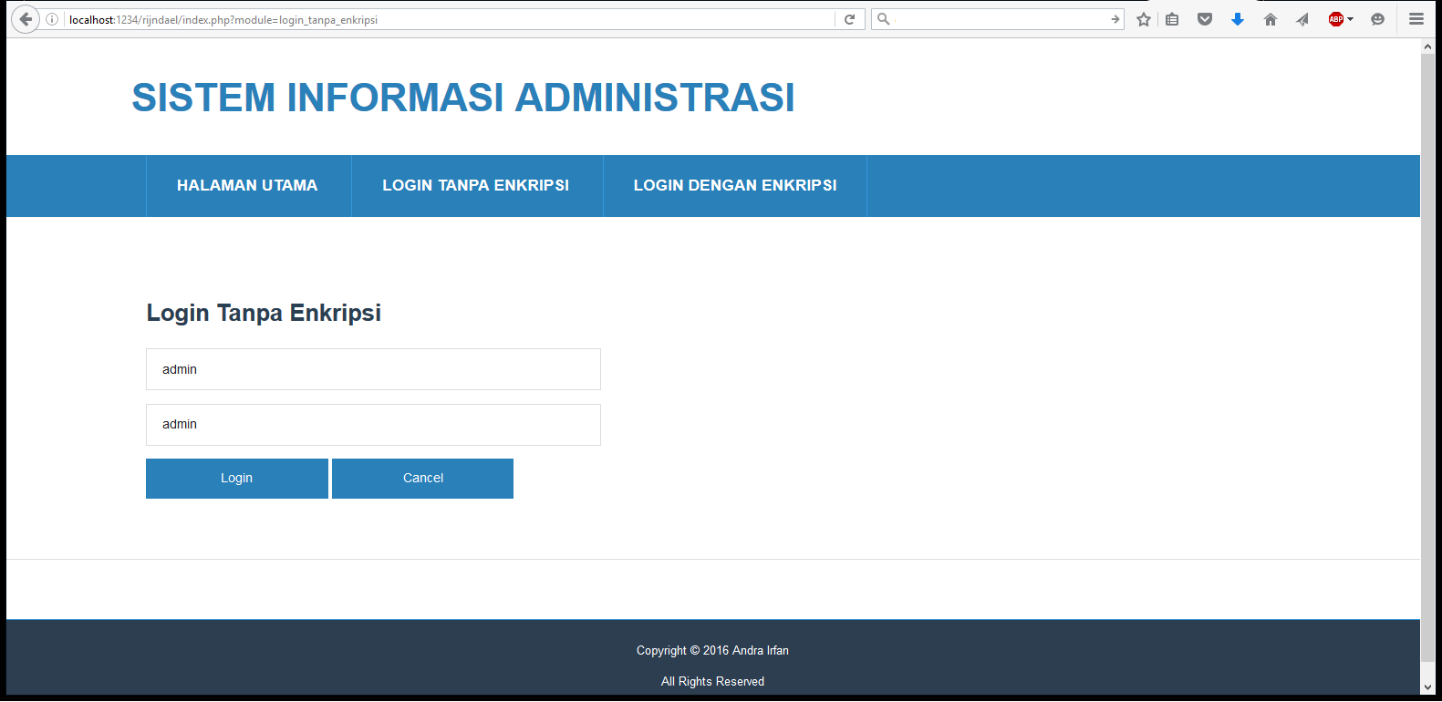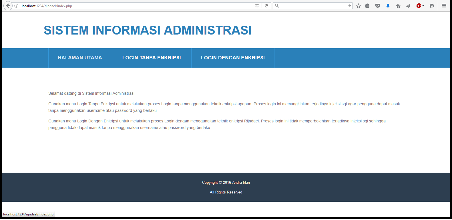 | Fungsi utama dari website ini adalah untuk menerapkan sistem keamanan pada saat pengguna melakukan login. Ada 2 halaman utama sebagai pembanding, yaitu halaman login tanpa enkripsi dan login dengan enkripsi. Pada halaman login tanpa enkripsi tidak ada proses enkripsi yang dilakukan, dan pengguna dapat menggunakan teknik injeksi SQL untuk masuk ke dalam sistem, sedangkan pada halaman login dengan enkripsi ada proses enkripsi yang dilakukan, dan pengguna tidak dapat menggunakan teknik injeksi SQL untuk masuk ke dalam sistem. Metode yang digunakan adalah metode Rijndael. Tutorial metode ini dapat dilihat pada link diatas. | |