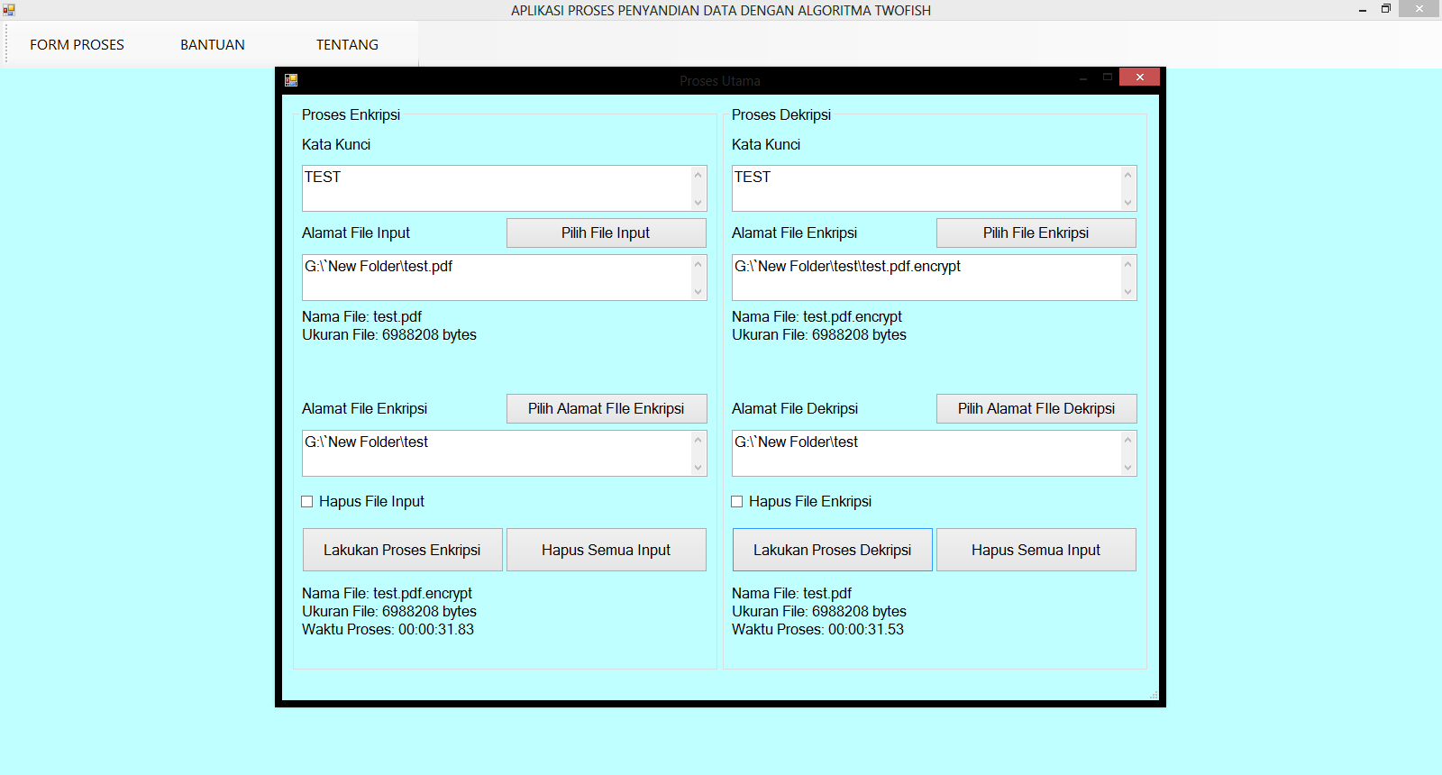 | Fungsi utama dari aplikasi ini adalah untuk melakukan enkripsi terhadap berbagai macam tipe file sehingga isi filenya tidak dapat dibaca lagi kecuali pengguna yang mengetahui kata kunci untuk mendekripsi file tersebut. Jenis tipe file yang diujicoba adalah tipe dokumen teks (.txt), Microsoft Word (.doc/.docx), Microsoft Excel (.xls,.xlsx), Microsoft Powerpoint (.ppt,.pptx), dan PDF (.pdf) Metode yang digunakan adalah metode Twofish. Tutorial metode ini dapat dilihat pada link diatas. | |