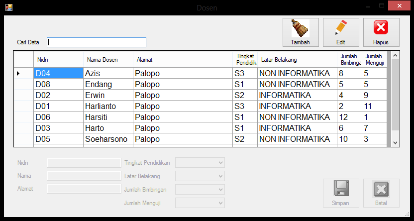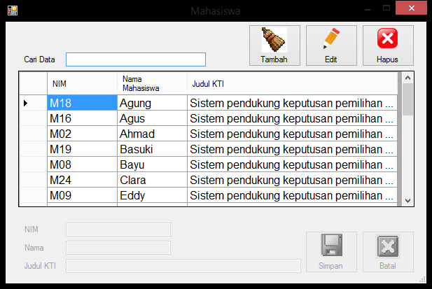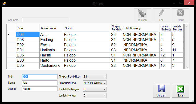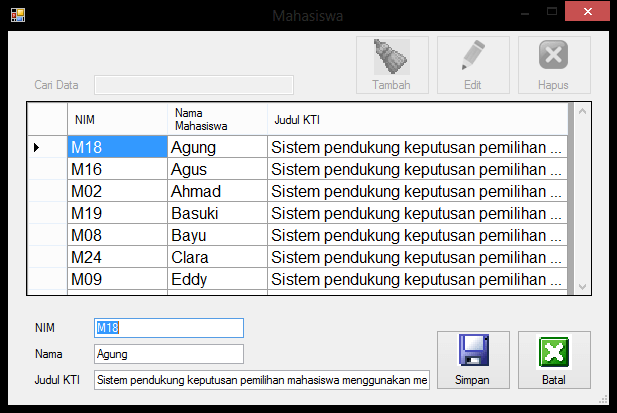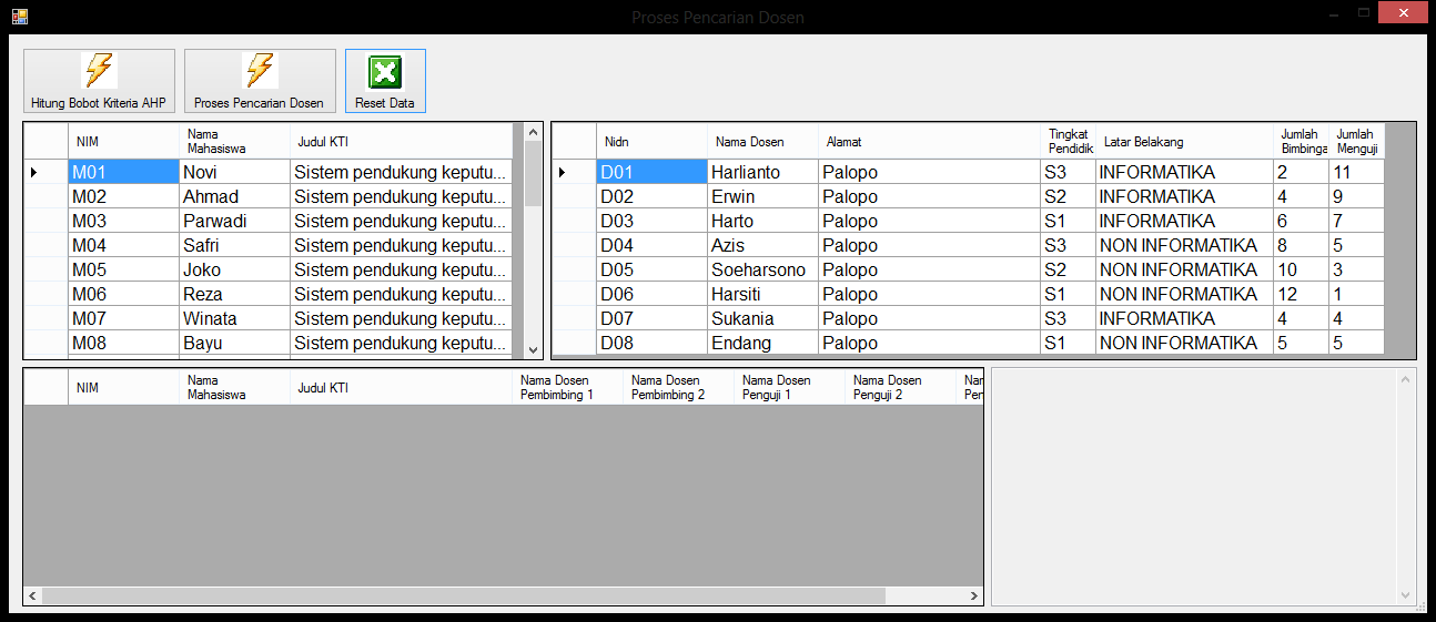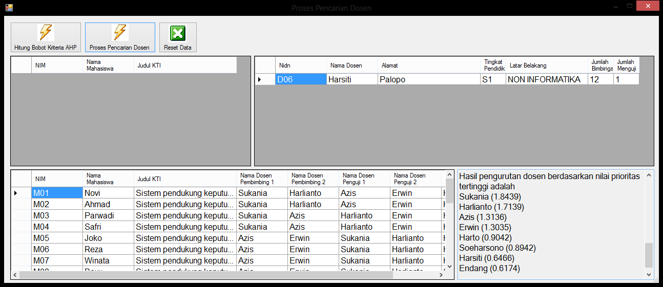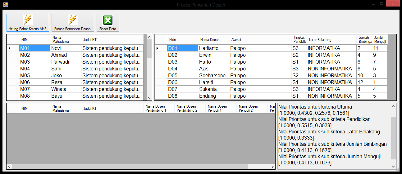 | Fungsi utama aplikasi ini adalah untuk menentukan dosen penguji dan dosen pembimbing dari masing-masing mahasiswa yang sedang menempuh tugas akhir. Setelah menginputkan sekumpulan nama mahasiswa dan nama dosen, maka sistem akan melakukan perhitungan nilai prioritas untuk menentukan dosen mana saja yang didahulukan sebagai dosen pembimbing atau dosen penguji. Jika dosen tersebut terpilih, maka jumlah kuota dosen tersebut akan berkurang, sehingga dosen tersebut tidak selalu terpilih sebagai jawaban. Jika kuota sudah habis, maka dosen tersebut tidak dapat terpilih sebagai dosen pembimbing atau dosen penguji. Metode yang digunakan adalah metode AHP (Analytic Hierarchy Process). Tutorial metode ini dapat dilihat pada link diatas. | |