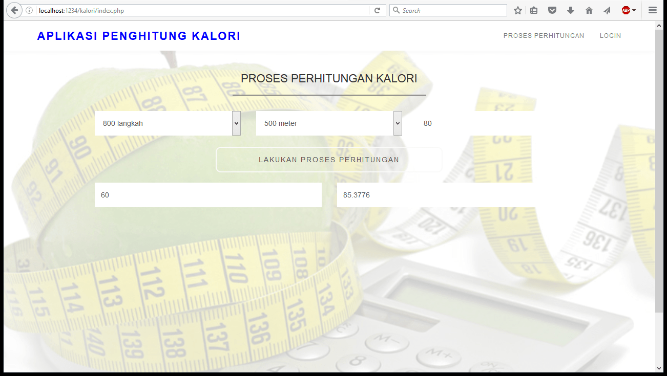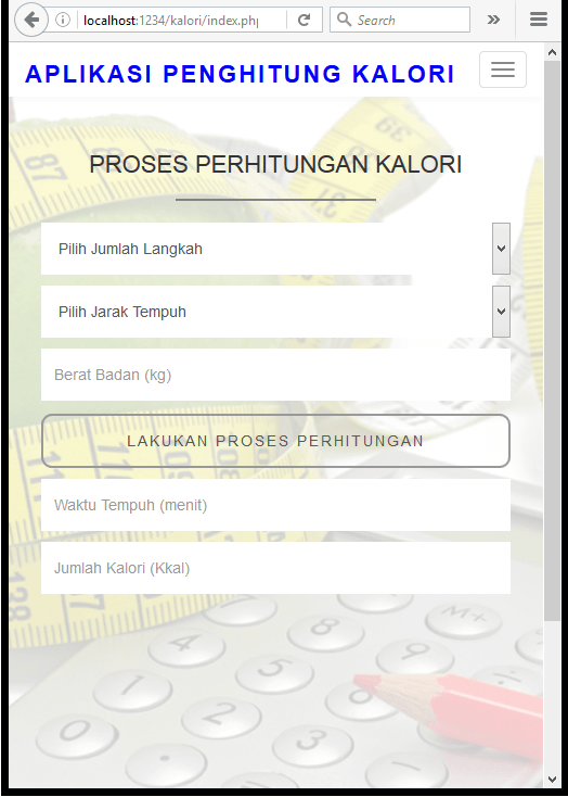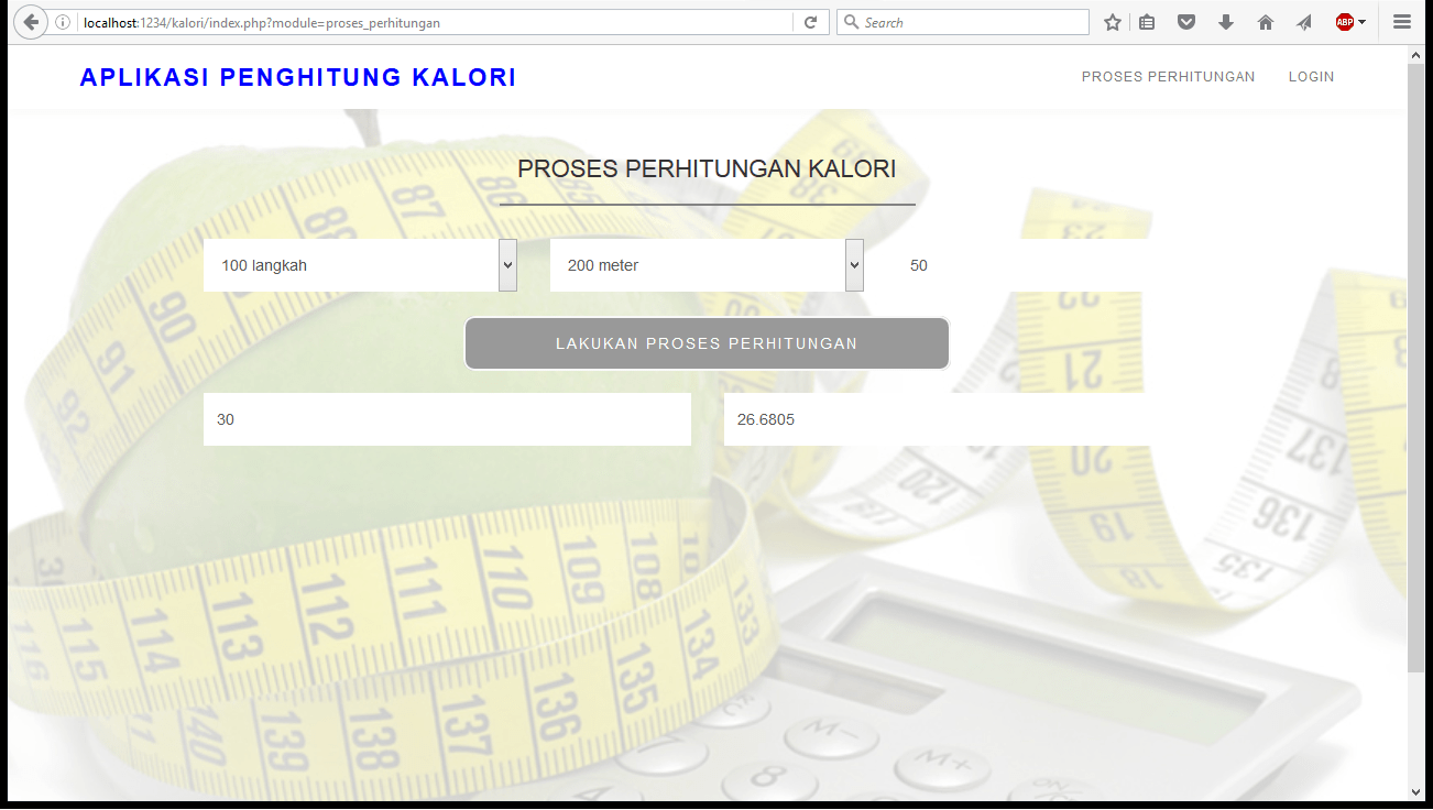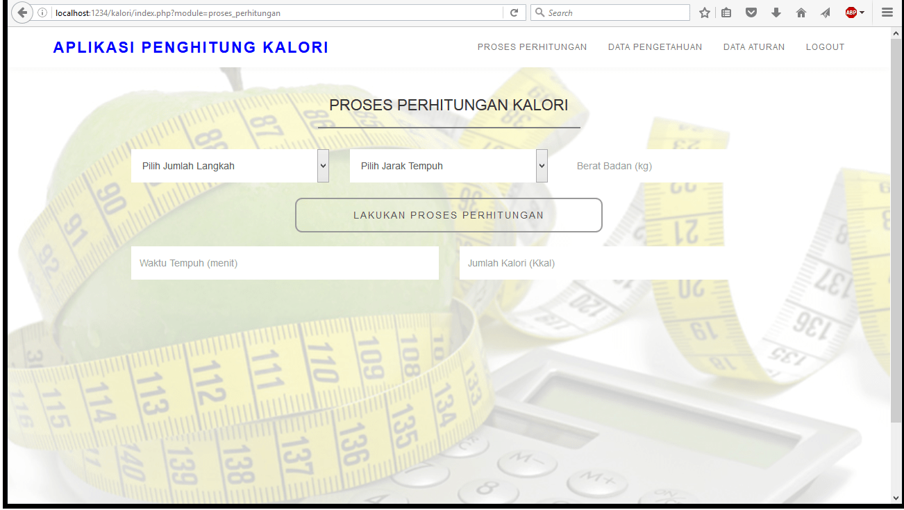 Fungsi utama aplikasi ini adalah untuk menghitung jumlah kalori yang telah dibakar berdasarkan parameter jumlah langkah dan jarak tempuh. Setelah user memberikan input jumlah langkah dan jarak tempuh, maka sistem akan melakukan perhitungan pencarian jarak tempuh dan kemudian melakukan perhitungan jumlah kalori menggunakan rumus