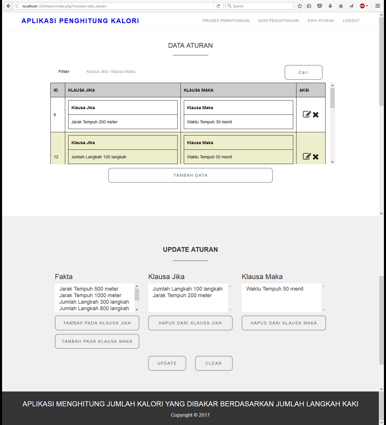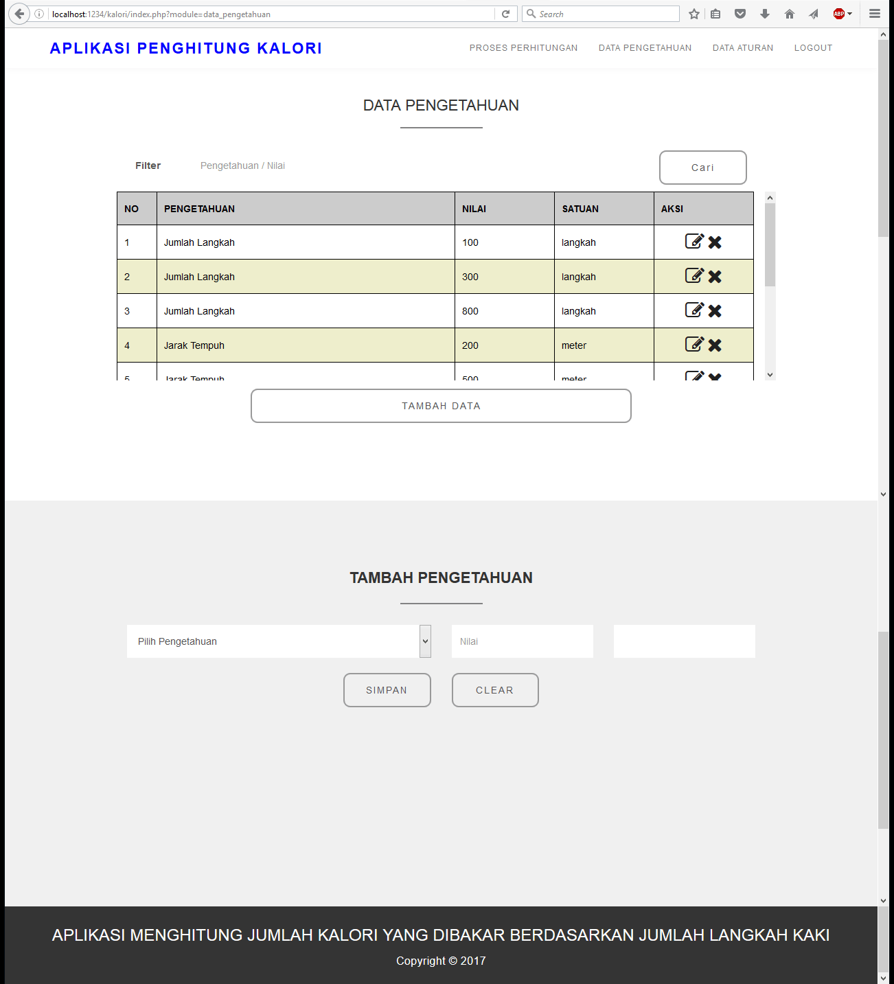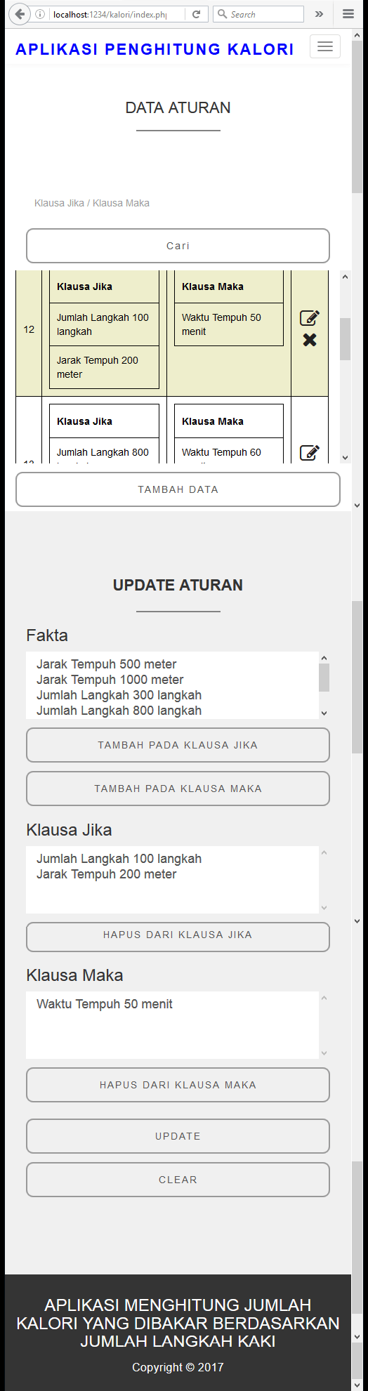 Fungsi utama aplikasi ini adalah untuk menghitung jumlah kalori yang telah dibakar berdasarkan parameter jumlah langkah dan jarak tempuh. Setelah user memberikan input jumlah langkah dan jarak tempuh, maka sistem akan melakukan perhitungan pencarian jarak tempuh dan kemudian melakukan perhitungan jumlah kalori menggunakan rumus