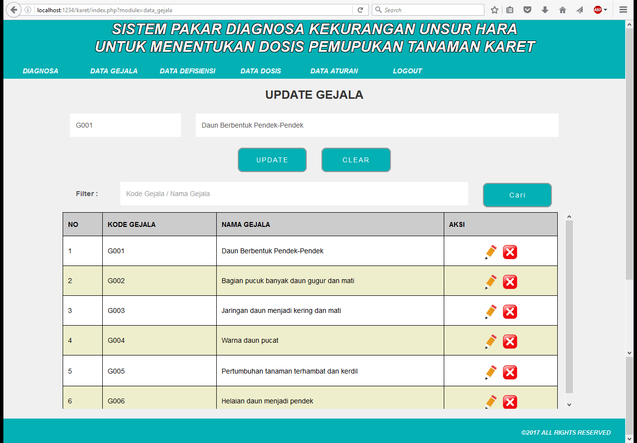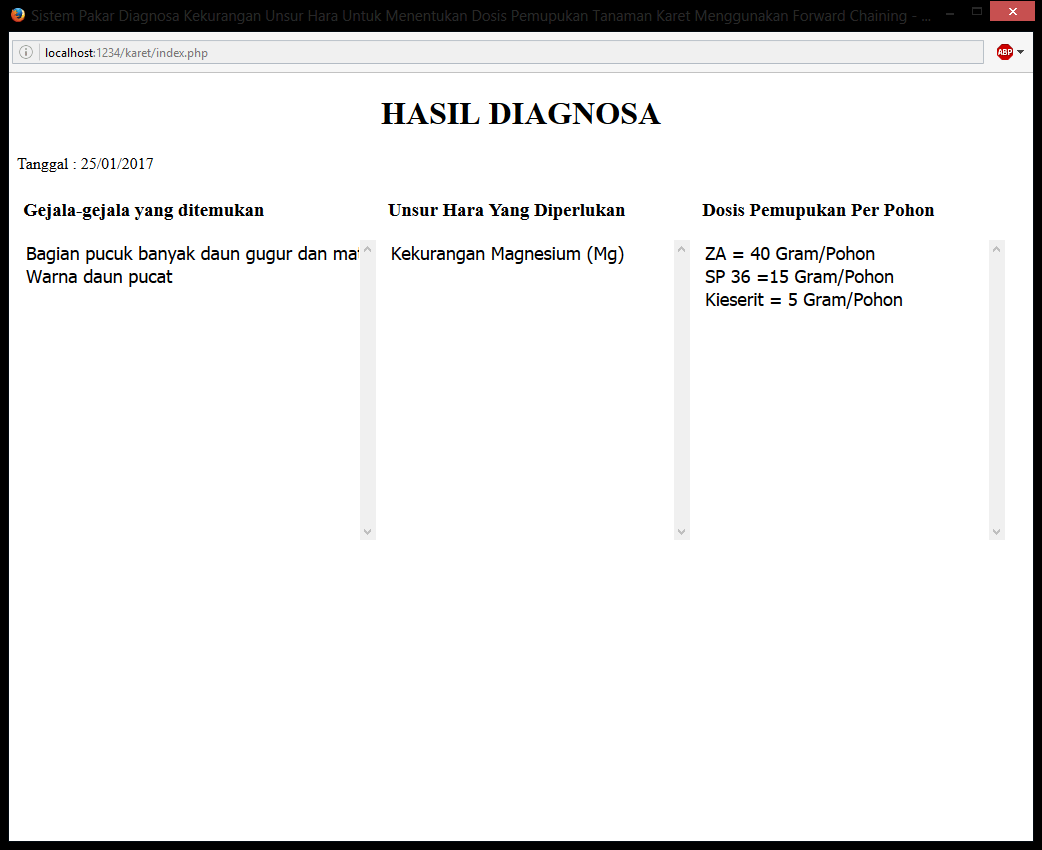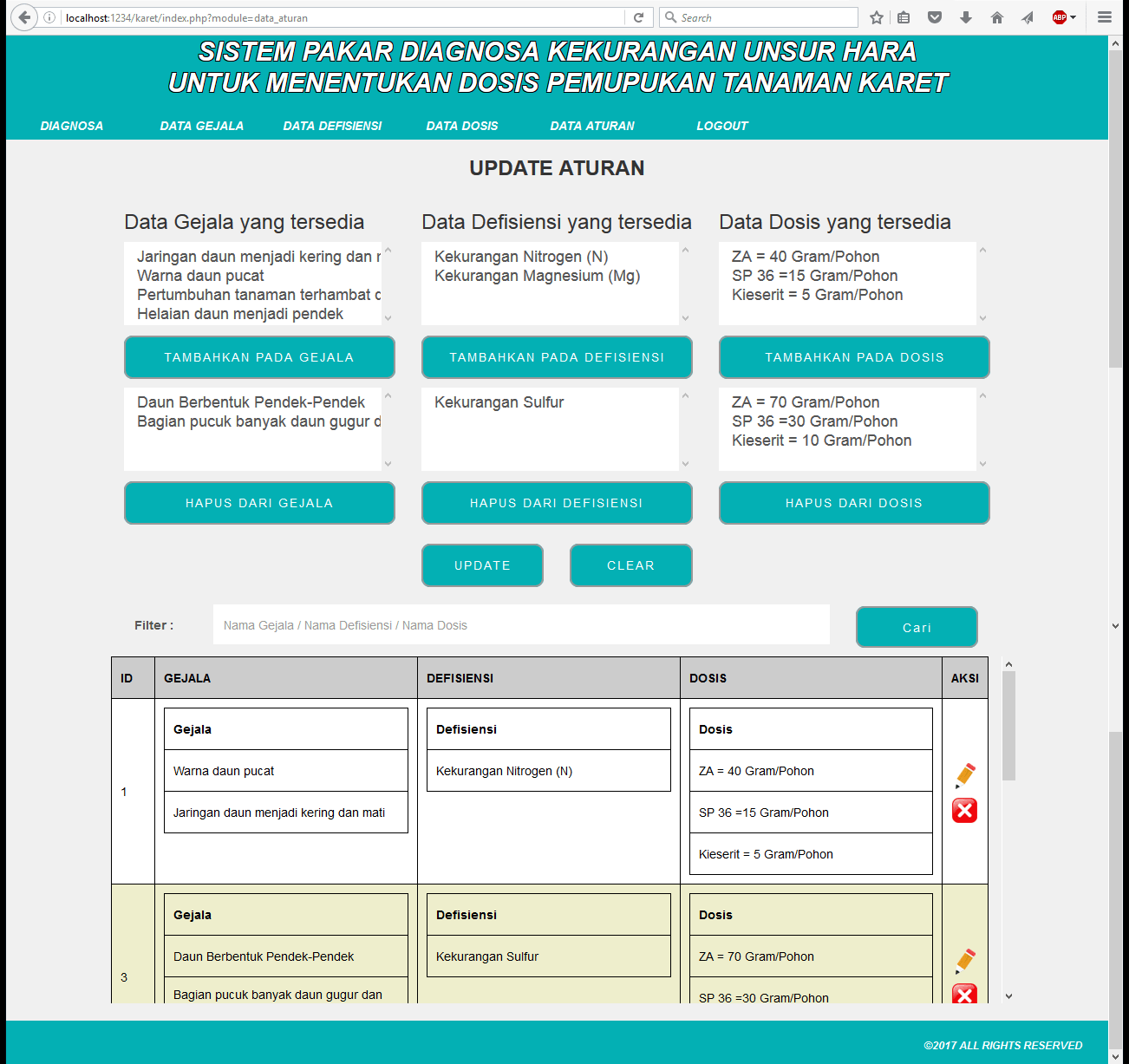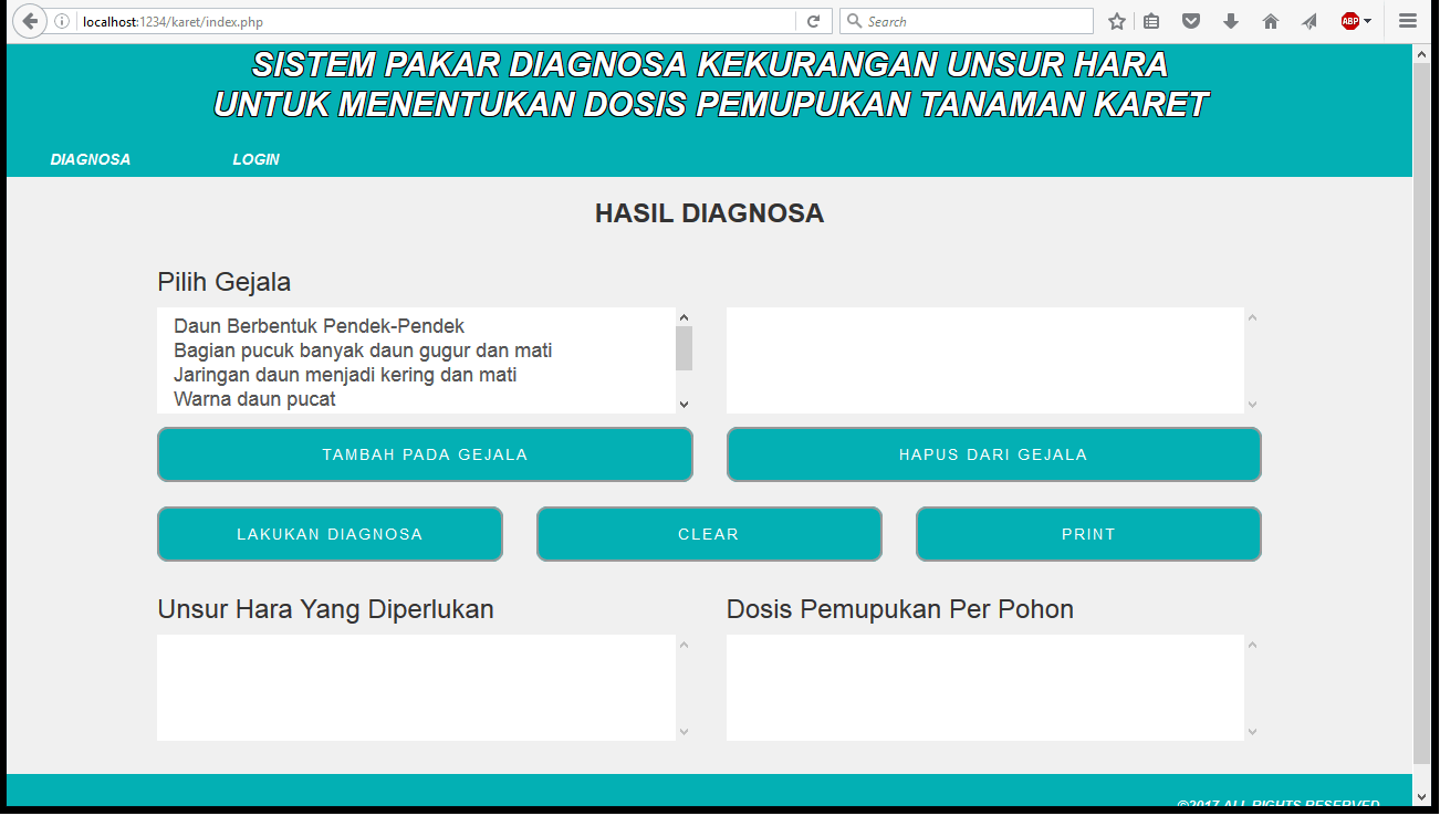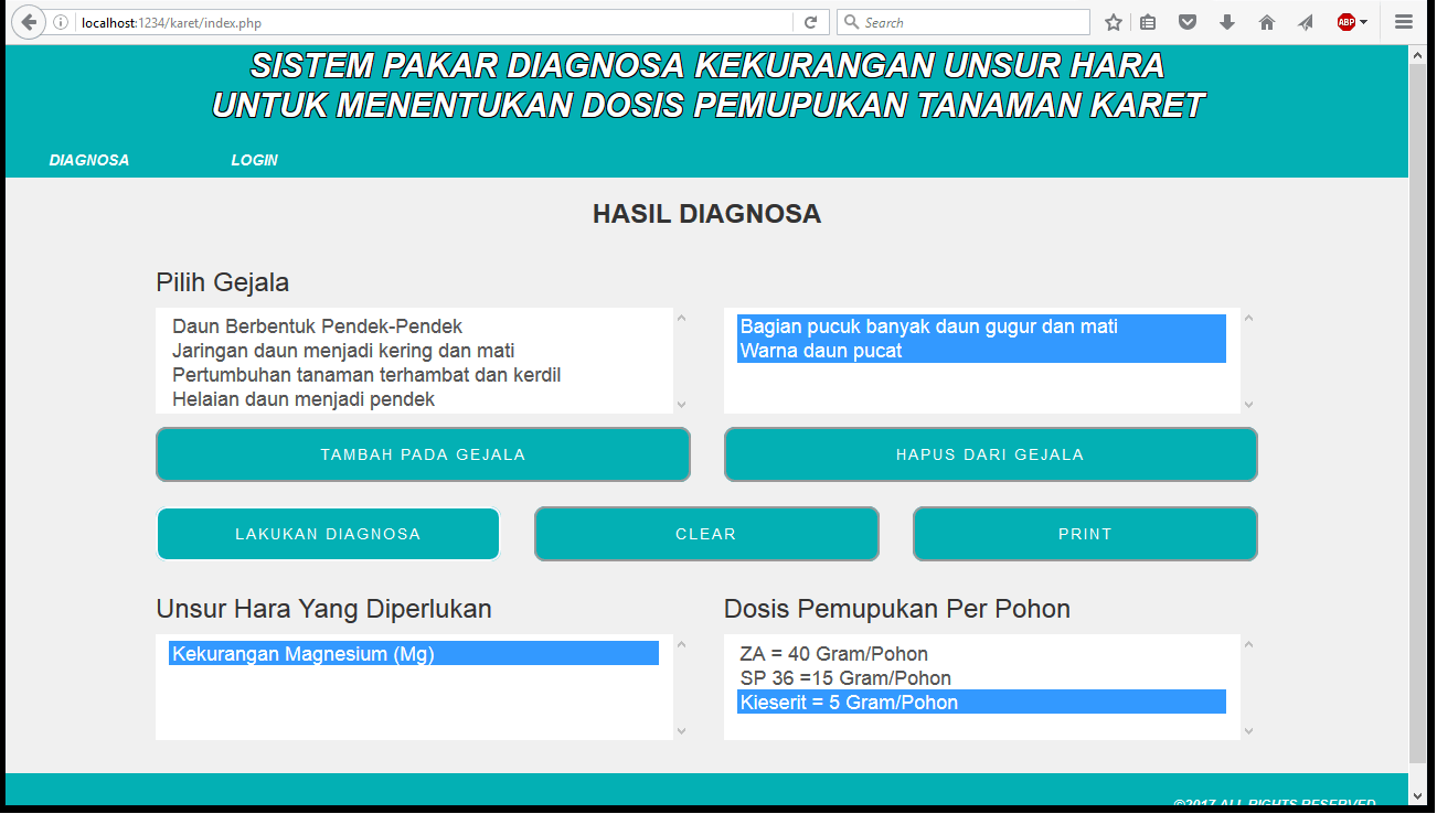 | Fungsi utama aplikasi ini adalah untuk melakukan diagnosa kekurangan unsur hara pada tanaman karet berdasarkan gejala-gejala yang diinputkan oleh user. Setelah user menginputkan gejala-gejala yang timbul, maka sistem akan melakukan perhitungan menggunakan input gejala tersebut dan kemudian menemukan kesimpulan diagnosa, yaitu kekurangan unsur hara beserta dosis pemupukan yang diperlukan. Hasil diagnosa ini kemudian dapat dicetak apabila diperlukan. Metode yang digunakan adalah metode Forward Chaining. Tutorial metode ini dapat dilihat pada link diatas. | |