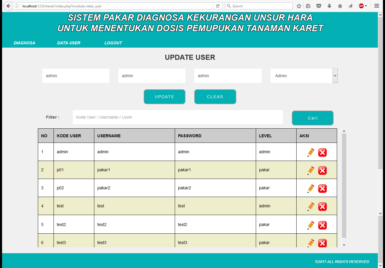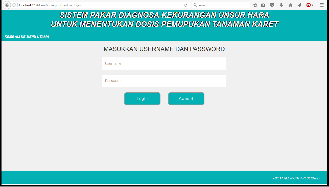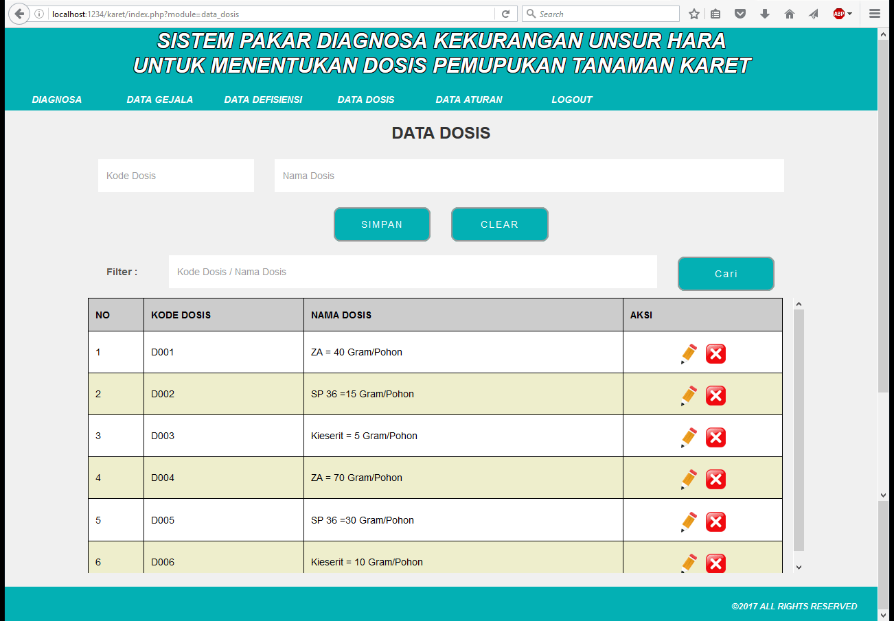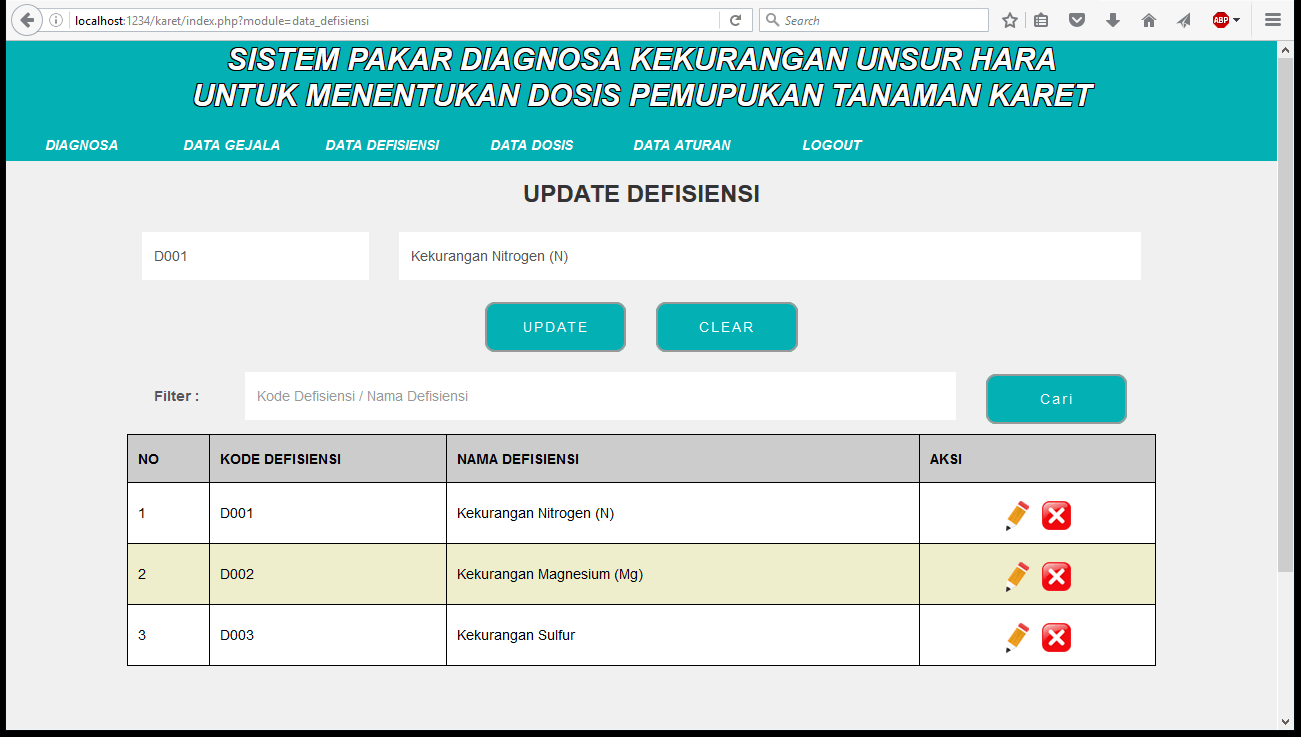 | Fungsi utama aplikasi ini adalah untuk melakukan diagnosa kekurangan unsur hara pada tanaman karet berdasarkan gejala-gejala yang diinputkan oleh user. Setelah user menginputkan gejala-gejala yang timbul, maka sistem akan melakukan perhitungan menggunakan input gejala tersebut dan kemudian menemukan kesimpulan diagnosa, yaitu kekurangan unsur hara beserta dosis pemupukan yang diperlukan. Hasil diagnosa ini kemudian dapat dicetak apabila diperlukan. Metode yang digunakan adalah metode Forward Chaining. Tutorial metode ini dapat dilihat pada link diatas. | |