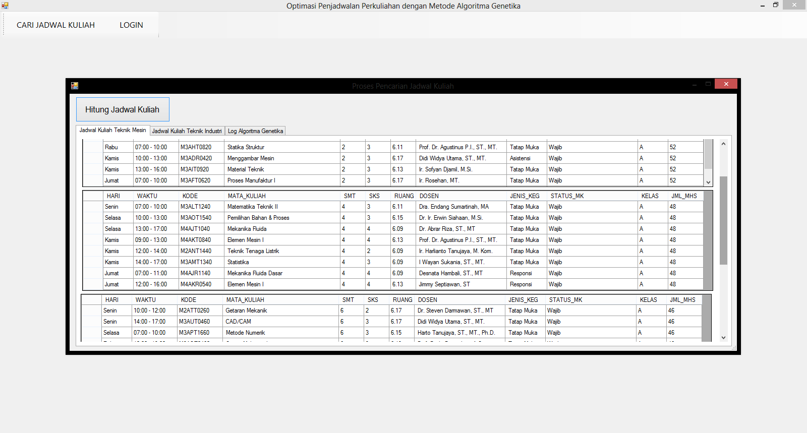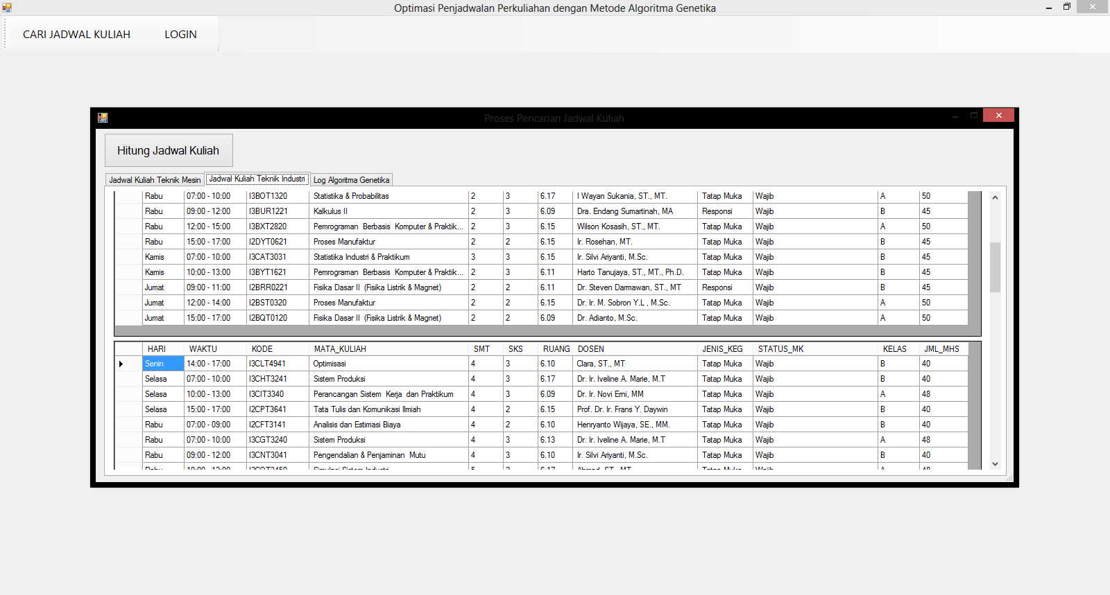 | Fungsi utama aplikasi ini adalah untuk menemukan jadwal mata kuliah dengan batasan inputan mata kuliah, dosen, dan tabel ajar. Ada sejumlah inputan mata kuliah, nama dosen, ruangan yang dapat dipakai, dan tabel ajar yang berisi data seperti jenis kegiatan, status mata kuliah, semester, kelas, dan jumlah kuota mahasiswa yang diperbolehkan. Dengan banyaknya parameter dan berbagai batasan yang tersedia, maka sistem kemudian akan menghitung dan mencari jadwal kuliah yang valid dan memenuhi semua syarat. Normalnya, dalam sekali proses perhitungan akan diperoleh 1 jadwal kuliah dengan total sks paling banyak dan tidak ada mata kuliah yang kembar; akan tetapi pada aplikasi ini diperlukan 2 jadwal kuliah, sehingga diperlukan batasan tambahan bahwa antara jadwal pertama dan kedua, tidak ada beberapa parameter yang bentrok pada waktu yang sama. Metode yang digunakan adalah metode Algoritma Genetika. Tutorial metode ini dapat dilihat pada link diatas. | |
