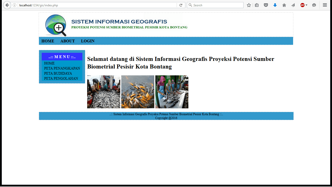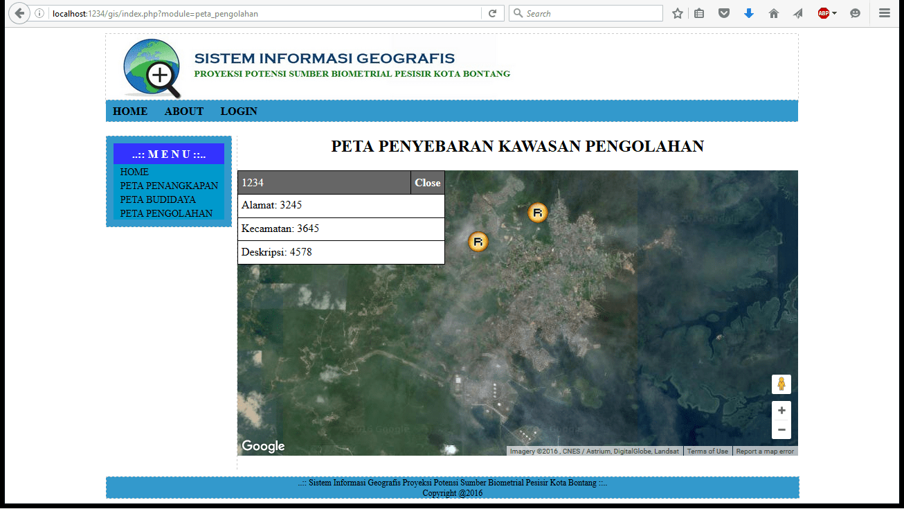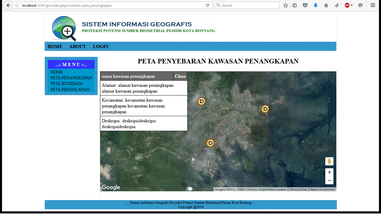 | Proyek ini hanya dikerjakan dalam 2 hari karena hanya merupakan pembetulan dari contoh website yang telah tersedia. Fungsi utama dari website ini adalah untuk menampilkan koordinat pada google map. Ada 3 kategori yang digunakan, yaitu peta penangkapan, peta budidaya, dan peta pengolahan. Jika salah satu peta diakses, maka sistem kemudian akan menampilkan google map dengan marker tertentu pada semua koordinat sesuai data yang telah disimpan sebelumnya. Admin yang login ke dalam sistem dapat melakukan manipulasi data penangkapan, budidaya, dan pengolahan. | |