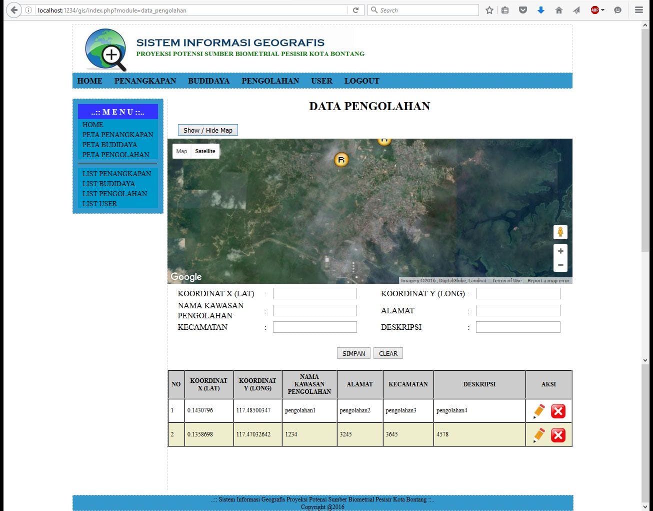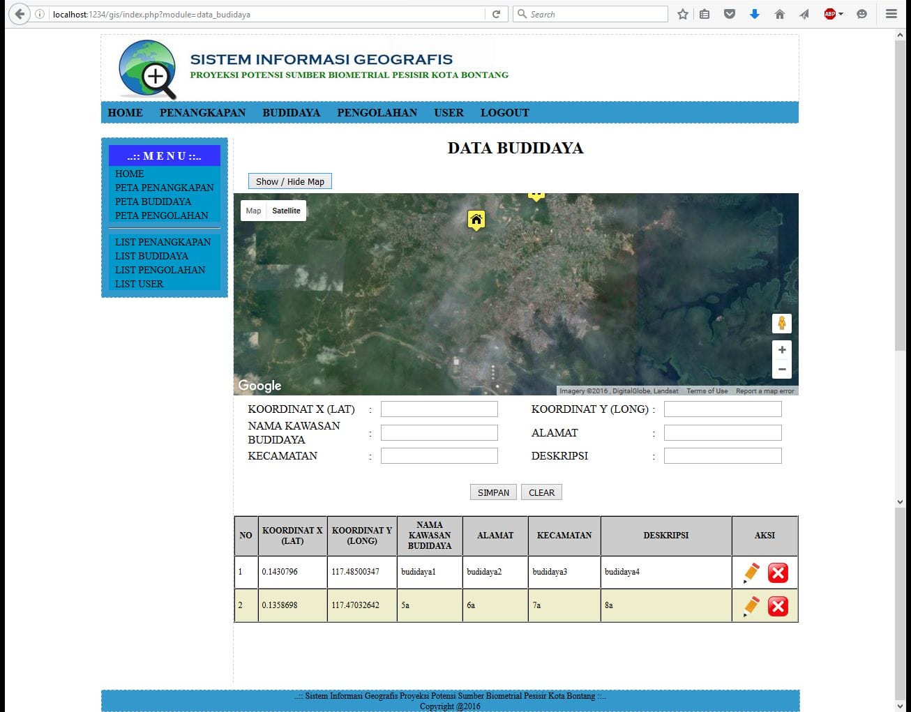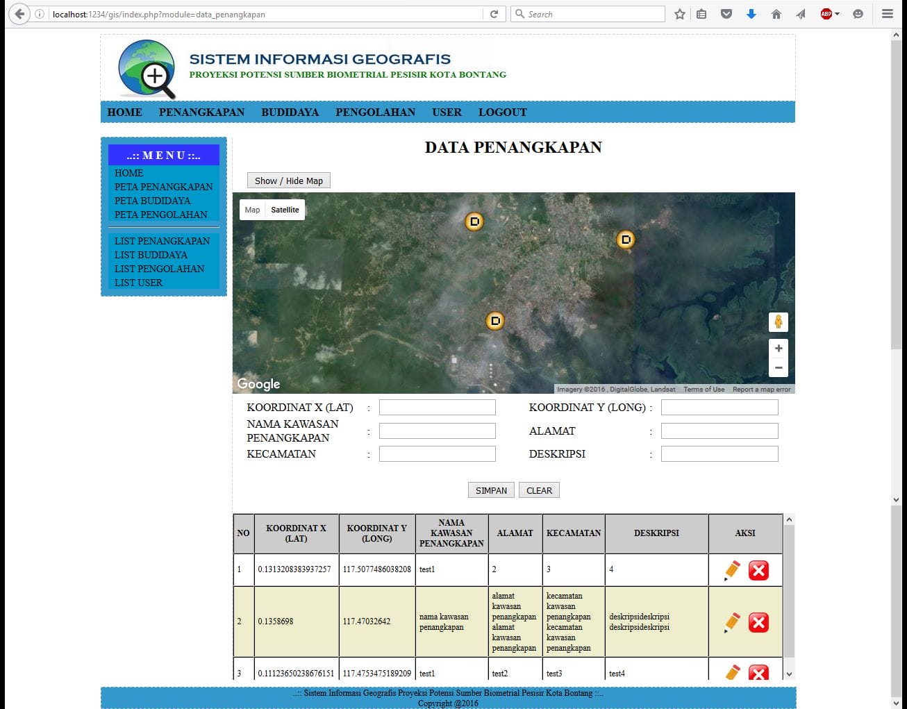 | Proyek ini hanya dikerjakan dalam 2 hari karena hanya merupakan pembetulan dari contoh website yang telah tersedia. Fungsi utama dari website ini adalah untuk menampilkan koordinat pada google map. Ada 3 kategori yang digunakan, yaitu peta penangkapan, peta budidaya, dan peta pengolahan. Jika salah satu peta diakses, maka sistem kemudian akan menampilkan google map dengan marker tertentu pada semua koordinat sesuai data yang telah disimpan sebelumnya. Admin yang login ke dalam sistem dapat melakukan manipulasi data penangkapan, budidaya, dan pengolahan. | |