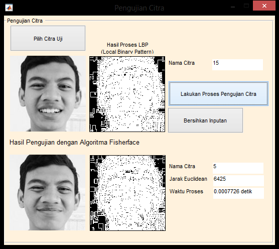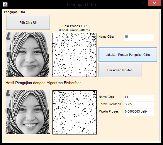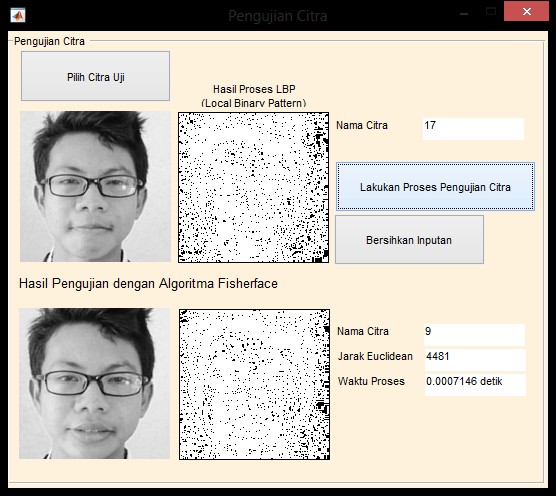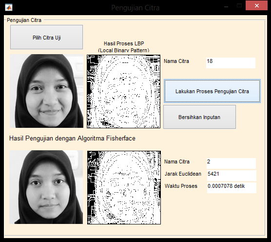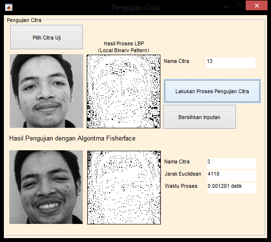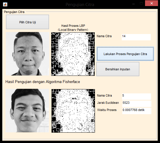 | Ada berbagai data wajah yang dapat dijadikan sebagai input. Pada figure Input Data Citra, masing-masing data citra yang terpilih akan disimpan ke dalam database, dan selanjutnya dapat dilakukan proses pelatihan menggunakan kedua algoritma untuk mendapatkan beberapa parameter nilai output yang disimpan ke dalam database. Selanjutnya pada figure Pengujian, akan diinputkan sebuah citra uji yang nantinya akan dihitung nilai outputnya. Nilai output ini kemudian akan dibandingkan pada semua nilai output yang telah disimpan dalam database, dan nilai citra input yang paling mendekati akan terpilih sebagai jawaban. Metode yang digunakan adalah metode LBP (Local Binary Pattern) dan Fisherface. Tutorial dari masing-masing metode dapat dilihat pada link diatas. | |
