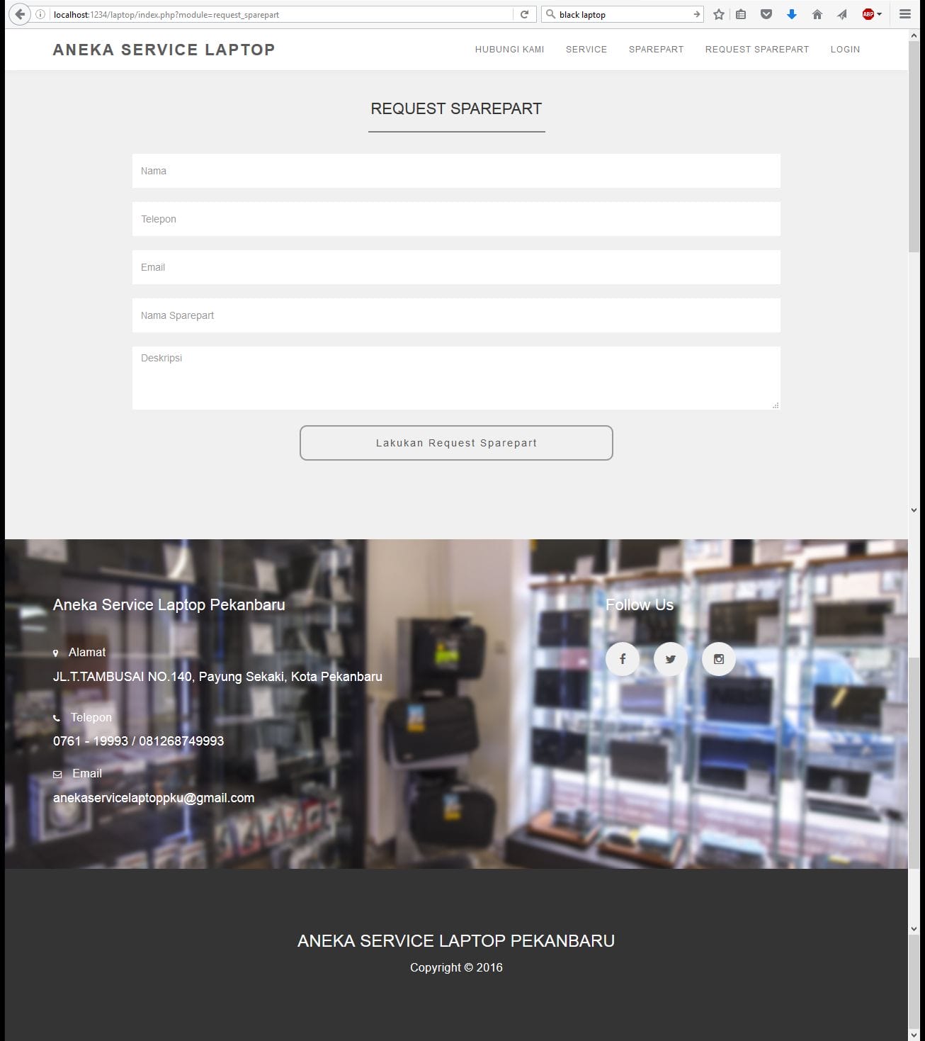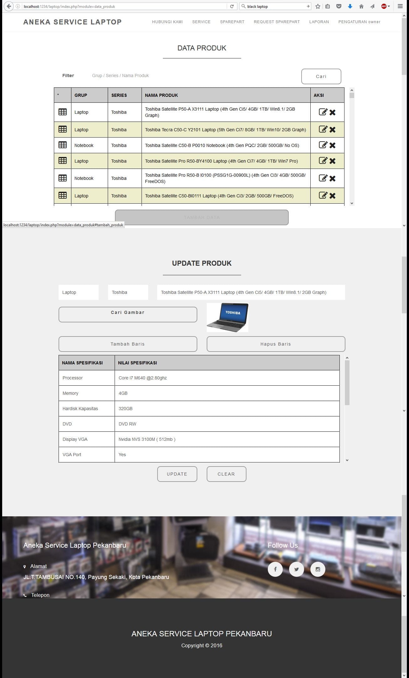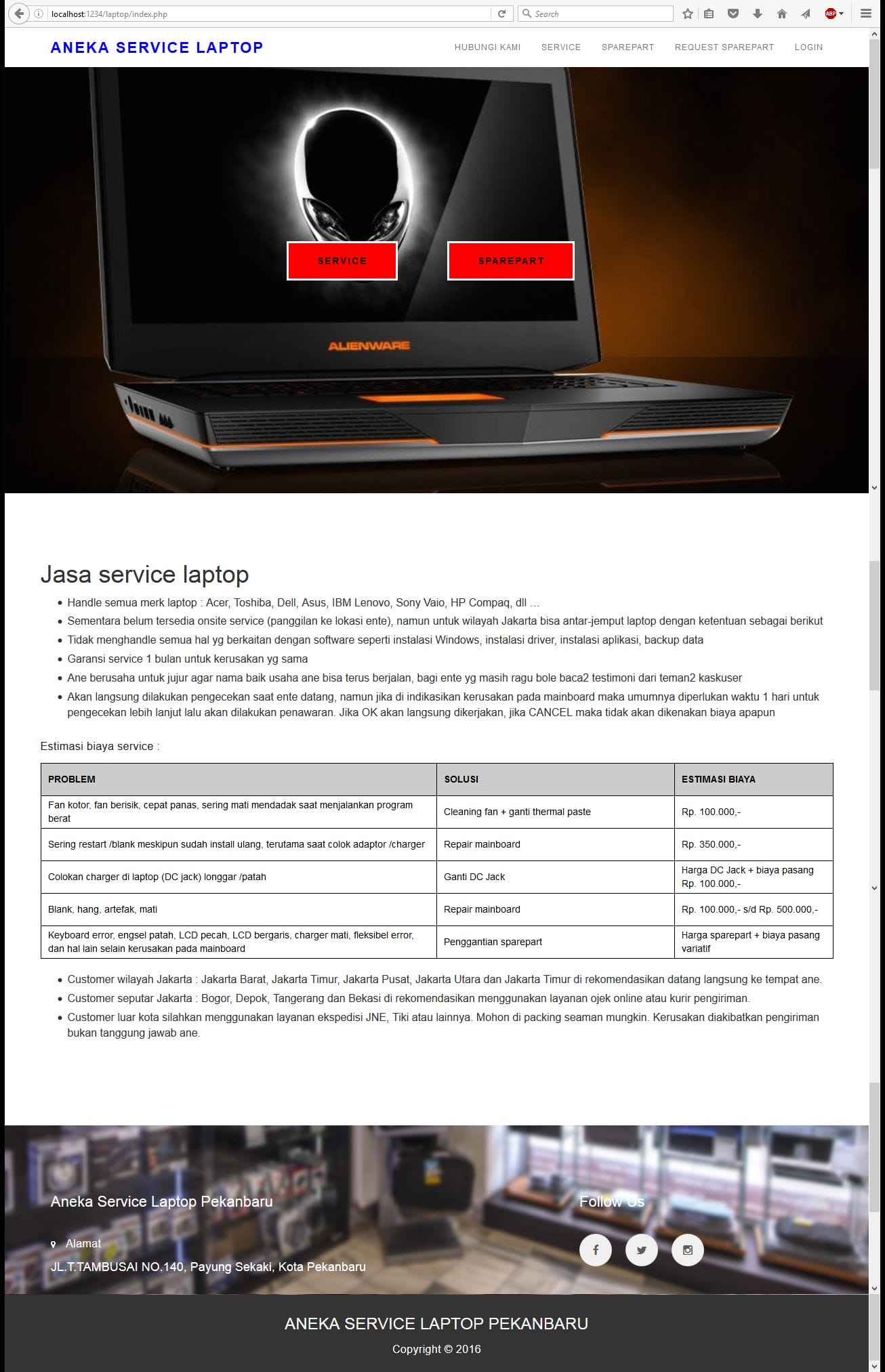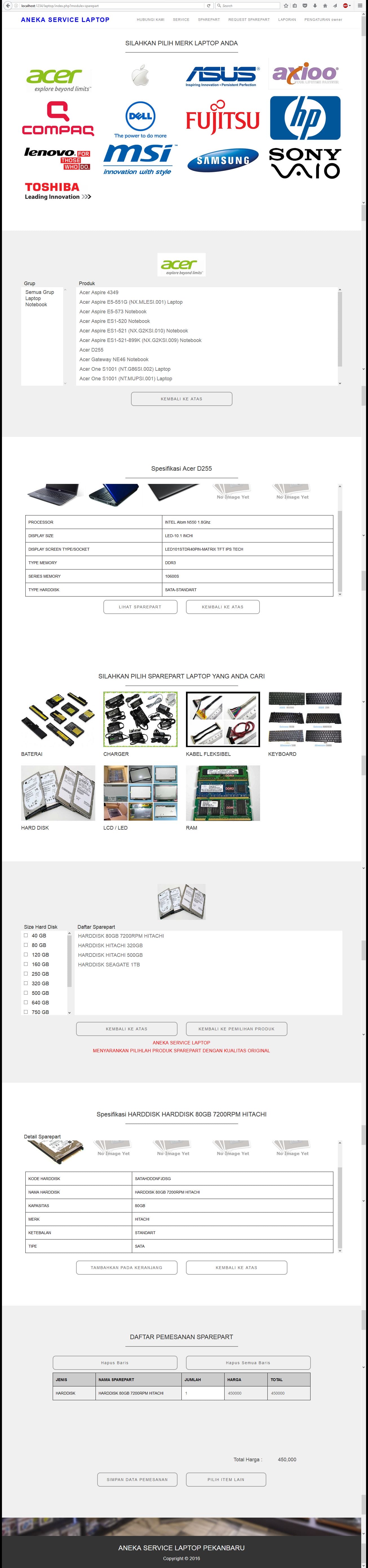 | Website ini mirip seperti toko online, yaitu menyediakan jasa pemesanan service laptop dan penjualan sparepart laptop, tetapi fungsi yang lebih diutamakan adalah fungsi penjualan sparepart laptop. User akan dimudahkan dalam tata cara pemilihan sparepart yang sesuai dengan jenis laptop yang telah diinputkan, dan kemudian sistem akan melakukan penyimpanan terhadap data pemesanan sparepart tersebut. User yang sudah login kemudian dapat mengecek status pemesanan barang yang sudah dilakukan, dan kemudian melakukan komunikasi kepada customer service untuk melakukan pembayaran. Setelah mendapat konfirmasi pembayaran, maka sistem akan menandai bahwa transaksi tersebut telah selesai dilunasi dan kemudian sparepart akan dikirim kepada customer. Apabila sparepart tidak ditemukan, maka user dapat mengirimkan pengajuan sparepart dengan mengisi data pada form yang sudah disediakan. Admin yang login ke dalam sistem dapat melakukan manipulasi data laptop, data sparepart, data user, dan dapat melakukan penambahan stok pada sparepart. Admin juga dapat melihat laporan pemesanan, laporan penjualan, laporan stok, dan laporan request sparepart. | |