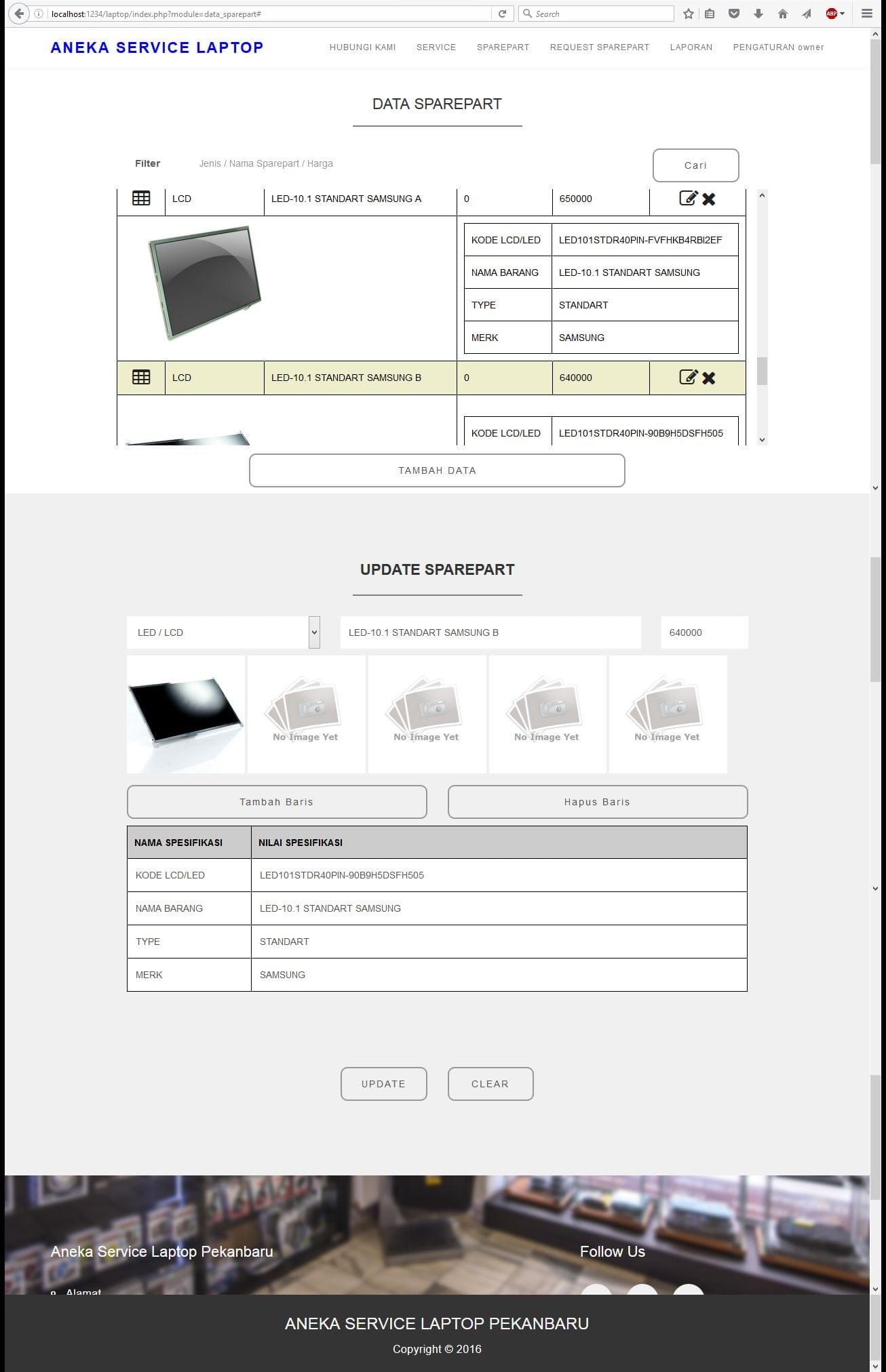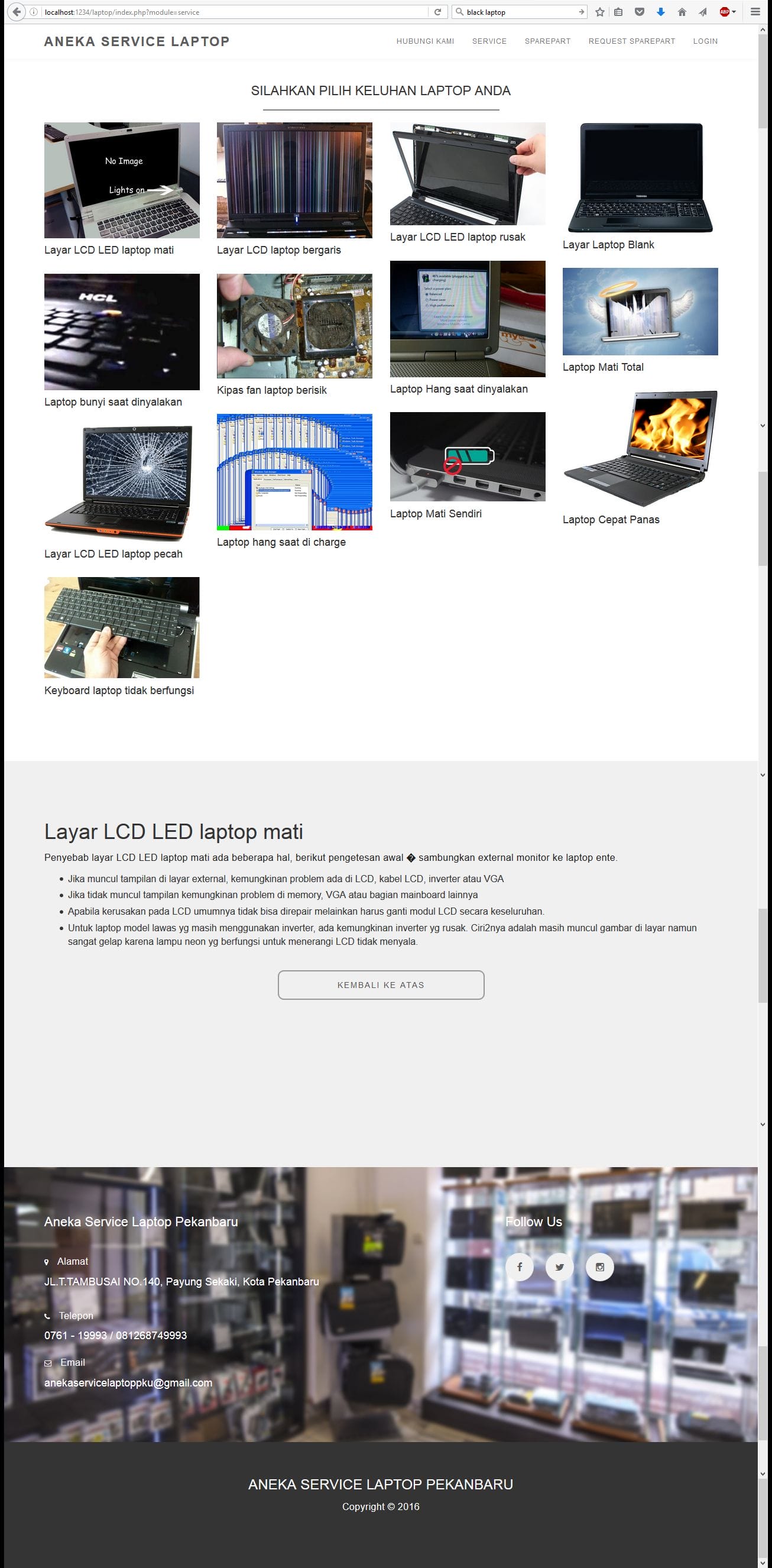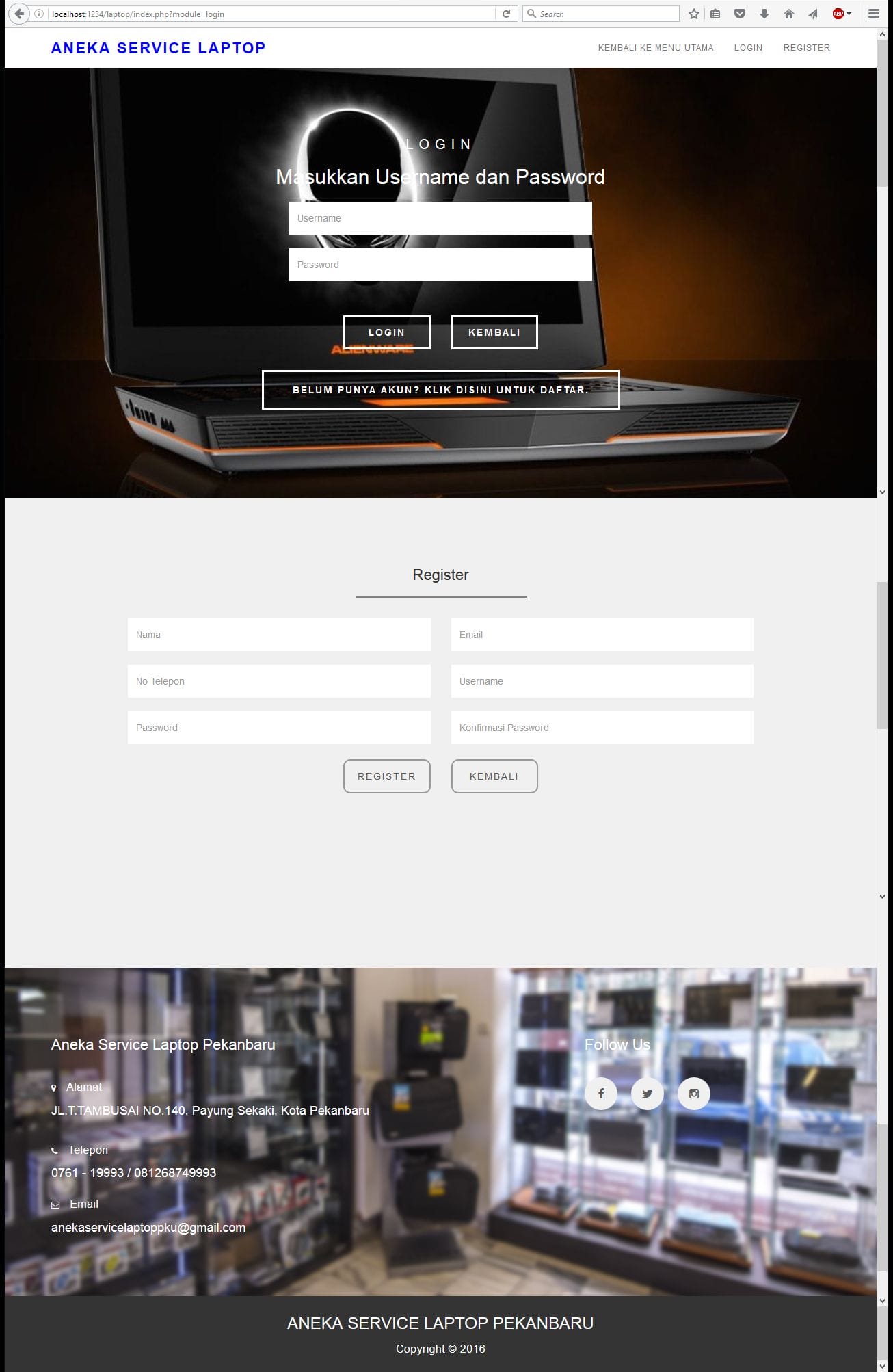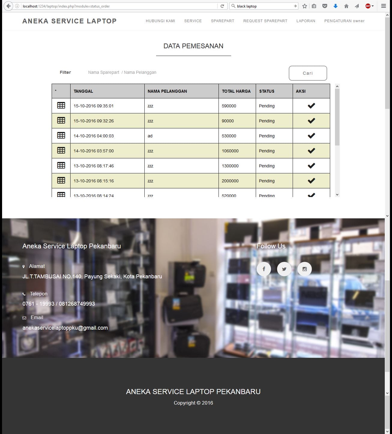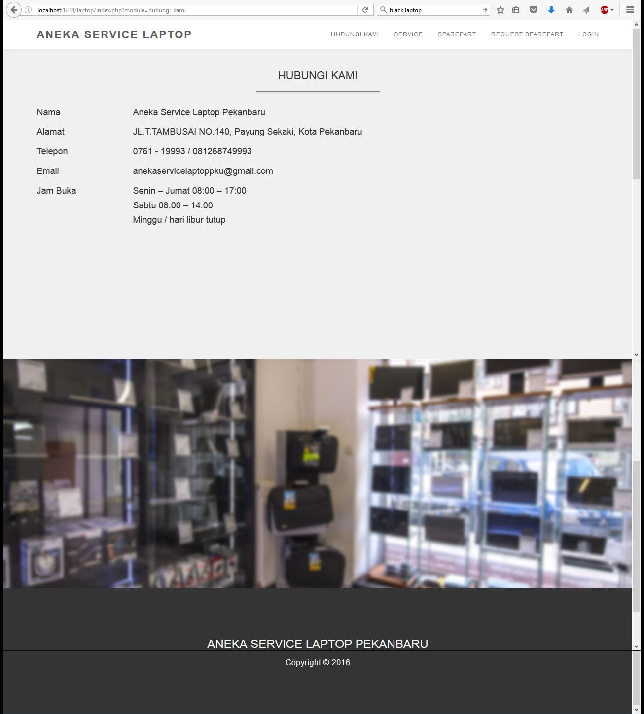 | Website ini mirip seperti toko online, yaitu menyediakan jasa pemesanan service laptop dan penjualan sparepart laptop, tetapi fungsi yang lebih diutamakan adalah fungsi penjualan sparepart laptop. User akan dimudahkan dalam tata cara pemilihan sparepart yang sesuai dengan jenis laptop yang telah diinputkan, dan kemudian sistem akan melakukan penyimpanan terhadap data pemesanan sparepart tersebut. User yang sudah login kemudian dapat mengecek status pemesanan barang yang sudah dilakukan, dan kemudian melakukan komunikasi kepada customer service untuk melakukan pembayaran. Setelah mendapat konfirmasi pembayaran, maka sistem akan menandai bahwa transaksi tersebut telah selesai dilunasi dan kemudian sparepart akan dikirim kepada customer. Apabila sparepart tidak ditemukan, maka user dapat mengirimkan pengajuan sparepart dengan mengisi data pada form yang sudah disediakan. Admin yang login ke dalam sistem dapat melakukan manipulasi data laptop, data sparepart, data user, dan dapat melakukan penambahan stok pada sparepart. Admin juga dapat melihat laporan pemesanan, laporan penjualan, laporan stok, dan laporan request sparepart. | |