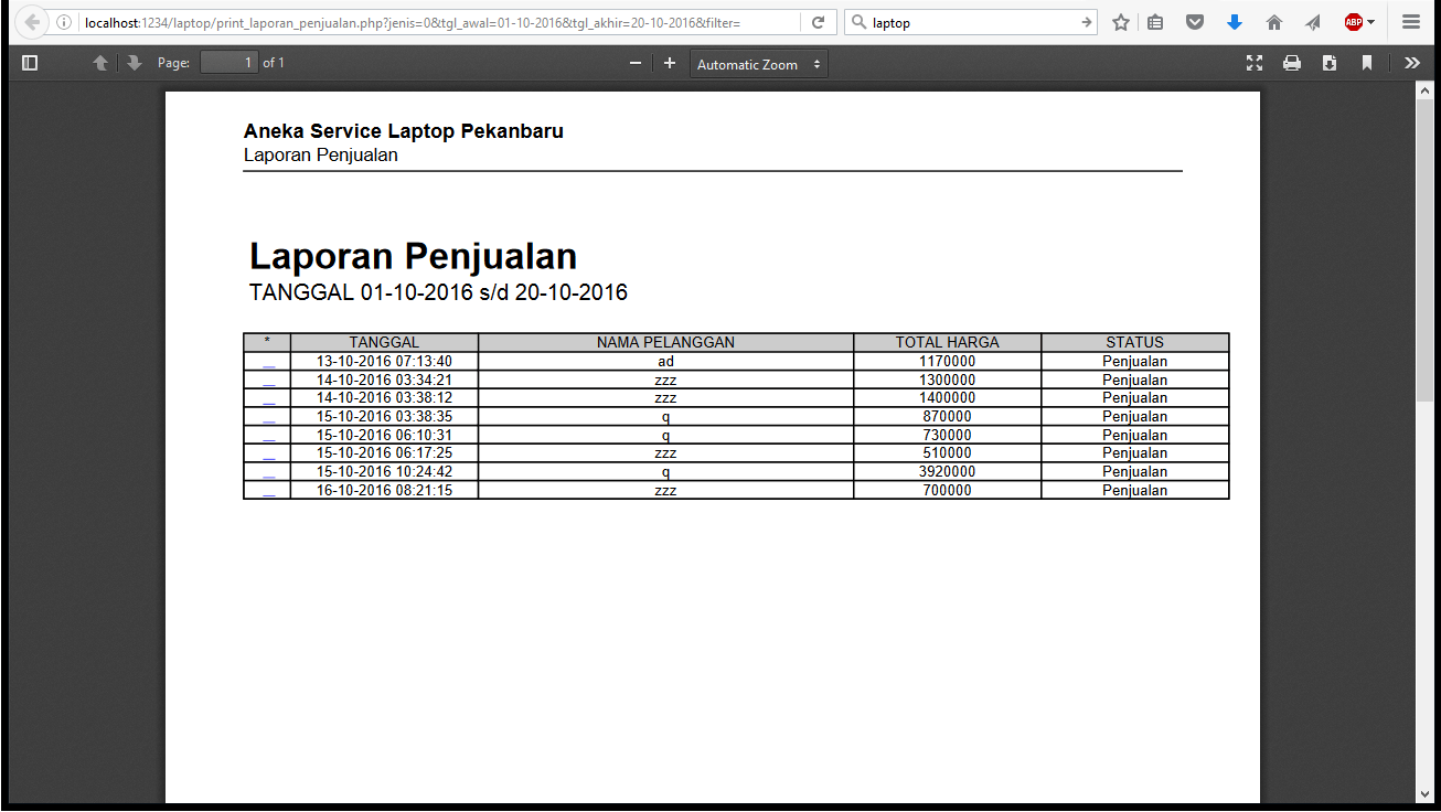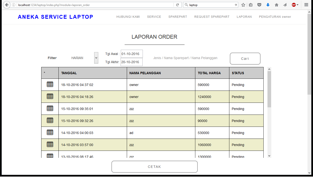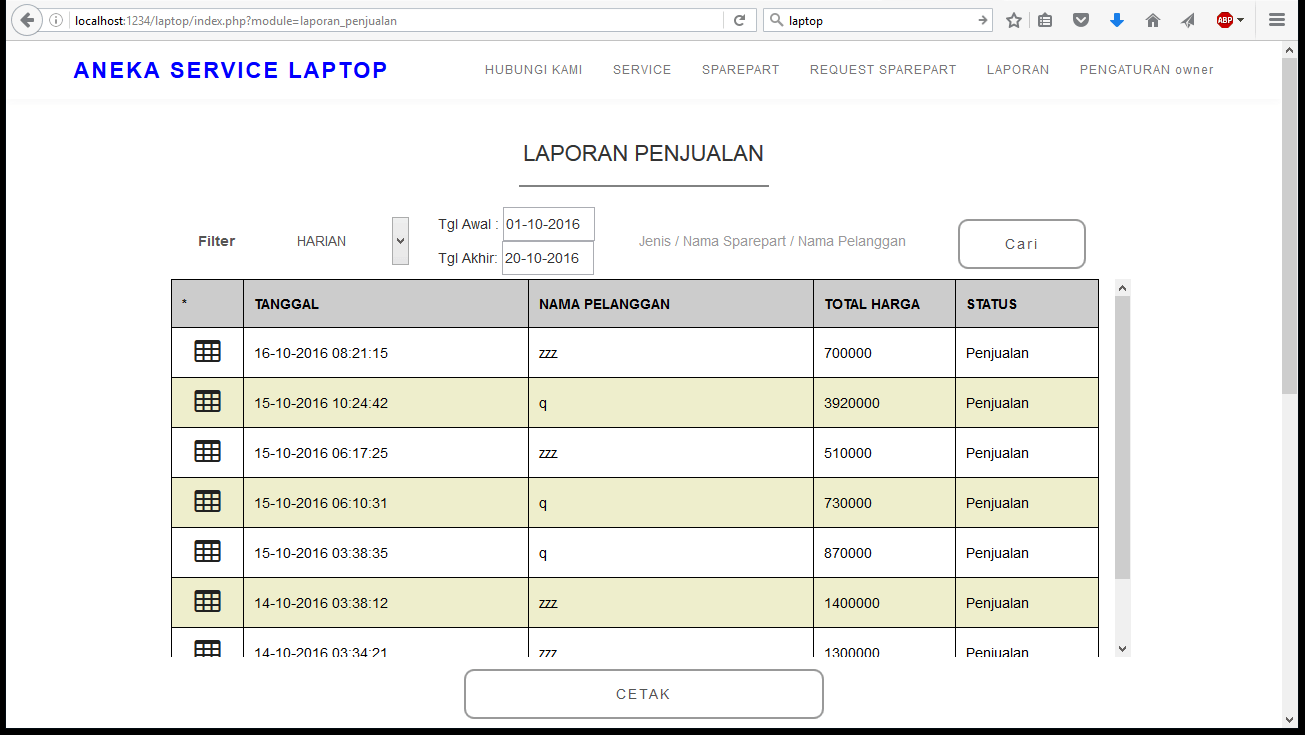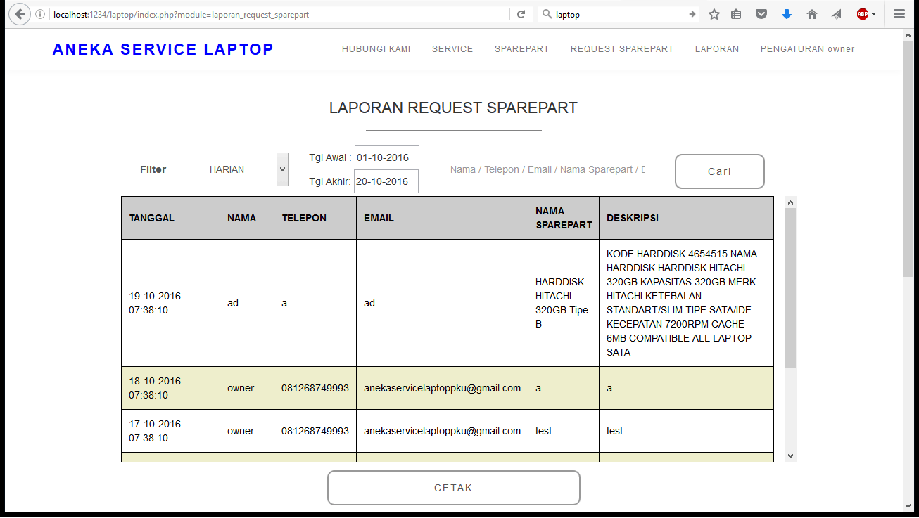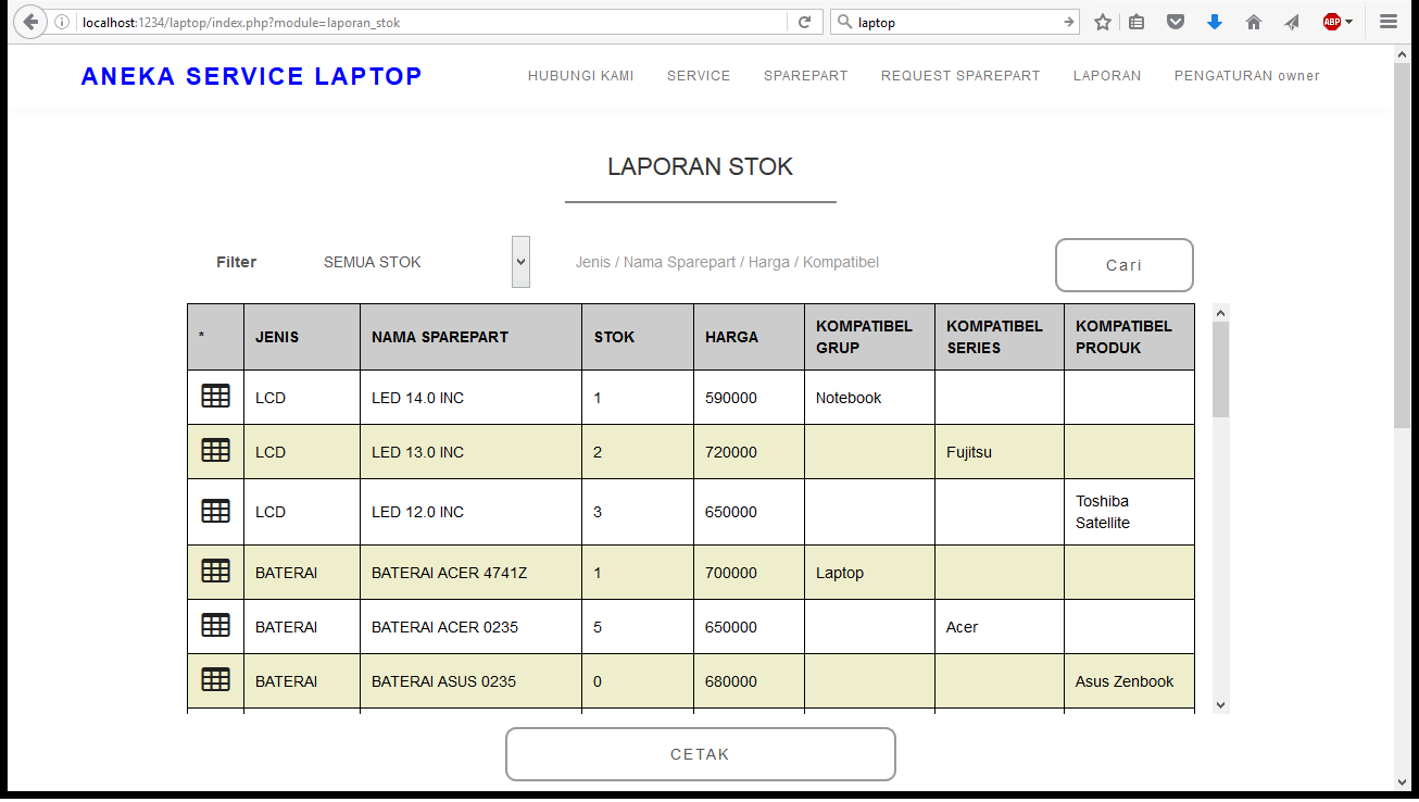 | Website ini mirip seperti toko online, yaitu menyediakan jasa pemesanan service laptop dan penjualan sparepart laptop, tetapi fungsi yang lebih diutamakan adalah fungsi penjualan sparepart laptop. User akan dimudahkan dalam tata cara pemilihan sparepart yang sesuai dengan jenis laptop yang telah diinputkan, dan kemudian sistem akan melakukan penyimpanan terhadap data pemesanan sparepart tersebut. User yang sudah login kemudian dapat mengecek status pemesanan barang yang sudah dilakukan, dan kemudian melakukan komunikasi kepada customer service untuk melakukan pembayaran. Setelah mendapat konfirmasi pembayaran, maka sistem akan menandai bahwa transaksi tersebut telah selesai dilunasi dan kemudian sparepart akan dikirim kepada customer. Apabila sparepart tidak ditemukan, maka user dapat mengirimkan pengajuan sparepart dengan mengisi data pada form yang sudah disediakan. Admin yang login ke dalam sistem dapat melakukan manipulasi data laptop, data sparepart, data user, dan dapat melakukan penambahan stok pada sparepart. Admin juga dapat melihat laporan pemesanan, laporan penjualan, laporan stok, dan laporan request sparepart. | |