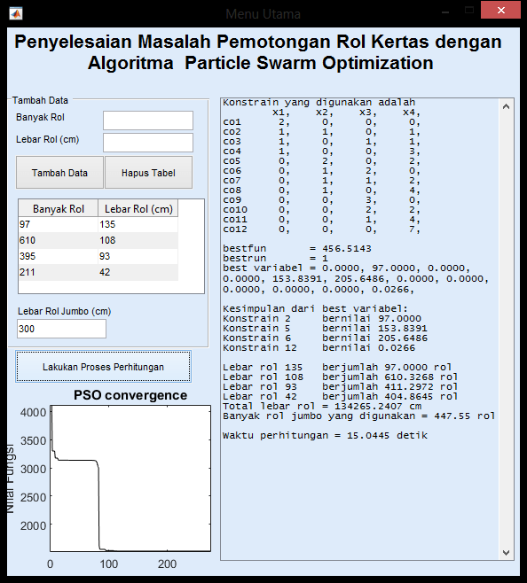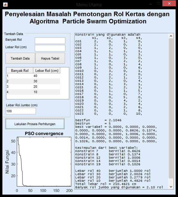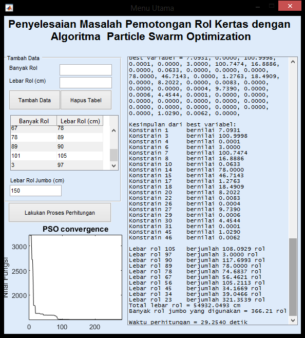 | Ada berbagai jumlah permintaan rol kertas dengan berbagai lebar rol tertentu. Kemudian ada sebuah input lebar rol jumbo, yaitu rol kertas utama yang akan dipotong menjadi berbagai lebar rol menyesuaikan dengan jumlah permintaan rol kertas yang telah diinputkan sebelumnya. Sistem kemudian akan melakukan perhitungan optimasi untuk menemukan nilai jumlah masing-masing lebar rol yang paling mendekati (tetapi tidak kurang dari) dari jumlah permintaan rol kertas. Metode yang digunakan adalah metode PSO (Particle Swarm Optimization). Tutorial dari masing-masing metode dapat dilihat pada link diatas. | |