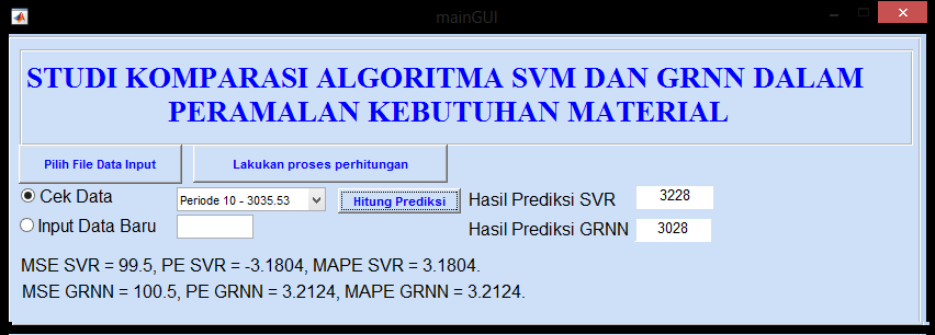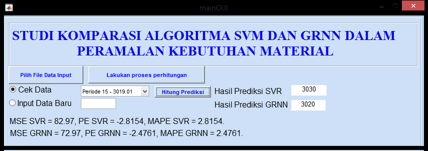 | Fungsi utama aplikasi ini adalah untuk memprediksikan kebutuhan material pada periode setelah periode terpilih. Sistem akan menghitung nilai prediksi menggunakan algoritma yang telah ditentukan, kemudian menghitung nilai tingkat kesalahan antara nilai prediksi ini dengan nilai sebenarnya yang telah tersedia. User kemudian dapat melakukan perbandingan antar kedua metode tersebut dan menarik kesimpulan metode manakah yang lebih mendekati nilai sebenarnya. Jika user ternyata melakukan perhitungan data pada periode terakhir, maka sistem akan menyimpan nilai prediksi sebagai nilai pada periode selanjutnya. Metode yang digunakan adalah metode SVR (Support Vector Regression) dan GRNN (General Regression Neural Network). Tutorial dari metode SVR dapat dilihat pada link diatas. | |