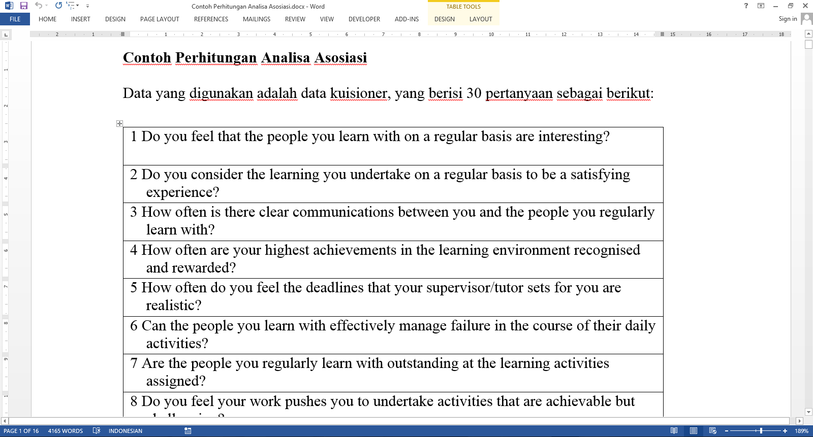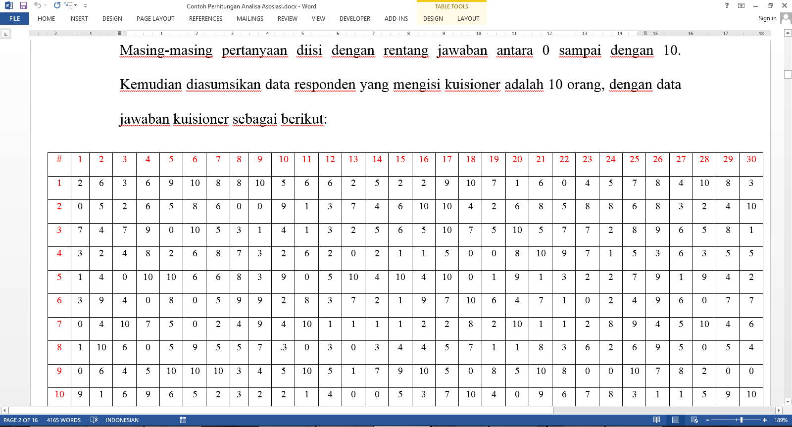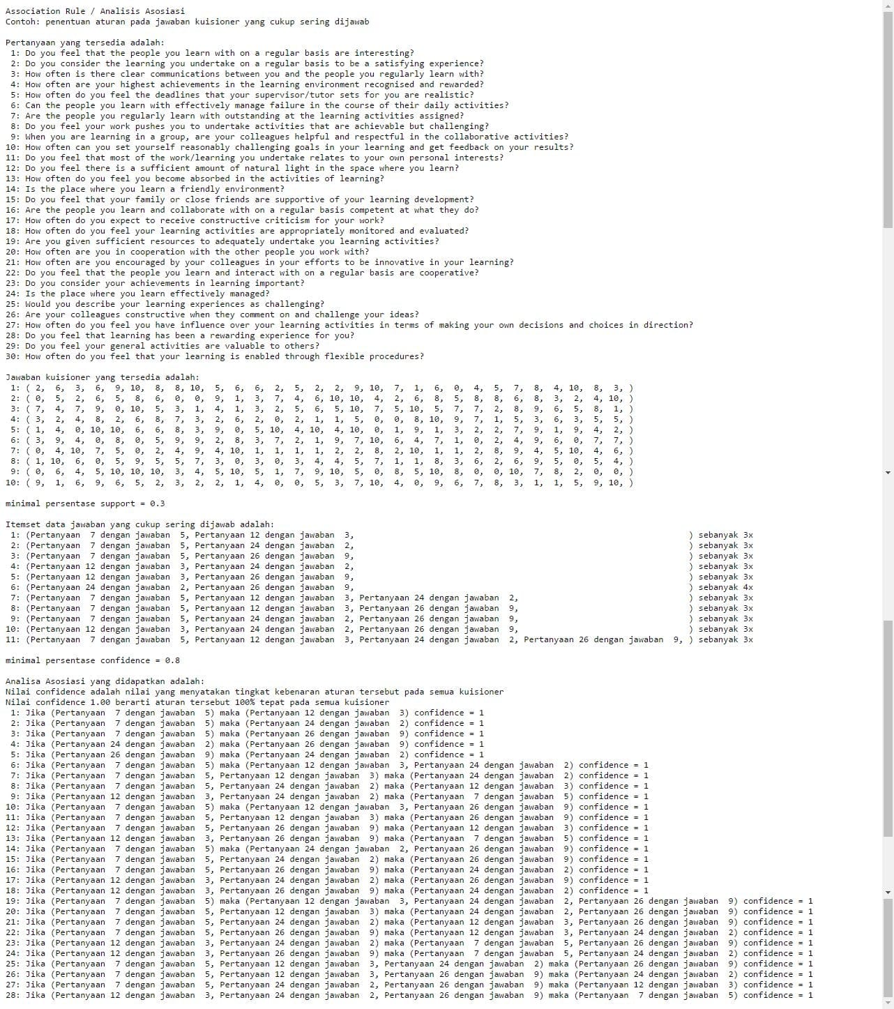 | Fungsi utama aplikasi ini adalah untuk mengetahui relasi jawaban apakah yang ditemukan dari semua responden yang tersedia. Masing-masing responden akan memberikan jawaban terhadap 30 pertanyaan dengan rentang nilai antara 0 (Sangat Jarang) sampai dengan 10 (Sangat Sering). Sistem kemudian akan melakukan perhitungan dan menemukan berbagai aturan yang memenuhi syarat tingkat kecocokan pada semua data jawaban kuisioner. Metode yang digunakan adalah metode Associate Rule / Analisa Asosiasi. Tutorial metode ini dapat dilihat pada link diatas. | |