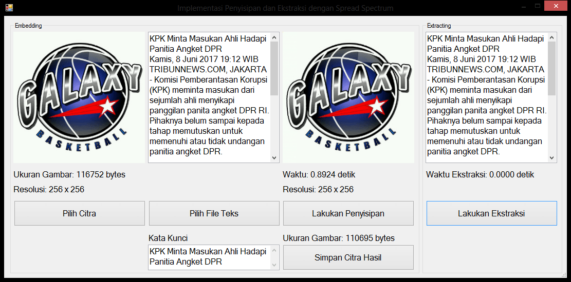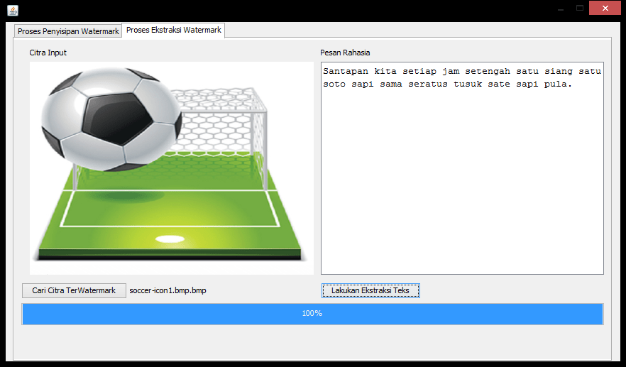 | Fungsi utama aplikasi ini adalah untuk menyisipkan data file teks kedalam sebuah citra tanpa merusak citra tersebut. Input yang digunakan adalah citra bertipe bmp dan file teks yang akan disisipkan. Sistem kemudian akan melakukan penyisipan file ke dalam citra tersebut. Proses berikutnya adalah proses ekstraksi file teks dari citra hasil pemrosesan. Setelah melakukan ekstraksi, sistem kemudian akan melakukan pembacaan file tersebut. Teks hasil ekstraksi tentu saja harus kembali seperti aslinya dan tidak mengalami perubahan karakter. Metode yang digunakan adalah metode Spread Spectrum dan LSB (Least Significant Bit). Kedua algoritma ini akan dibandingkan untuk mendapatkan algoritma manakah yang memiliki hasil lebih baik dilihat dari beberapa faktor seperti waktu penyisipan, ukuran citra, dan lain-lain. | |