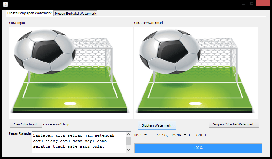 | Fungsi utama aplikasi ini adalah untuk memasukkan watermark yang berupa pesan ke dalam citra tanpa merusak citra tersebut. Input yang digunakan adalah citra bertipe bmp dan teks pesan rahasia yang akan disisipkan. Sistem kemudian akan melakukan penyisipan teks ke dalam citra tersebut. Proses berikutnya adalah proses ekstraksi pesan watermark tersebut dari citra hasil pemrosesan. Teks hasil ekstraksi tentu saja harus kembali seperti aslinya dan tidak mengalami perubahan karakter. Metode yang digunakan adalah metode DCT (Discrete Cosine Transform) dan LSB (Least Significant Bit). Tutorial metode ini dapat dilihat pada link diatas. | |
