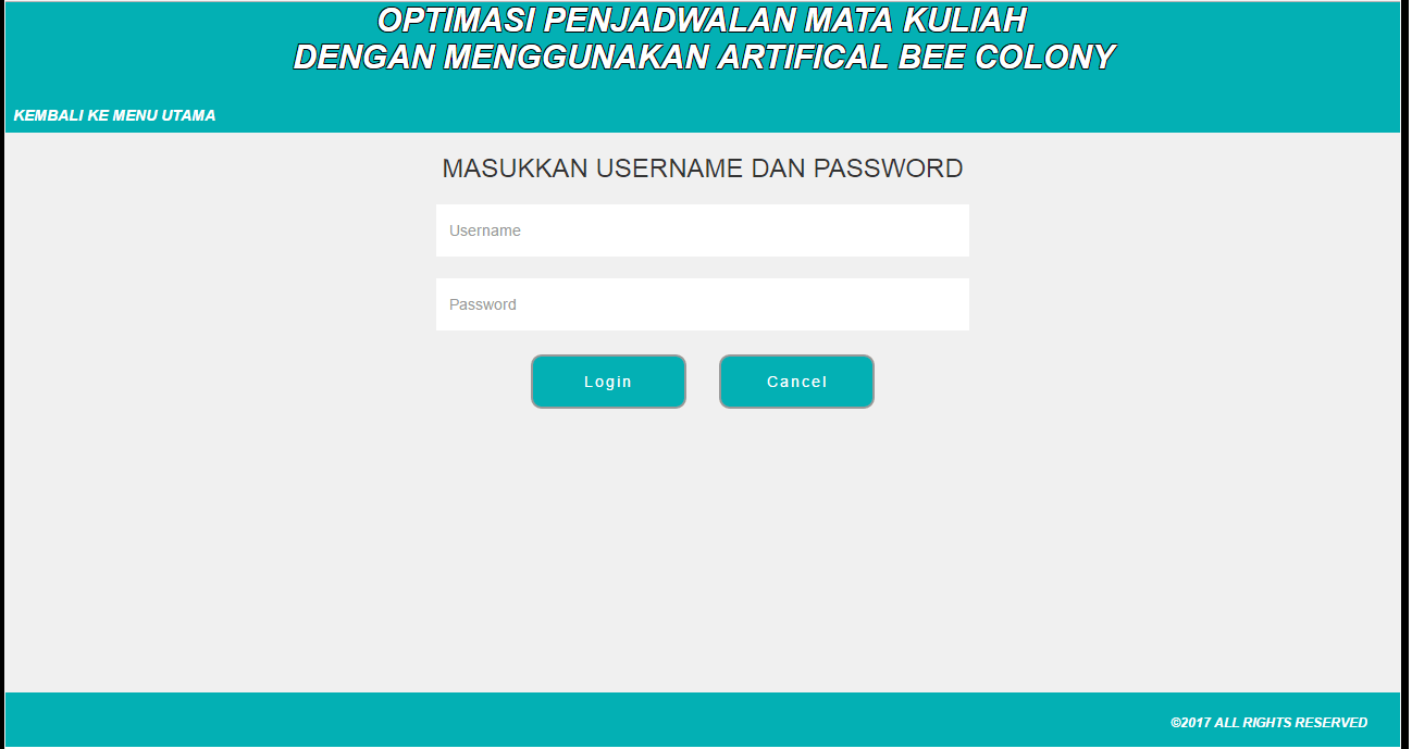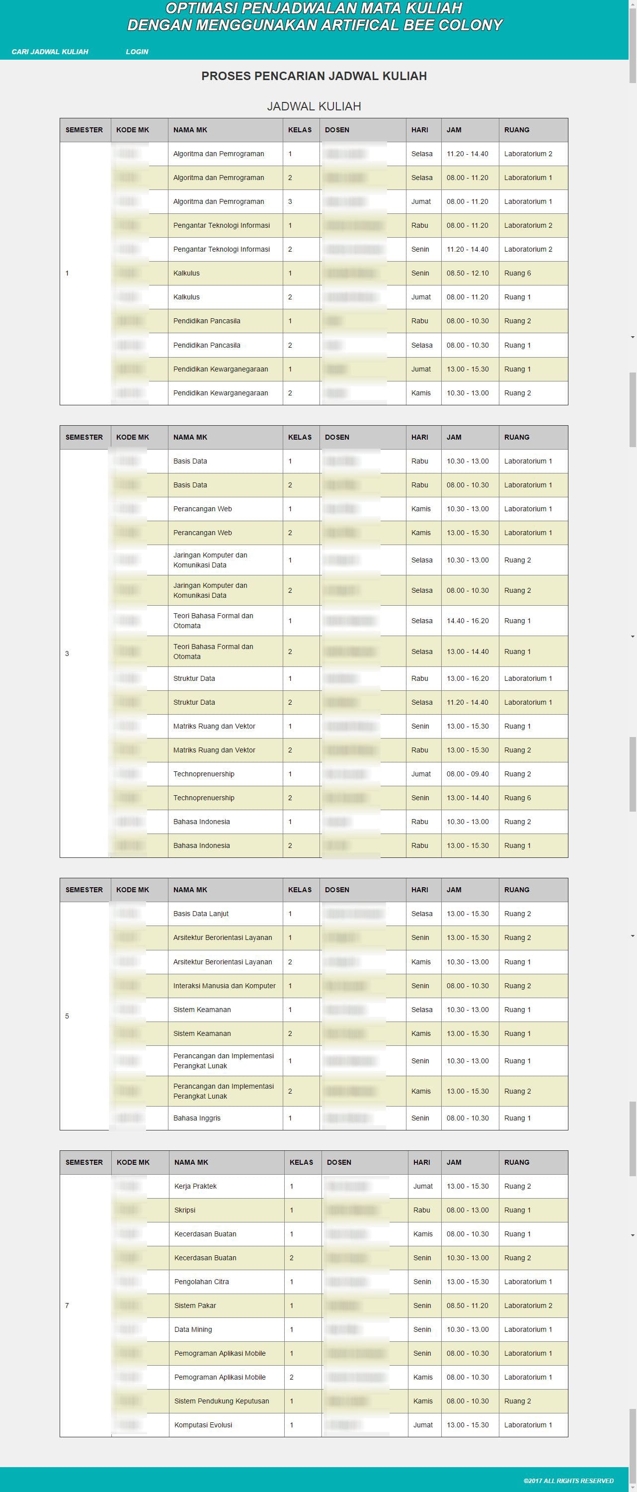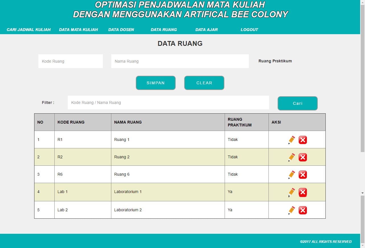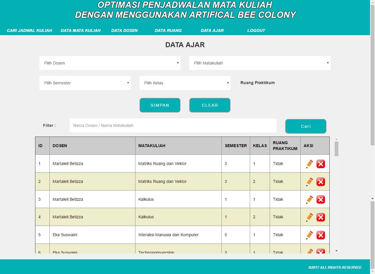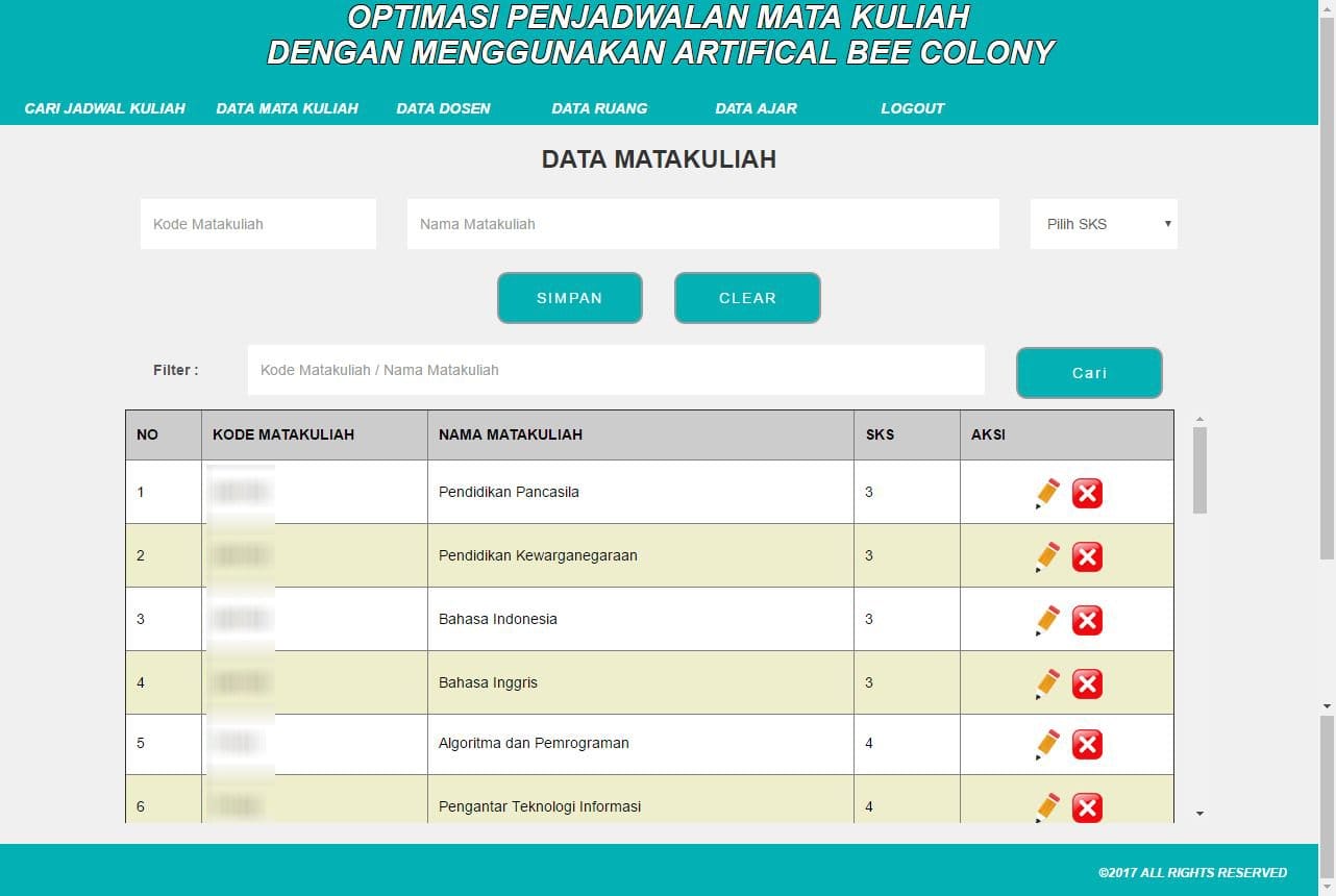 | Ada sejumlah inputan data mata kuliah, dosen, ruangan, hari, waktu, dan tabel ajar yang tersedia. Data-data ini kemudian akan diproses untuk memperoleh jadwal kuliah yang paling baik. Jadwal kuliah yang tersedia memiliki batasan bahwa pada hari dan jam yang sama, tidak boleh ada matakuliah, dosen, dan ruang yang berada pada saat bersamaan. Metode yang digunakan adalah metode BCO (Bee Colony Optimization). Tutorial metode ini dapat dilihat pada link diatas. | |