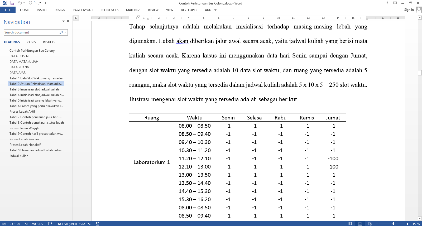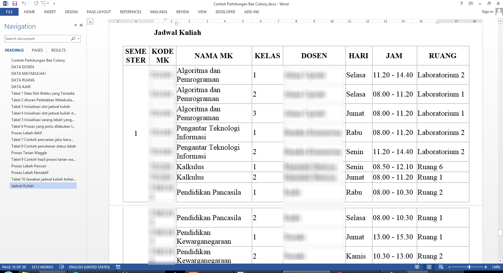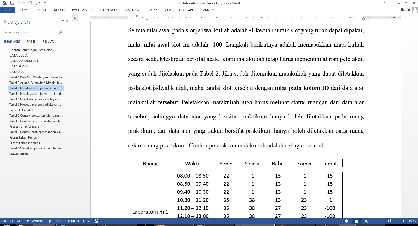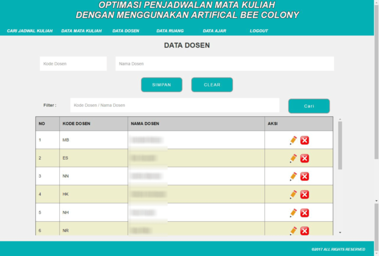 | Ada sejumlah inputan data mata kuliah, dosen, ruangan, hari, waktu, dan tabel ajar yang tersedia. Data-data ini kemudian akan diproses untuk memperoleh jadwal kuliah yang paling baik. Jadwal kuliah yang tersedia memiliki batasan bahwa pada hari dan jam yang sama, tidak boleh ada matakuliah, dosen, dan ruang yang berada pada saat bersamaan. Metode yang digunakan adalah metode BCO (Bee Colony Optimization). Tutorial metode ini dapat dilihat pada link diatas. | |