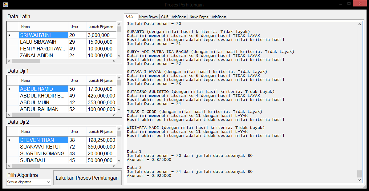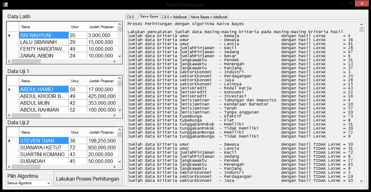 | Fungsi utama aplikasi ini adalah untuk menentukan apakah calon customer dengan inputan kriteria-kriteria tertentu dapat dianggap layak untuk melakukan kredit sepeda motor. Input data terdiri dari beberapa kriteria, yaitu Umur, Jumlah Pinjaman, Jangka Waktu (Bulan), Sektor Ekonomi, Jenis Kredit, Jenis Jaminan, Type Bunga, Tunggakan Pokok, dan Tunggakan Bunga. Sistem akan melakukan pelatihan data menggunakan sekumpulan data latih tertentu, dan kemudian melakukan pengujian terhadap data uji untuk mendapatkan status kelayakan dari masing-masing data uji tersebut. Tutorial dari masing-masing metode ini dapat dilihat pada link diatas. | |