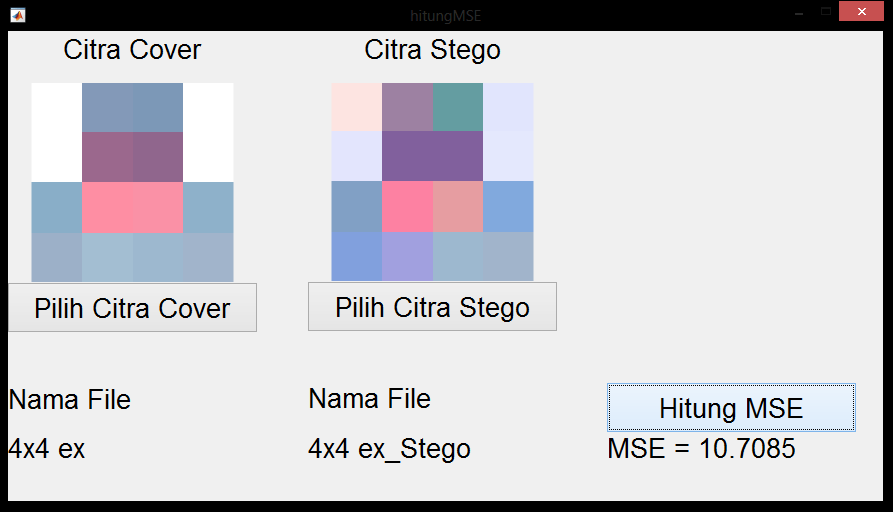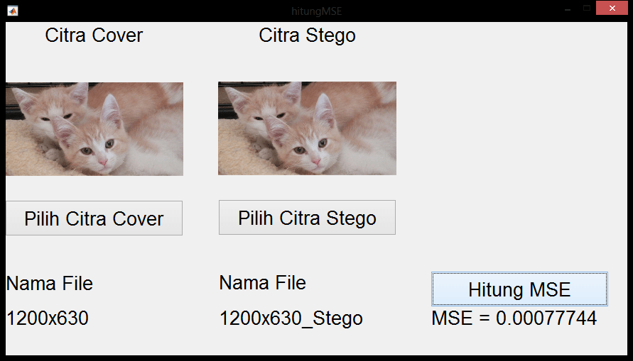 | Fungsi utama aplikasi ini adalah untuk memasukkan pesan rahasia yang telah dienkripsi ke dalam citra digital tanpa merusak citra tersebut. Input yang digunakan adalah citra bertipe bmp, teks pesan rahasia yang akan disisipkan, dan 3 kata kunci yang digunakan dalam proses enkripsi tersebut. Sistem kemudian akan melakukan enkripsi teks tersebut dan melakukan penyisipan teks ke dalam citra tersebut. Hasil citra ini kemudian dapat dilakukan proses ekstraksi untuk mendapatkan pesan rahasia dari citra tersebut. Teks hasil ekstraksi tentu saja harus kembali seperti aslinya dan tidak mengalami perubahan karakter. Fitur terakhir adalah perhitungan nilai MSE (Mean Squared Error) dari kedua citra sebelum dan sesudah dilakukan proses penyisipan pesan. | |
