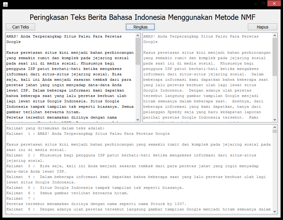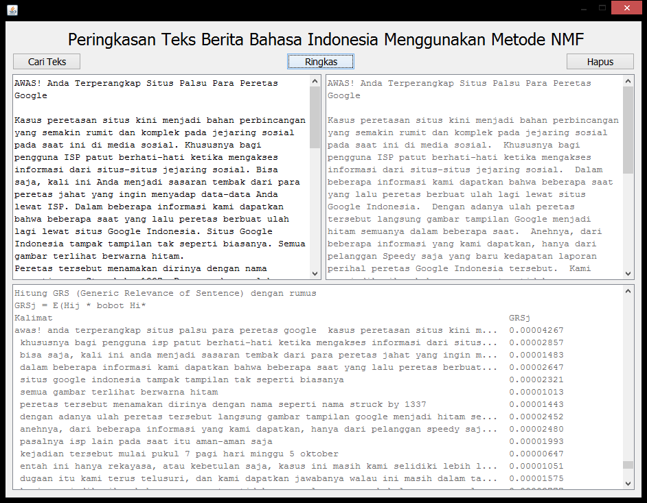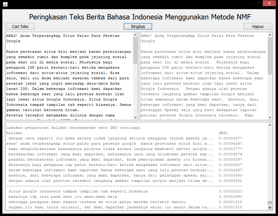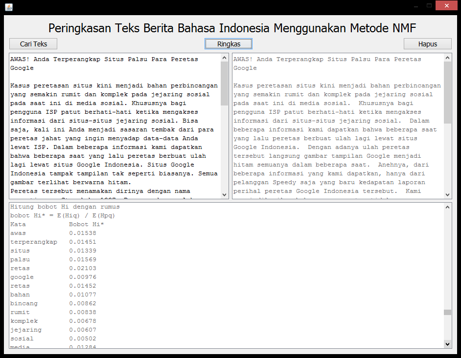 | Fungsi utama aplikasi ini adalah untuk mendapatkan kalimat-kalimat inti dari sekumpulan teks input. Setelah memilih file bertipe txt dan membaca isi dari file tersebut, sistem kemudian akan melakukan proses perhitungan dan kemudian mendapatkan semacam skor dari masing-masing kalimat tersebut. Skor tersebut kemudian akan diurutkan berdasarkan skor tertinggi, dan jawaban hasil ringkasan sejumlah kalimat dengan skor yang cukup tinggi. Proses perhitungan dicatat dalam log untuk memudahkan pengguna menganalisa nilai variabel dan skor yang terjadi pada saat proses perhitungan. | |