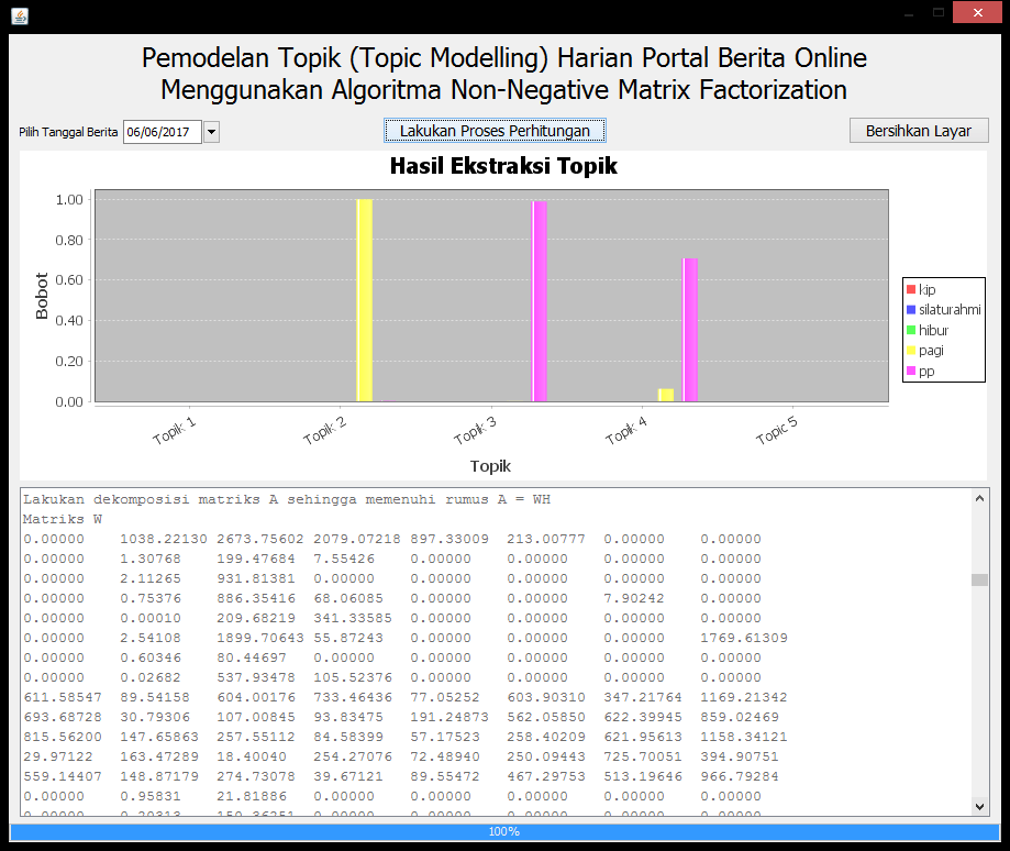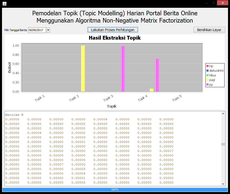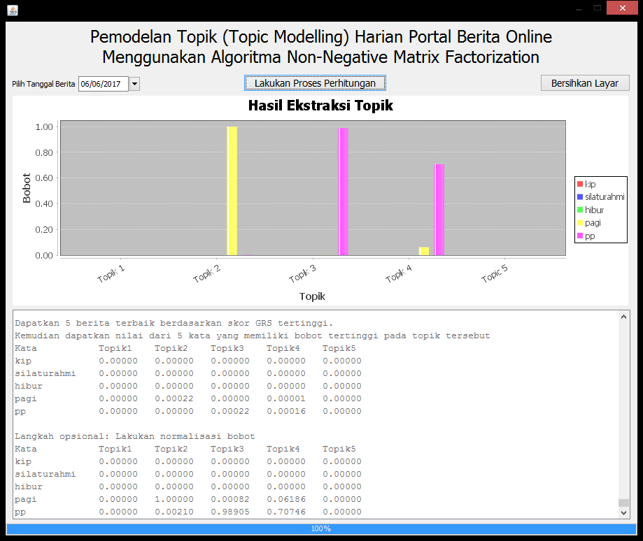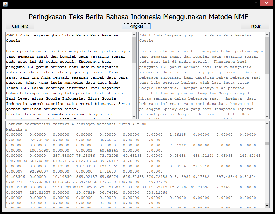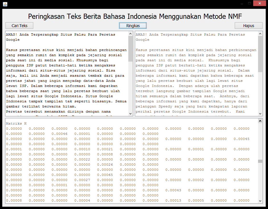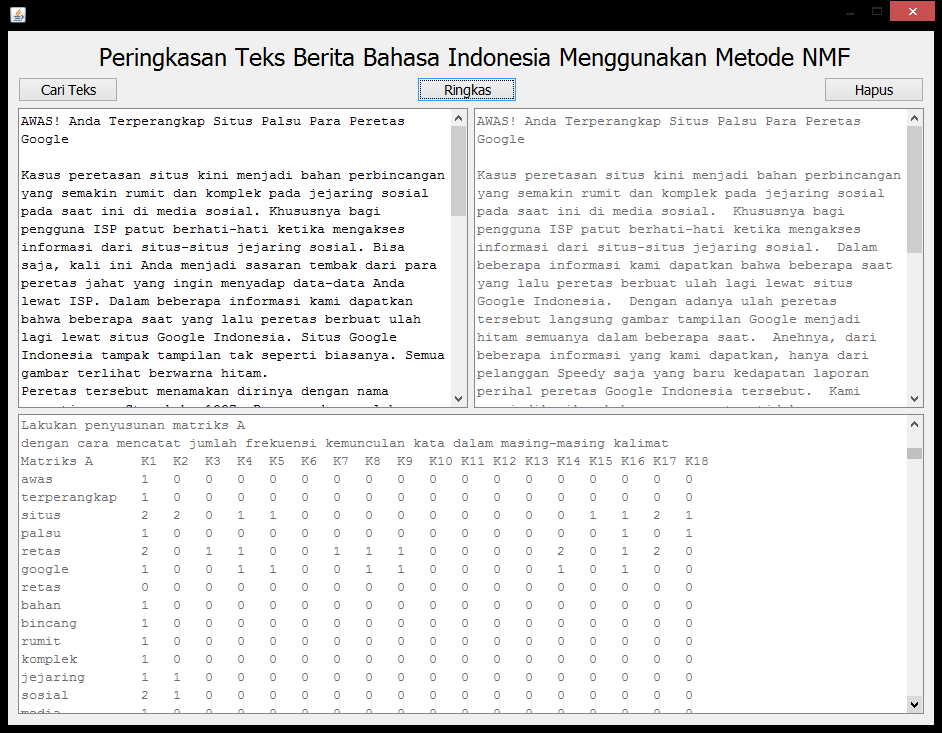 | Metode Tambahan | Stemming Nazief & Andriani dan NMF (Non-Negative Matrix Factorization) |