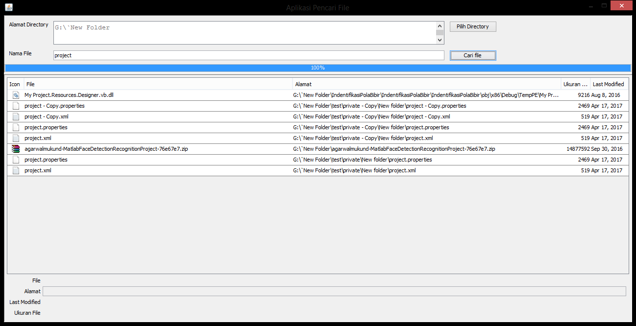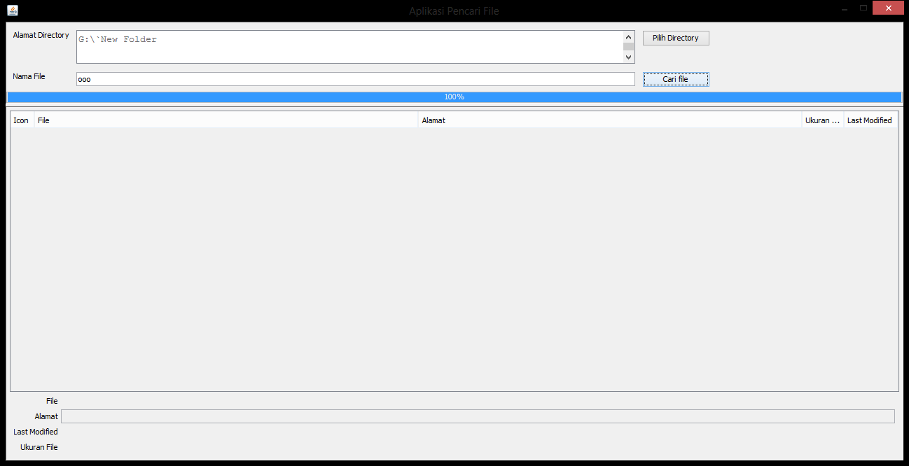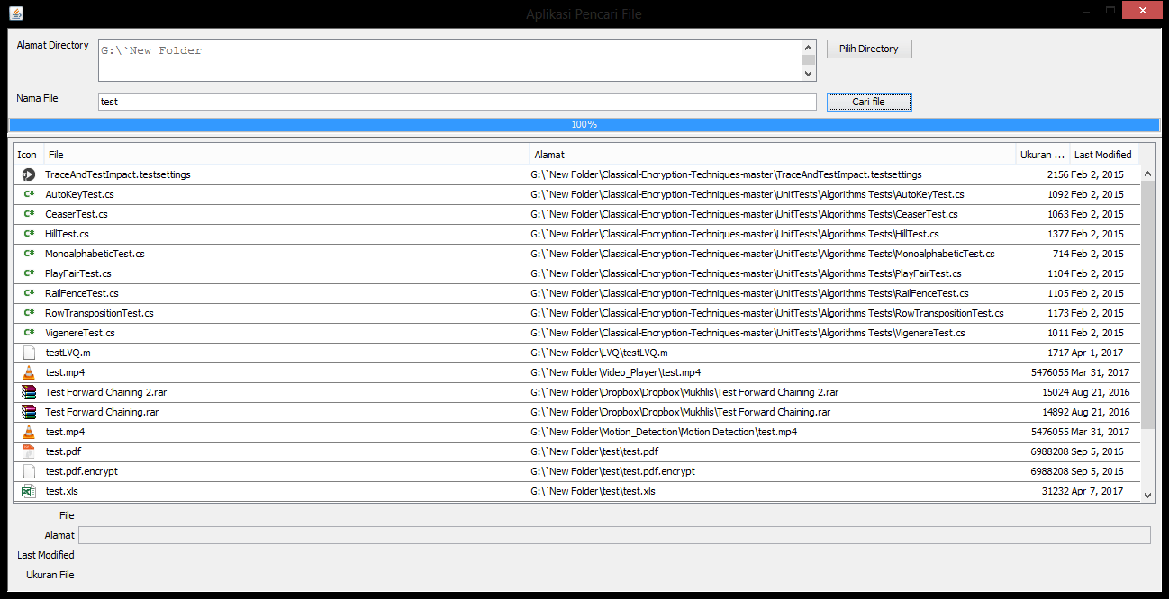 | Fungsi utama aplikasi ini adalah untuk melakukan pencarian file seperti fitur pencarian file pada sistem operasi pada umumnya. Input yang disediakan adalah input alamat sebagai titik awal pencarian, dan input teks sebagai bagian dari nama file yang akan dicari. Sistem akan melakukan perhitungan dan menampilkan semua file yang memiliki teks sesuai dengan input yang telah dicatat sebelumnya. Kemudian untuk masing-masing file yang ditampilkan akan memiliki 2 fitur dasar, yaitu untuk membuka folder dari file tersebut, dan untuk membuka file tersebut. Metode yang digunakan adalah metode A* (A-Star). Tutorial metode ini dapat dilihat pada link diatas. | |