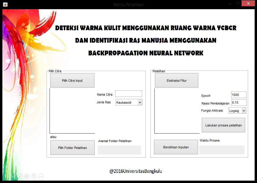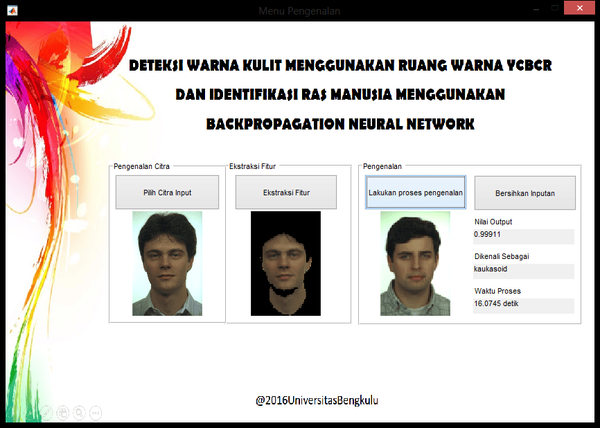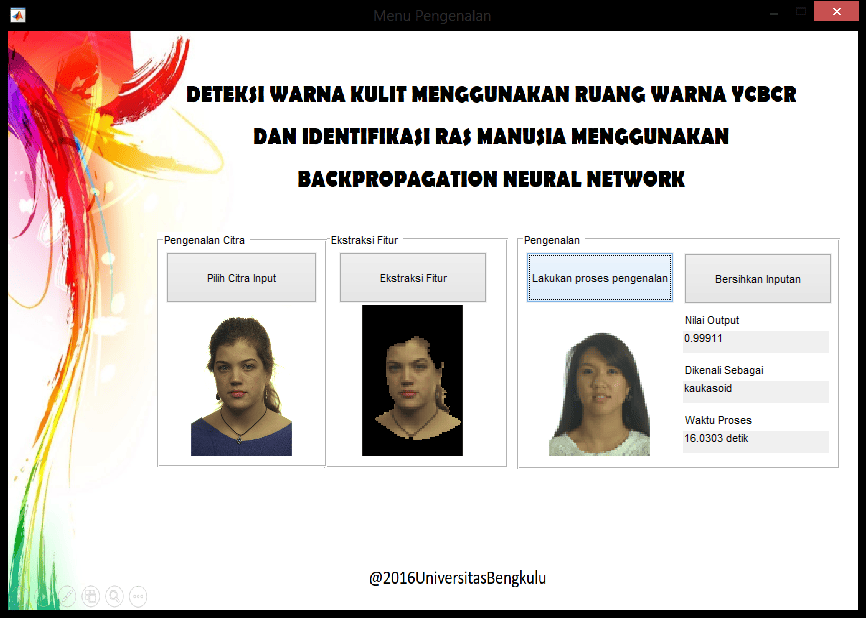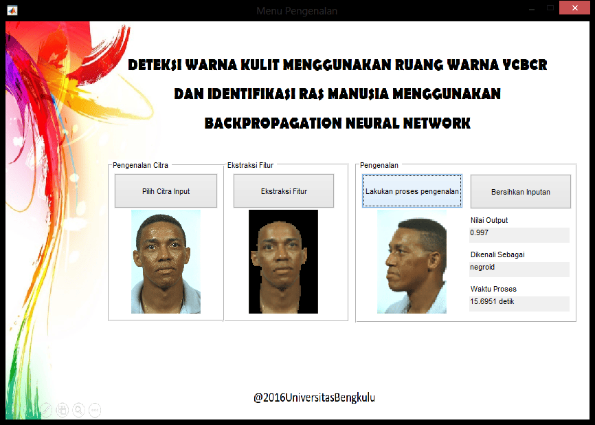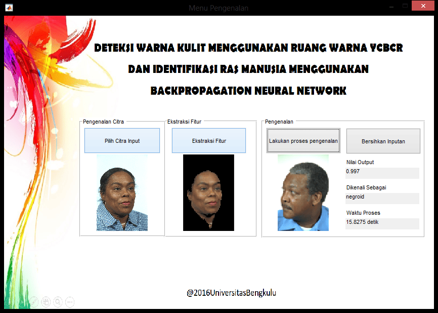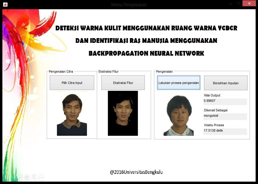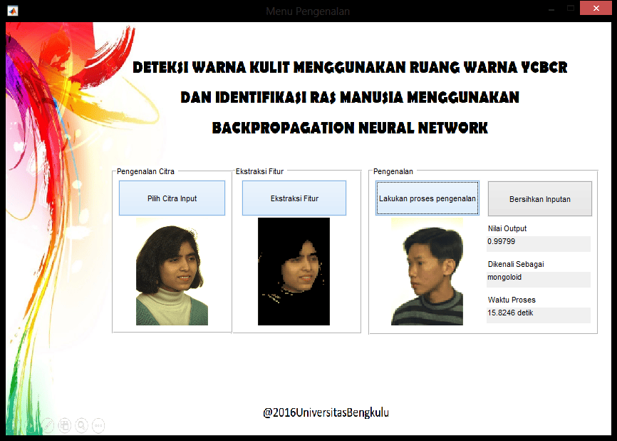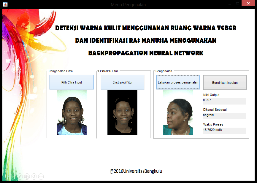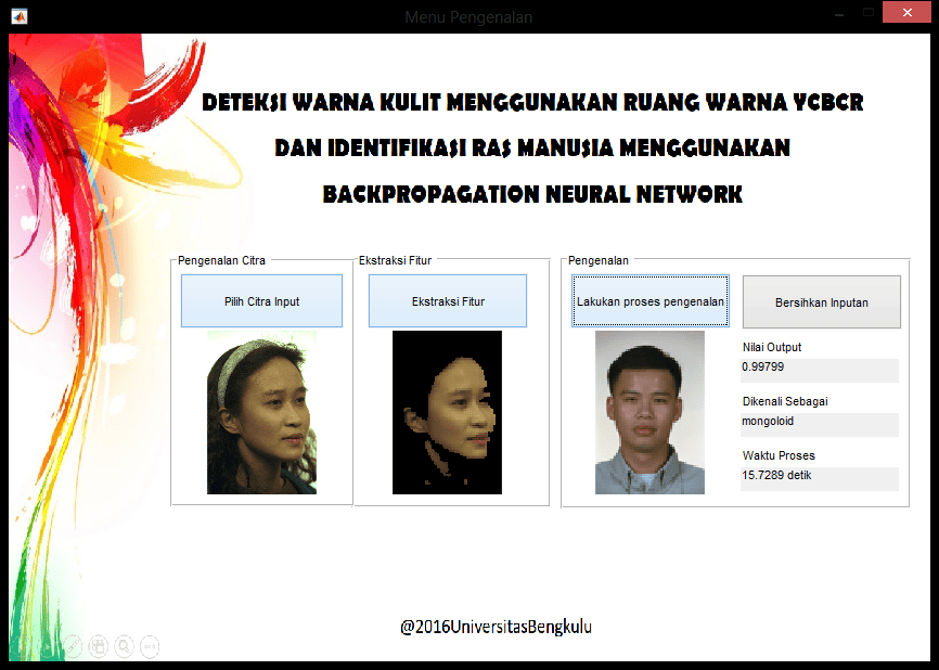 | Ada berbagai data citra manusia yang dikategorikan ke dalam 3 ras, yaitu Kaukasoid, Mongoloid, dan Negroid. Pada figure pelatihan, masing-masing data citra yang terpilih akan disimpan ke dalam database, dan kemudian akan langsung dilatih untuk mendapatkan nilai bobot pelatihan. Selanjutnya pada figure Pengujian, akan diinputkan citra manusia yang belum diketahui ras nya, dan sistem akan melakukan perhitungan untuk mendapatkan nilai output dengan menggunakan nilai bobot hasil pelatihan dari masing-masing ras. Ras yang memiliki nilai output yang paling mendekati angka 1 akan terpilih sebagai jawaban. Metode yang digunakan adalah metode Ruang Warna YCbCr dan Back-Propagation. Tutorial dari masing-masing metode dapat dilihat pada link diatas. | |