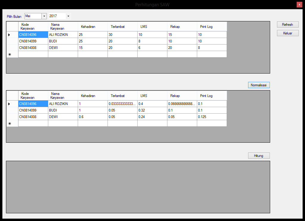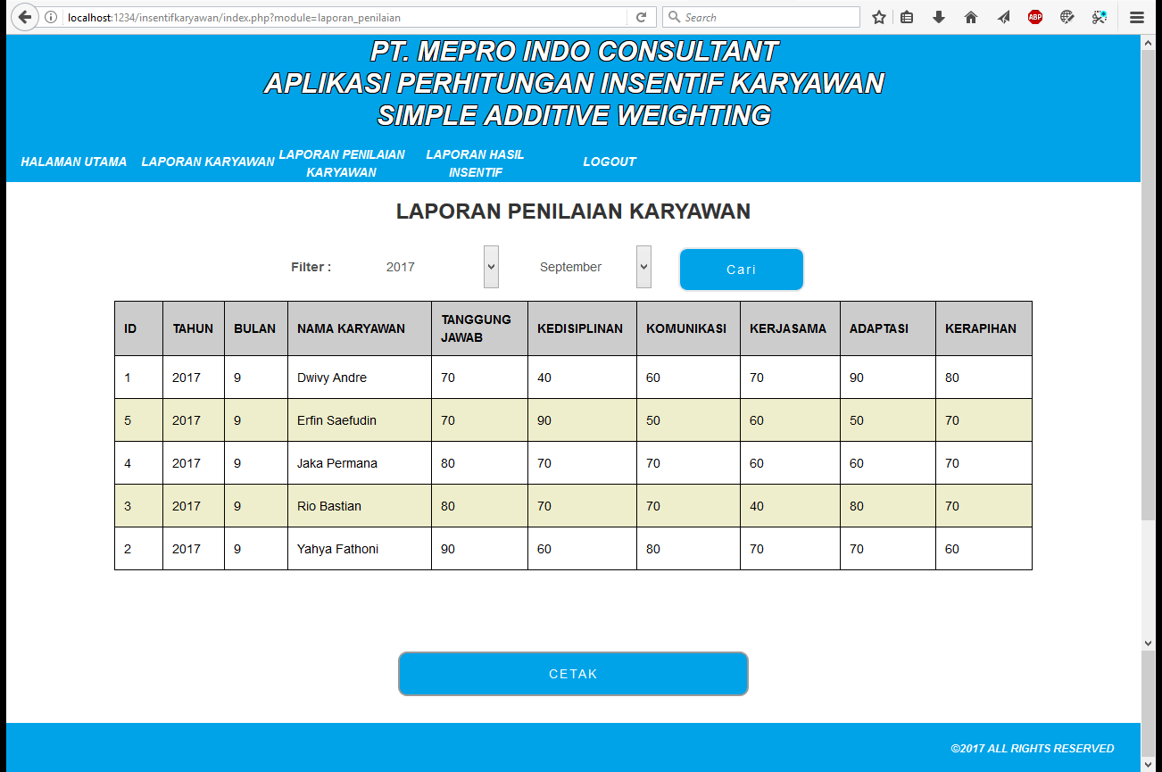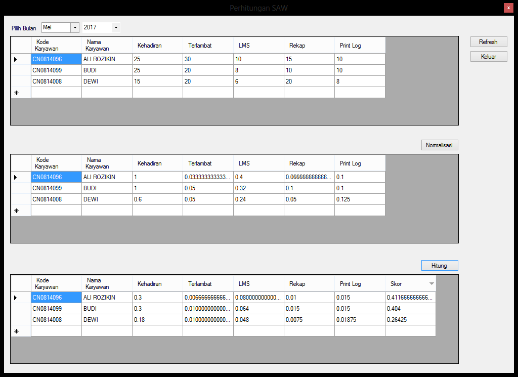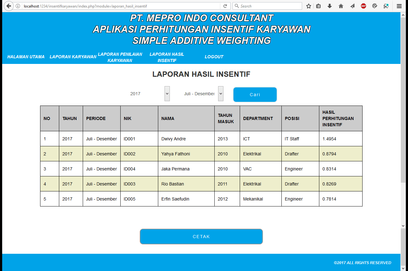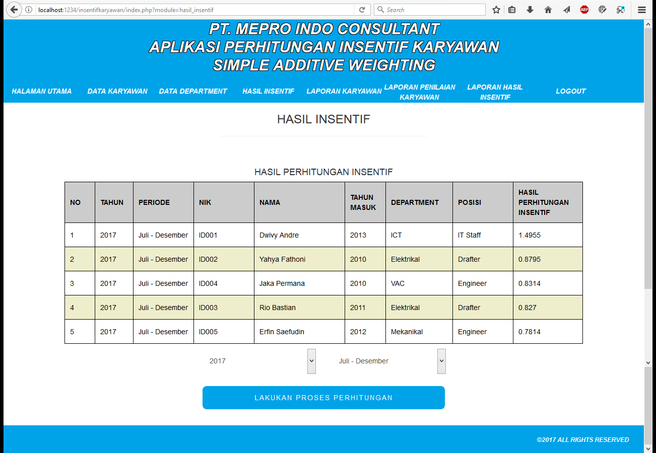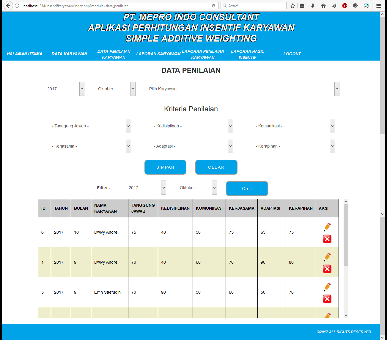 | Proyek ini hanya dikerjakan dalam 2 hari karena hanya merupakan pembetulan dari contoh apilikasi yang telah tersedia. Fungsi utama aplikasi ini adalah untuk melakukan perhitungan skor karyawan berdasarkan beberapa kriteria input, yaitu Jumlah Kehadiran, Jumlah Terlambat, Nilai LMS, Jumlah Rekap, dan Jumlah Print Log. Setelah memasukkan semua data karyawan sesuai dengan bulan yang sedang dipilih, maka sistem akan melakukan perhitungan pada data bulan tersebut untuk mendapatkan skor karyawan, dan melakukan pengurutan berdasarkan skor karyawan yang tertinggi. Hasil proses perhitungan ini kemudian dapat dilihat pada laporan karyawan yang dapat dilakukan filter per bulan untuk mengetahui karyawan mana saja yang layak untuk mendapatkan insentif. Metode yang digunakan adalah metode SAW (Simple Additive Weighting). Tutorial metode ini dapat dilihat pada link diatas. | |