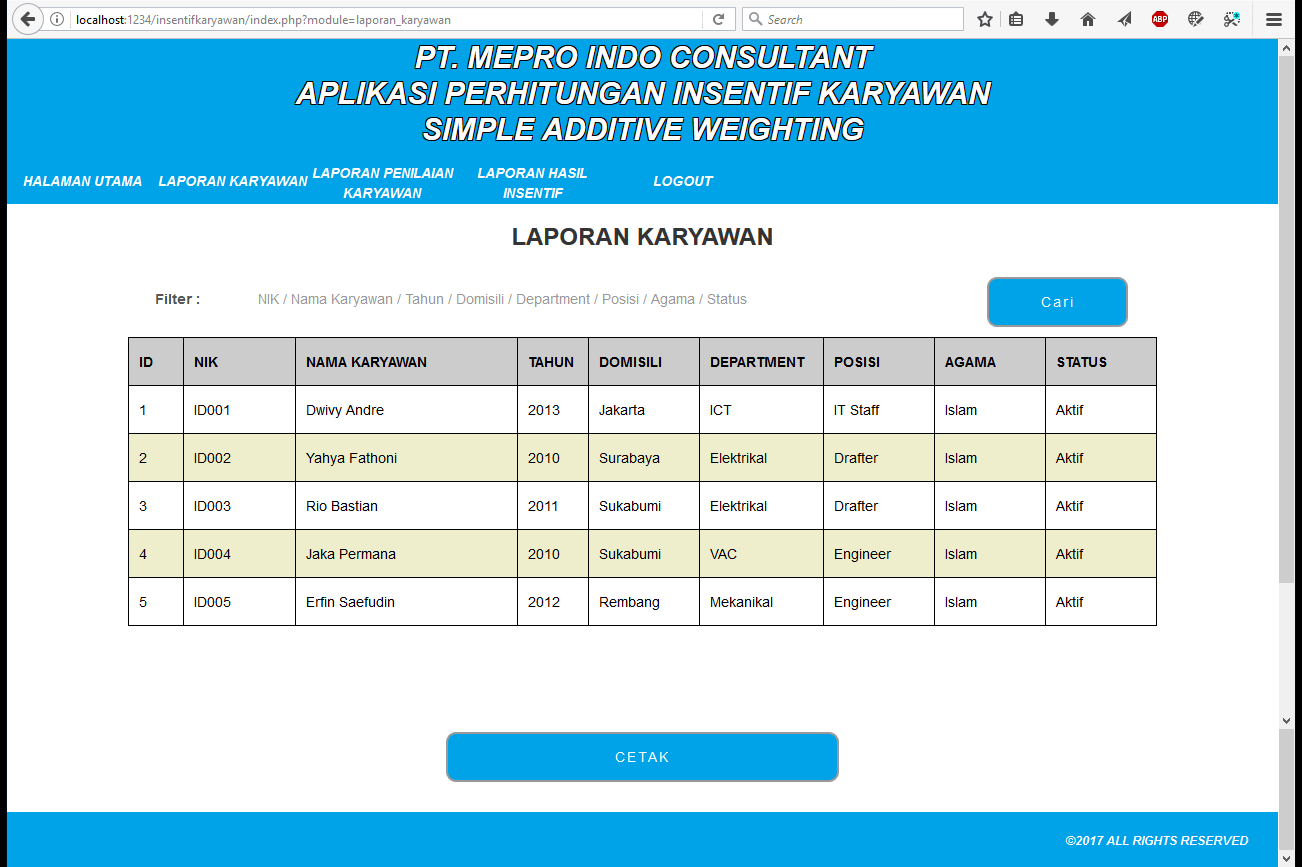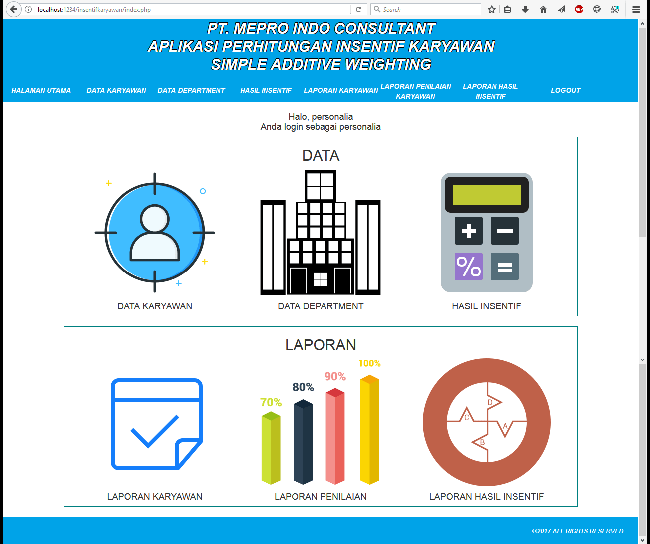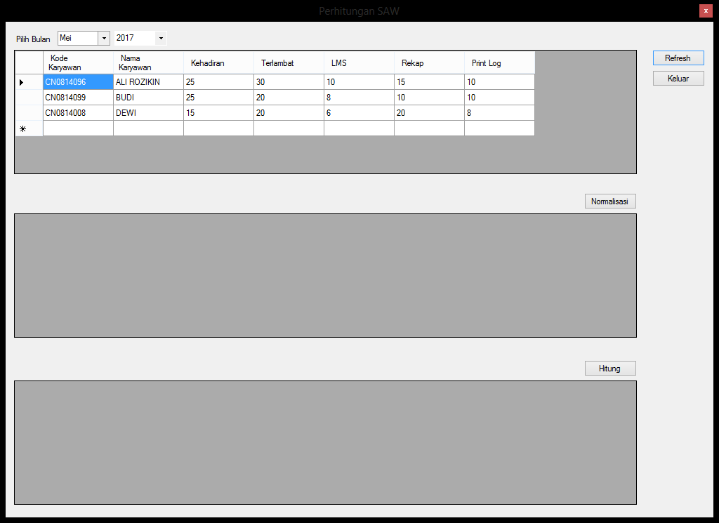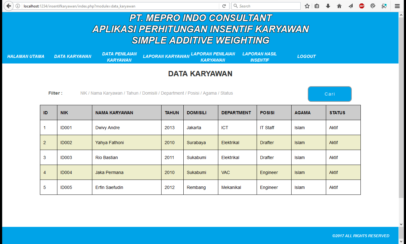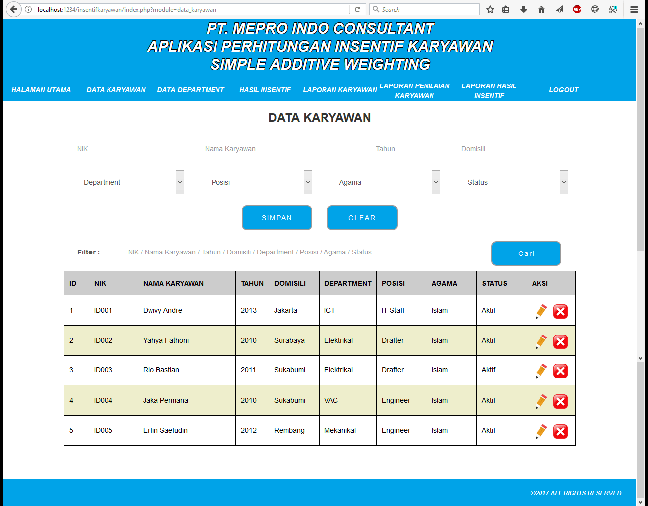 | Proyek ini hanya dikerjakan dalam 2 hari karena hanya merupakan pembetulan dari contoh apilikasi yang telah tersedia. Fungsi utama aplikasi ini adalah untuk melakukan perhitungan skor karyawan berdasarkan beberapa kriteria input, yaitu Jumlah Kehadiran, Jumlah Terlambat, Nilai LMS, Jumlah Rekap, dan Jumlah Print Log. Setelah memasukkan semua data karyawan sesuai dengan bulan yang sedang dipilih, maka sistem akan melakukan perhitungan pada data bulan tersebut untuk mendapatkan skor karyawan, dan melakukan pengurutan berdasarkan skor karyawan yang tertinggi. Hasil proses perhitungan ini kemudian dapat dilihat pada laporan karyawan yang dapat dilakukan filter per bulan untuk mengetahui karyawan mana saja yang layak untuk mendapatkan insentif. Metode yang digunakan adalah metode SAW (Simple Additive Weighting). Tutorial metode ini dapat dilihat pada link diatas. | |