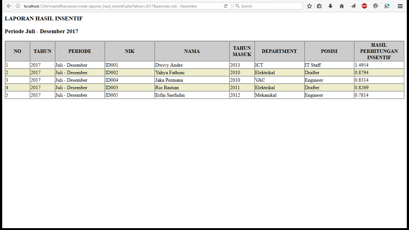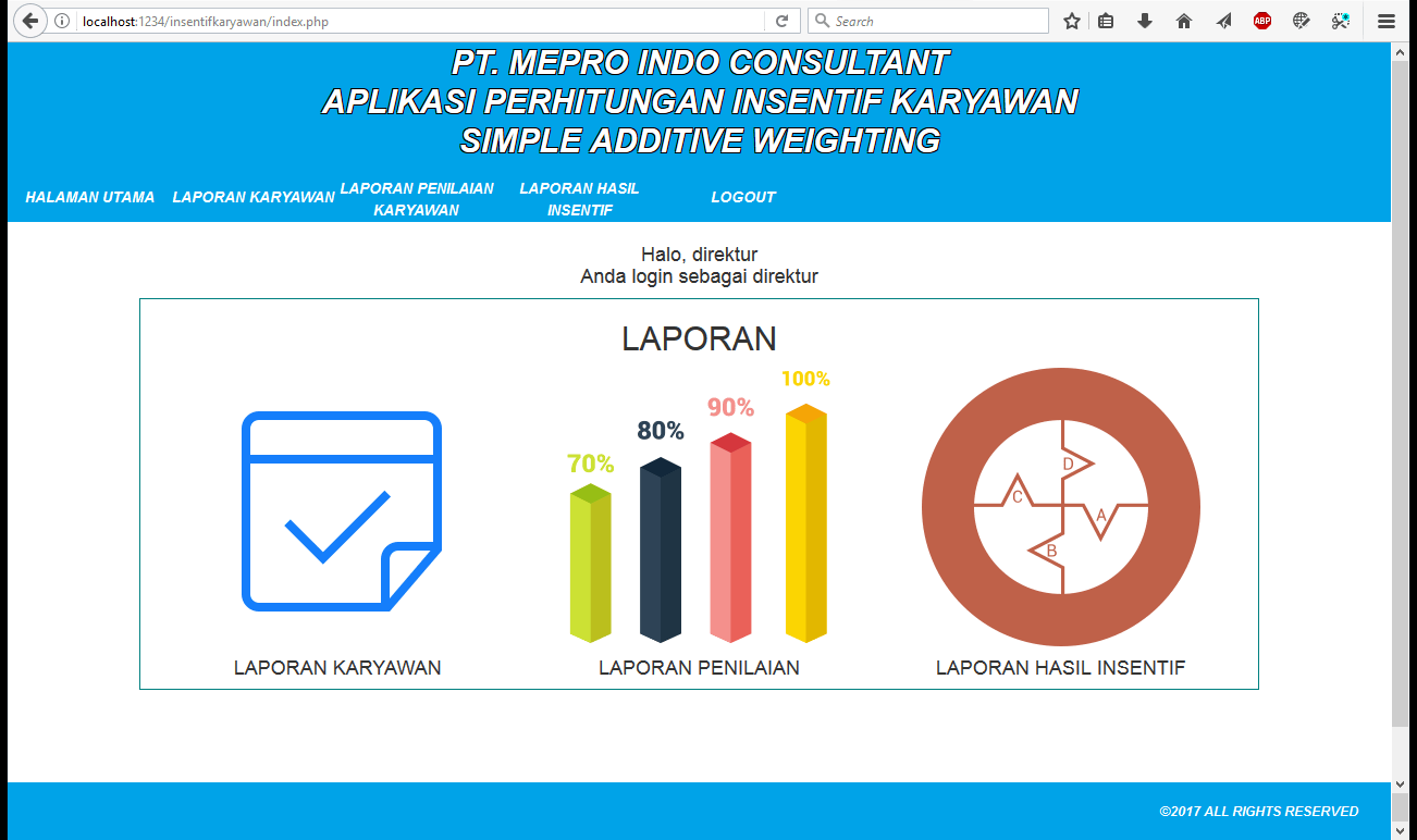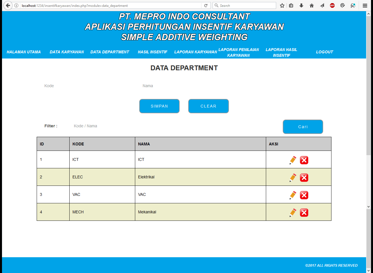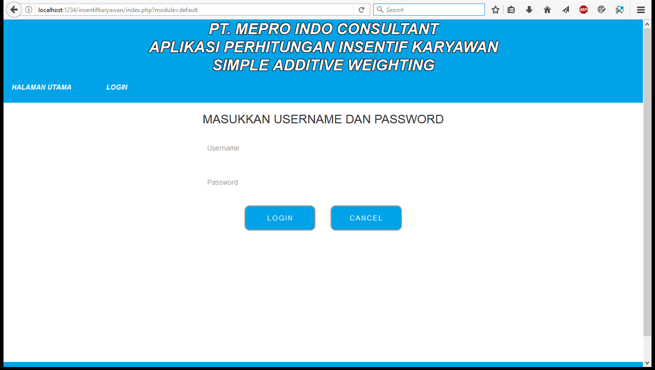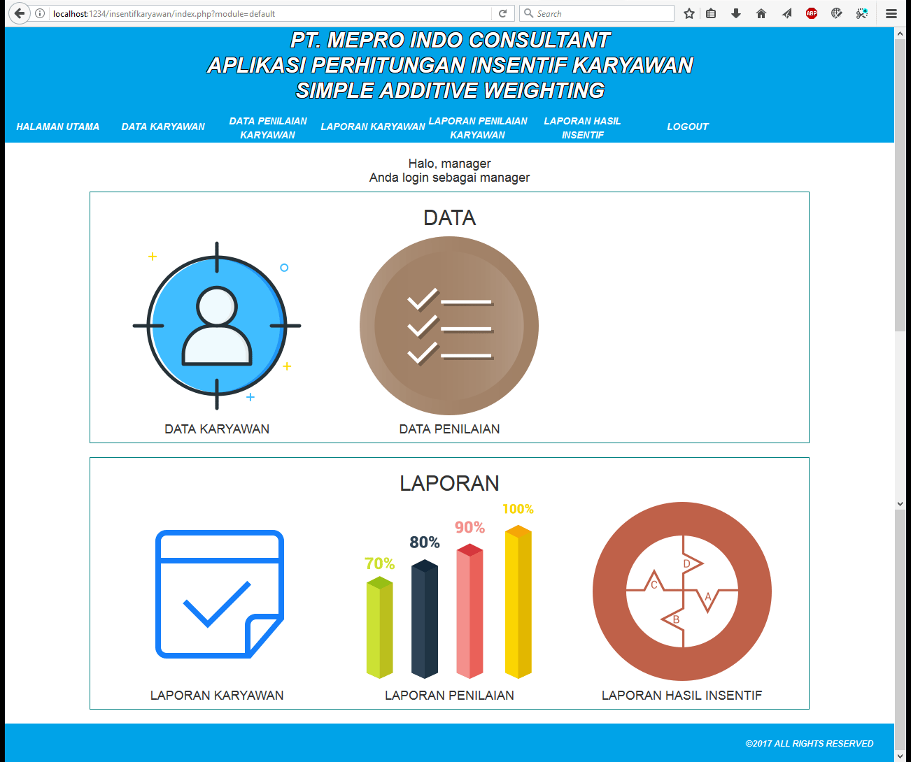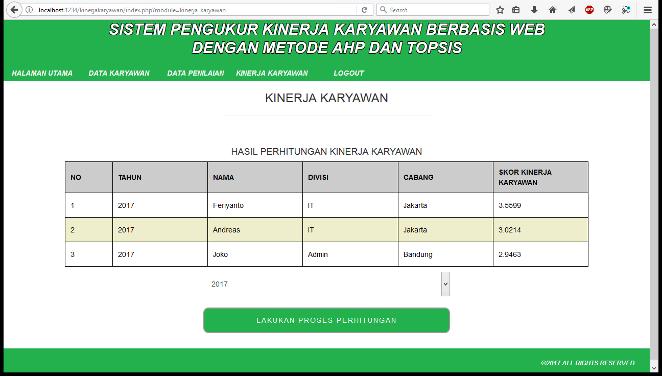 | Proyek ini hanya dikerjakan dalam 2 hari karena hanya merupakan pembetulan dari contoh apilikasi yang telah tersedia. Fungsi utama aplikasi ini adalah untuk melakukan perhitungan skor karyawan berdasarkan beberapa kriteria input, yaitu Jumlah Kehadiran, Jumlah Terlambat, Nilai LMS, Jumlah Rekap, dan Jumlah Print Log. Setelah memasukkan semua data karyawan sesuai dengan bulan yang sedang dipilih, maka sistem akan melakukan perhitungan pada data bulan tersebut untuk mendapatkan skor karyawan, dan melakukan pengurutan berdasarkan skor karyawan yang tertinggi. Hasil proses perhitungan ini kemudian dapat dilihat pada laporan karyawan yang dapat dilakukan filter per bulan untuk mengetahui karyawan mana saja yang layak untuk mendapatkan insentif. Metode yang digunakan adalah metode SAW (Simple Additive Weighting). Tutorial metode ini dapat dilihat pada link diatas. | |