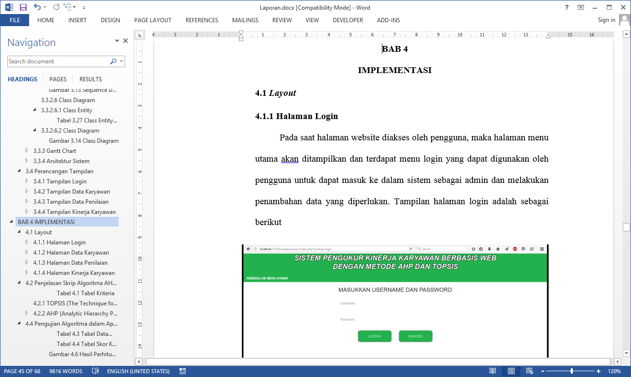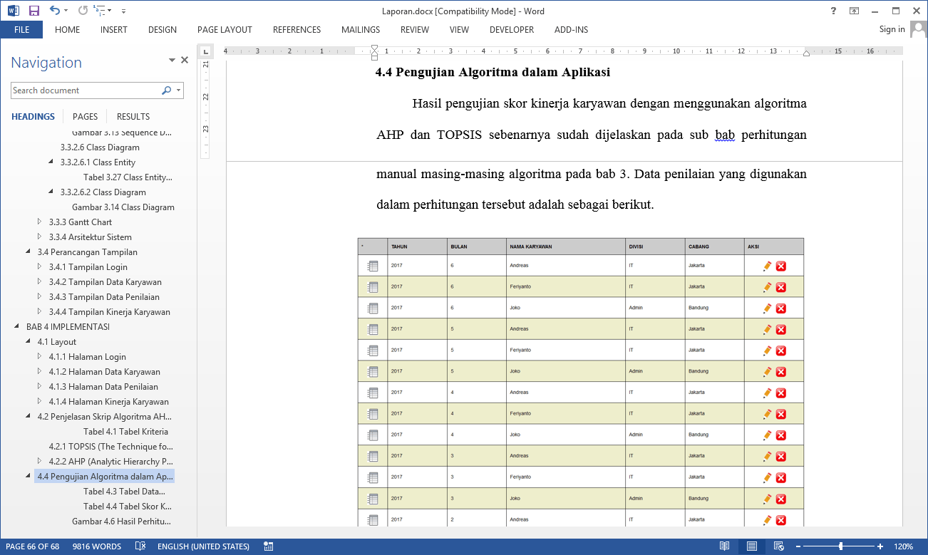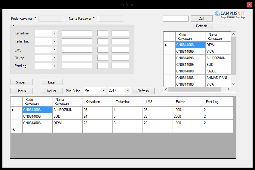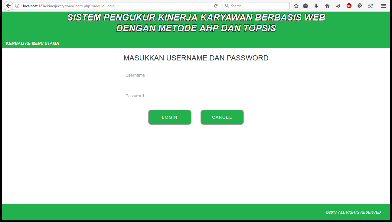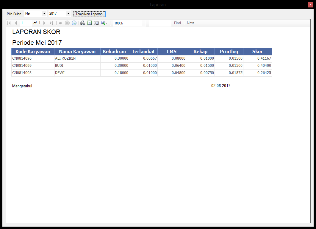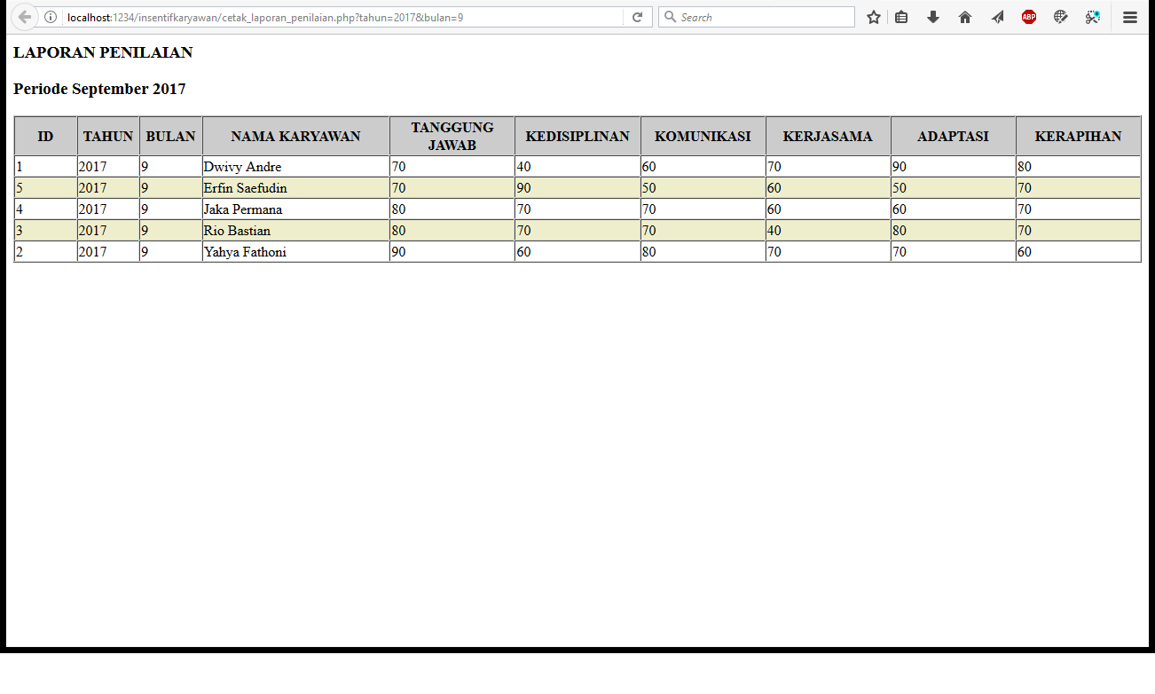 | Proyek ini hanya dikerjakan dalam 2 hari karena hanya merupakan pembetulan dari contoh apilikasi yang telah tersedia. Fungsi utama aplikasi ini adalah untuk melakukan perhitungan skor karyawan berdasarkan beberapa kriteria input, yaitu Jumlah Kehadiran, Jumlah Terlambat, Nilai LMS, Jumlah Rekap, dan Jumlah Print Log. Setelah memasukkan semua data karyawan sesuai dengan bulan yang sedang dipilih, maka sistem akan melakukan perhitungan pada data bulan tersebut untuk mendapatkan skor karyawan, dan melakukan pengurutan berdasarkan skor karyawan yang tertinggi. Hasil proses perhitungan ini kemudian dapat dilihat pada laporan karyawan yang dapat dilakukan filter per bulan untuk mengetahui karyawan mana saja yang layak untuk mendapatkan insentif. Metode yang digunakan adalah metode SAW (Simple Additive Weighting). Tutorial metode ini dapat dilihat pada link diatas. | |