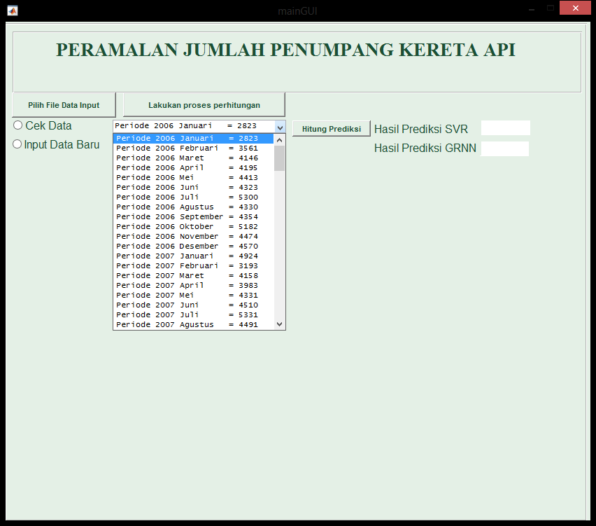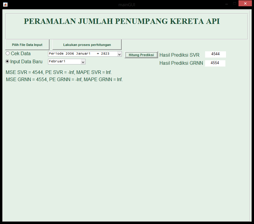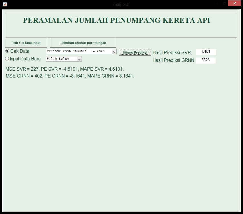 | Fungsi utama aplikasi ini adalah untuk memprediksikan jumlah penumpang kereta api pada periode setelah periode terpilih. Sistem akan menghitung nilai prediksi menggunakan algoritma yang telah ditentukan, kemudian menghitung nilai tingkat kesalahan antara nilai prediksi ini dengan nilai sebenarnya yang telah tersedia. Untuk menghindari nilai prediksi yang sangat dipengaruhi oleh nilai prediksi periode terakhir, maka cara perhitungan nilai prediksi adalah dilakukan dengan menggunakan periode bulan, sehingga data pada bulan terpilih tidak terpengaruh dari data bulan sebelumnya yang telah dihitung. User kemudian dapat melakukan perbandingan antar kedua metode tersebut dan menarik kesimpulan metode manakah yang lebih mendekati nilai sebenarnya. Jika user ternyata melakukan perhitungan data pada periode terakhir, maka sistem akan menyimpan nilai prediksi sebagai nilai pada periode selanjutnya. Metode yang digunakan adalah metode SVR (Support Vector Regression) dan GRNN (General Regression Neural Network). Tutorial dari metode SVR dapat dilihat pada link diatas. | |