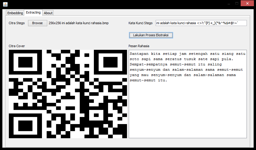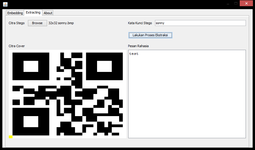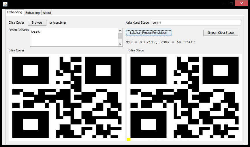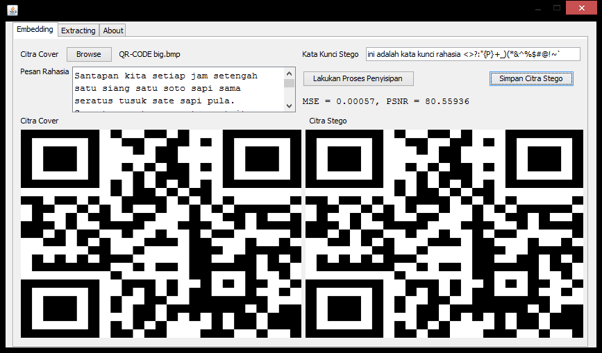 | Fungsi utama aplikasi ini adalah untuk memasukkan pesan rahasia ke dalam citra QR Code tanpa merusak citra tersebut. Input yang digunakan adalah citra QR Code bertipe bmp dan teks pesan rahasia yang akan disisipkan. Sistem kemudian akan melakukan penyisipan teks ke dalam citra QR Code tersebut. Hasil citra ini kemudian dapat disimpan untuk kemudian dilakukan ujicoba secara manual apakah masih berfungsi dengan baik. Proses berikutnya adalah proses ekstraksi pesan rahasia dari citra hasil pemrosesan. Teks hasil ekstraksi tentu saja harus kembali seperti aslinya dan tidak mengalami perubahan karakter. Metode yang digunakan adalah metode Spread Spectrum dan LSB (Least Significant Bit). Tutorial metode ini dapat dilihat pada link diatas. | |