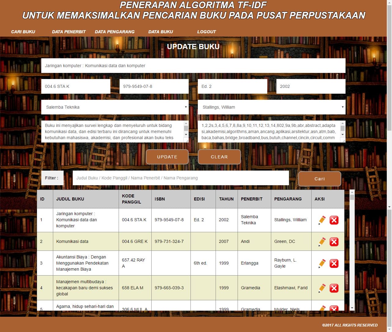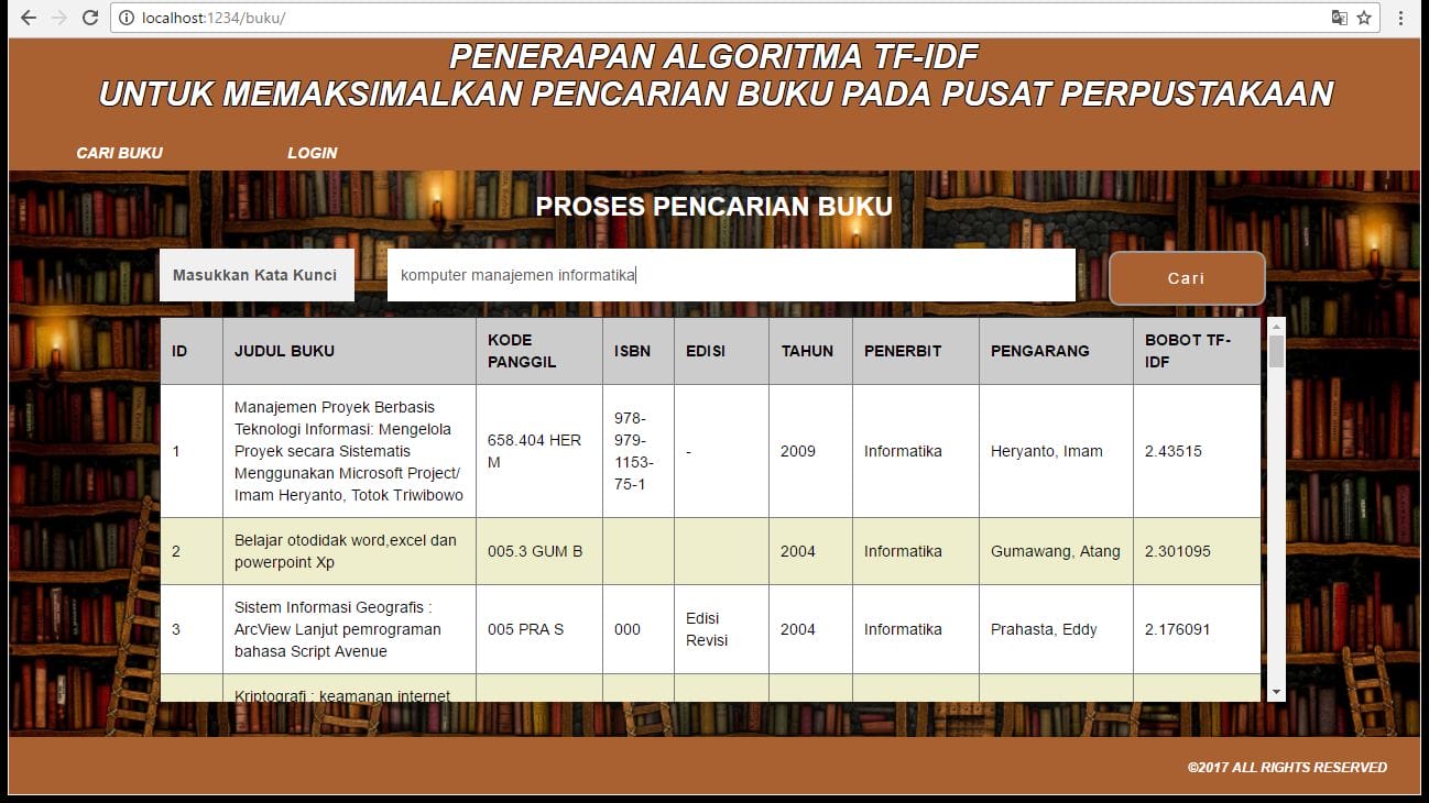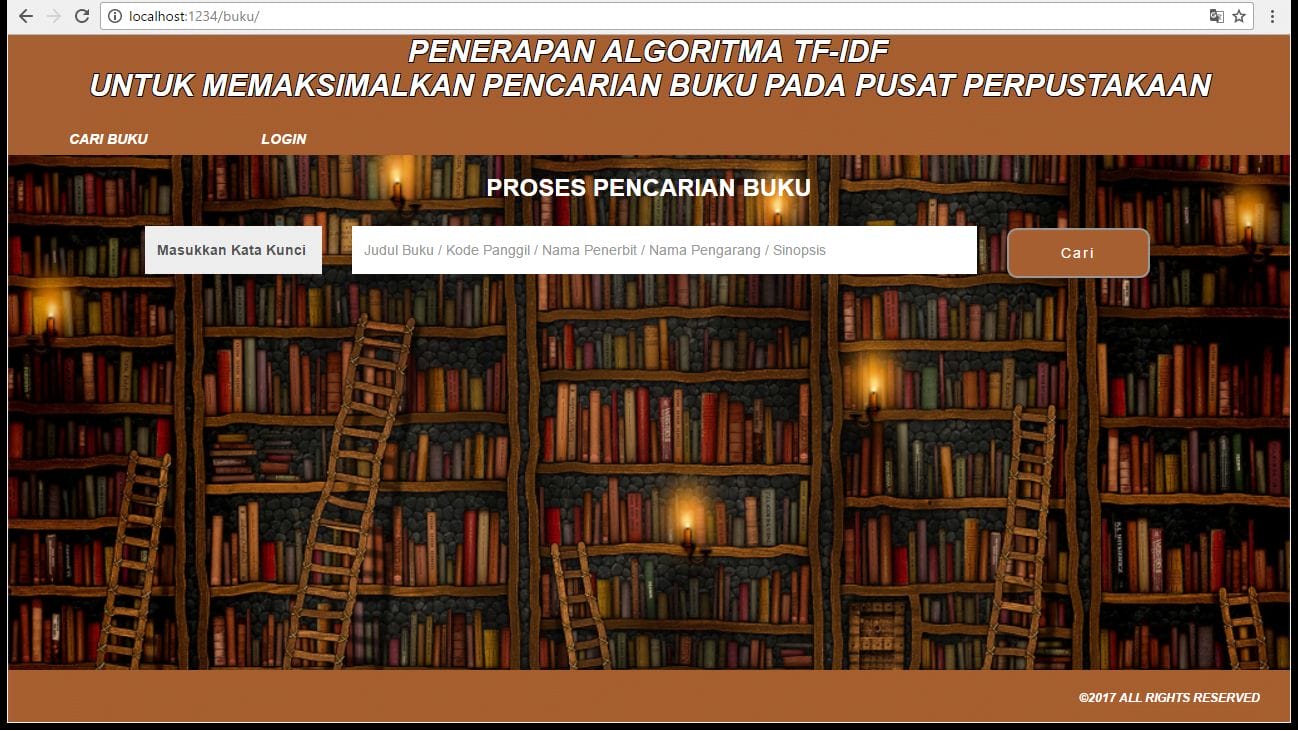 | Fungsi utama aplikasi ini adalah menampilkan urutan data buku yang paling relevan dengan kata kunci yang diinputkan. Setelah memasukkan kata kunci yang digunakan, sistem akan melakukuan proses perhitungan pada semua data buku dan menampilkan urutan data buku yang paling relevan dengan kata kunci tersebut. Kriteria yang diperhitungkan adalah kriteria judul buku, kode panggil, nama pengarang, nama penerbit, dan sinopsis. | |
