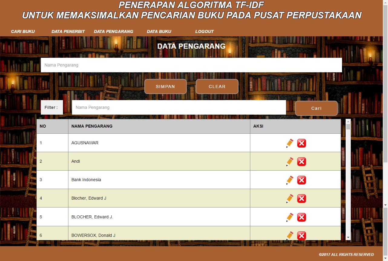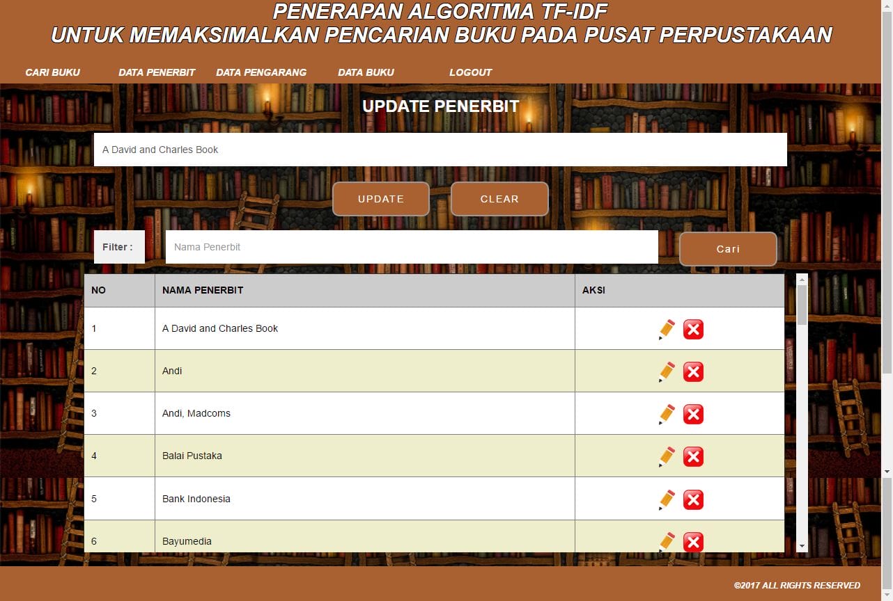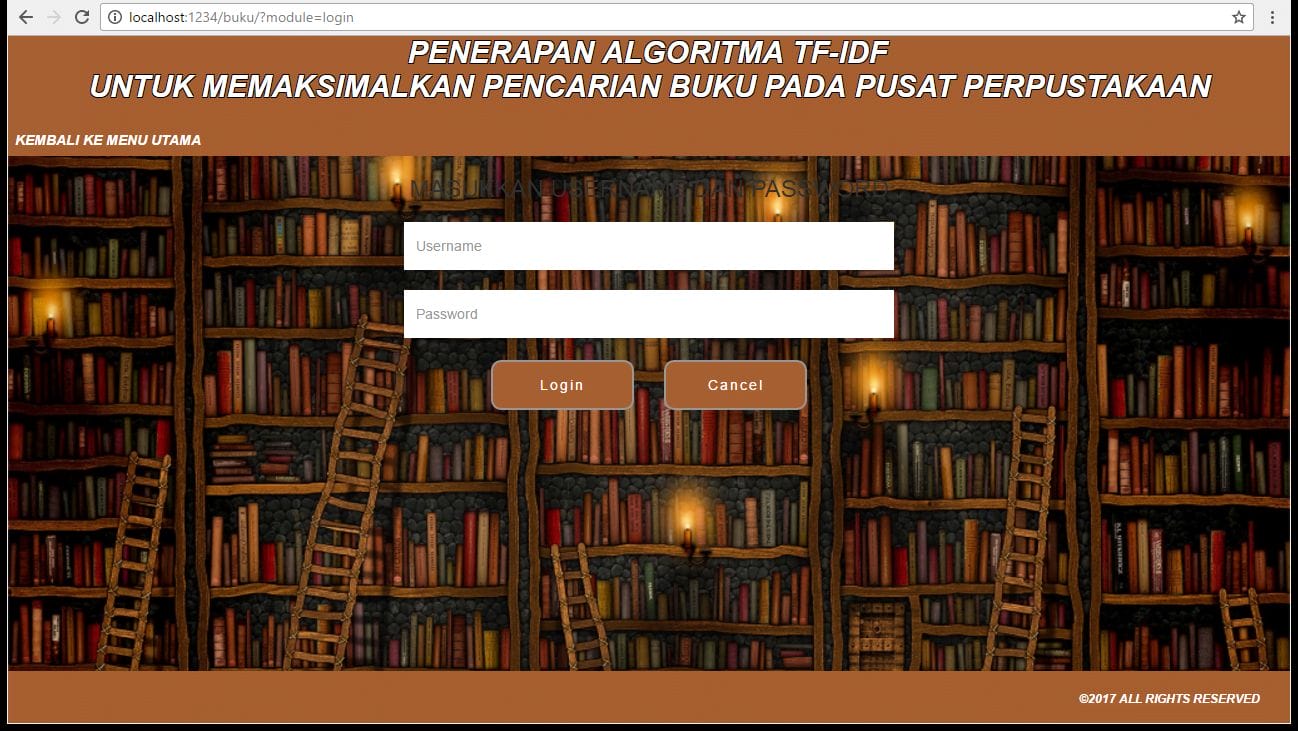 | Fungsi utama aplikasi ini adalah menampilkan urutan data buku yang paling relevan dengan kata kunci yang diinputkan. Setelah memasukkan kata kunci yang digunakan, sistem akan melakukuan proses perhitungan pada semua data buku dan menampilkan urutan data buku yang paling relevan dengan kata kunci tersebut. Kriteria yang diperhitungkan adalah kriteria judul buku, kode panggil, nama pengarang, nama penerbit, dan sinopsis. | |