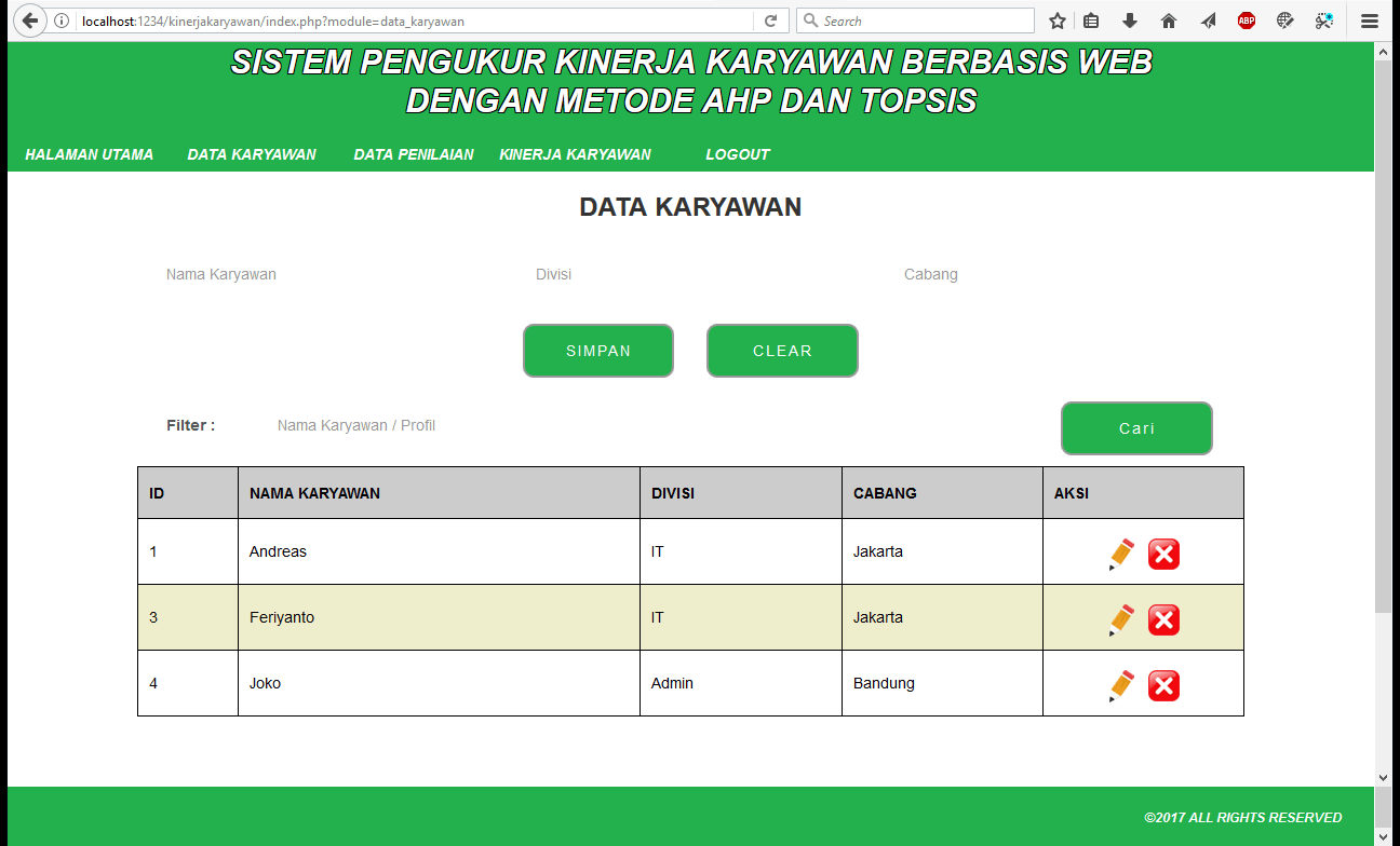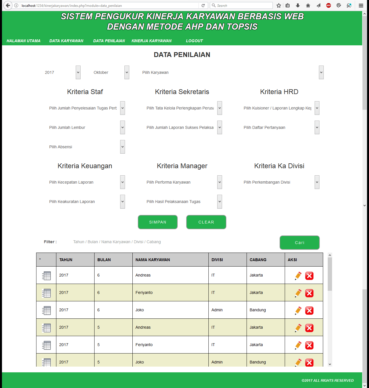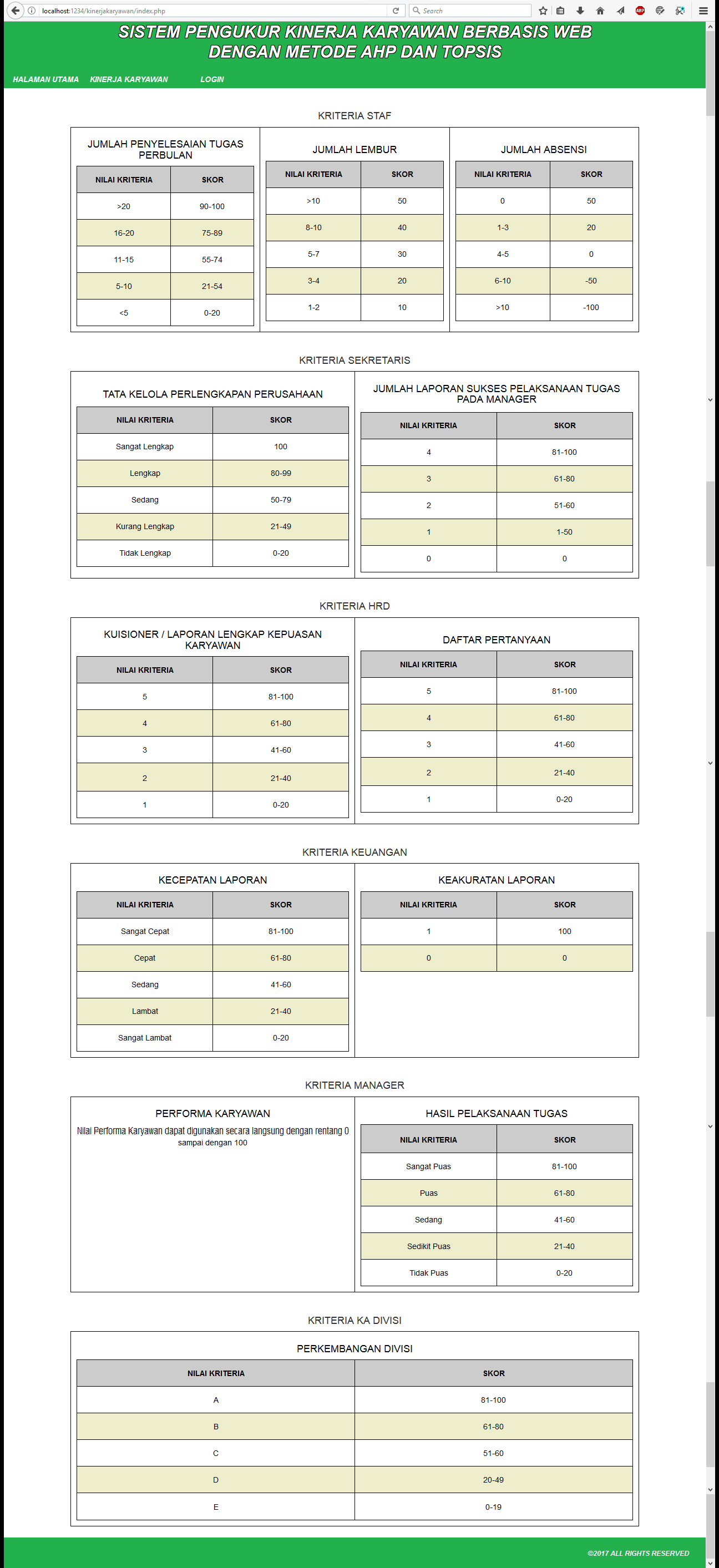 | Terdapat 6 kriteria yang digunakan sebagai sistem pengukur kinerja karyawan, dan masing-masing kriteria juga memiliki beberapa sub-kriteria. Masing-masing karyawan kemudian akan diberikan penilaian berdasarkan masing-masing sub kriteria yang telah ditentukan sebelumnya. Pada saat proses perhitungan kinerja karyawan, pengguna dapat memilih periode waktu penilaian, kemudian sistem akan melakukan perhitungan skor kinerja karyawan berdasarkan data karyawan yang tersedia pada periode tersebut. Hasil perhitungan skor tersebut kemudian akan diurutkan berdasarkan skor tertinggi dan hasilnya akan ditampilkan pada layar. Metode yang digunakan adalah metode AHP (Analytic Hierarchy Process) and TOPSIS (Technique for Order of Preference by Similarity to Ideal Solution). Tutorial metode ini dapat dilihat pada link diatas. | |