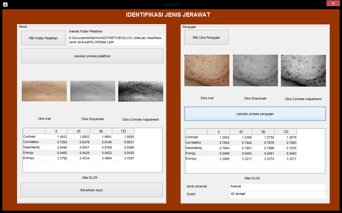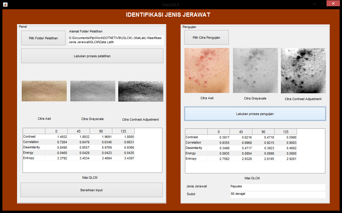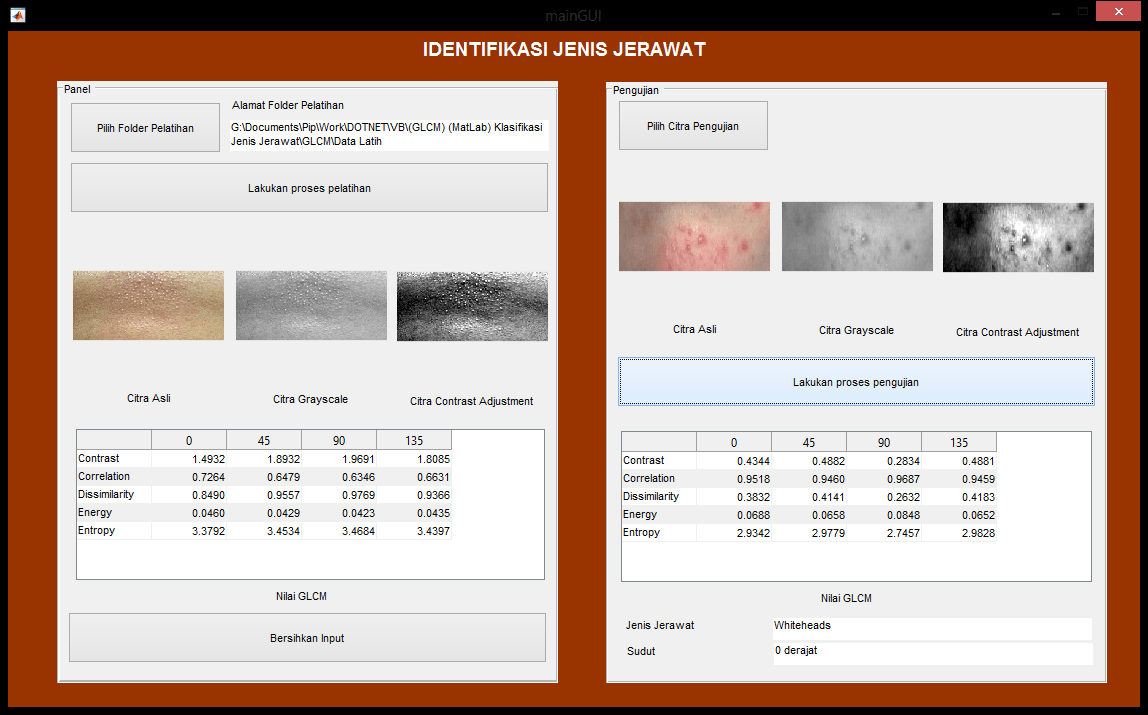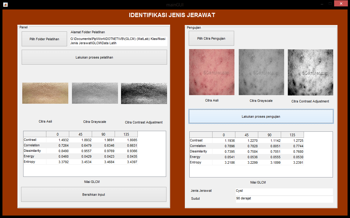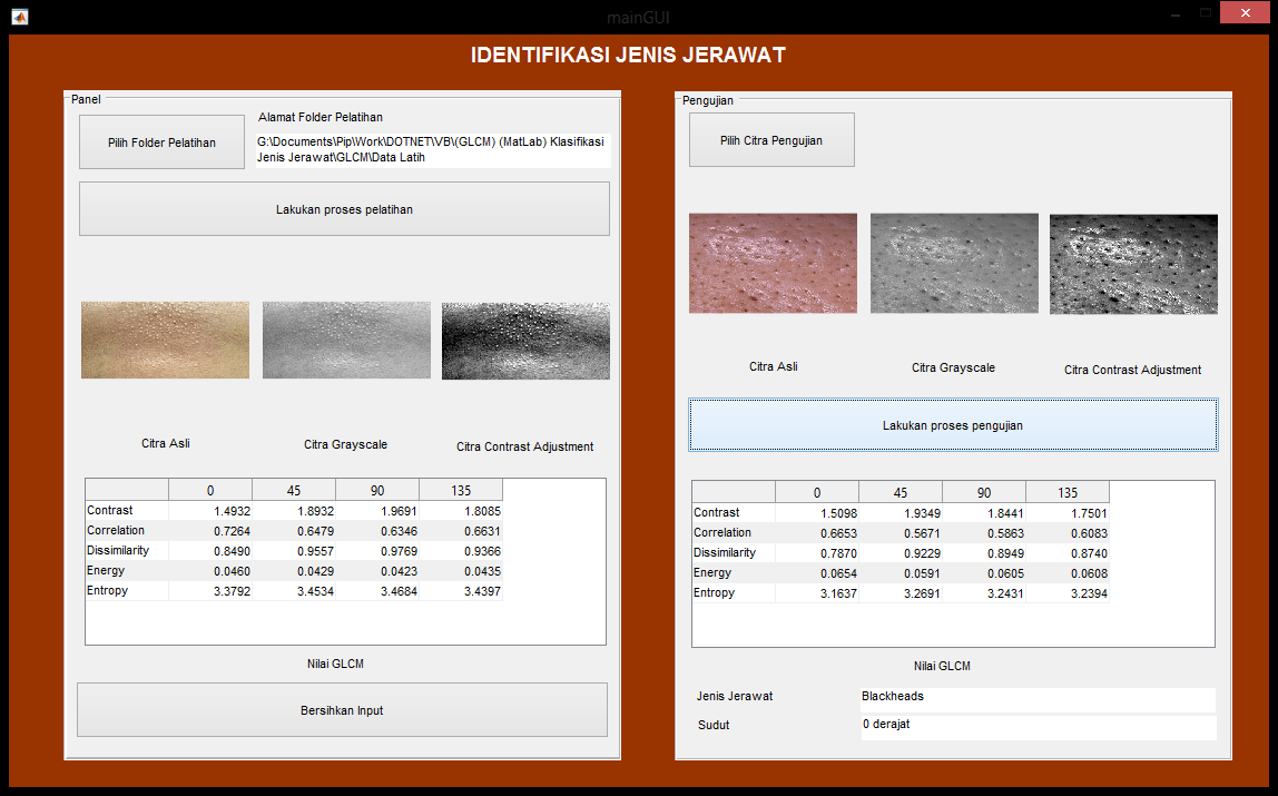 | Ada berbagai data jenis jerawat yang dikategorikan ke dalam 5 jenis, yaitu Blackheads, Cyst, Papules, Pustule, dan Whiteheads. Proses pertama adalah proses pelatihan, dimanan sistem akan melakukan pelatihan terhadap masing-masing citra jenis jerawat untuk mendapatkan nilai fitur dari masing-masing jenis jerawat. Selanjutnya adalah proses pengujian, dimana pengguna akan memasukkan sebuah citra yang tidak diketahui jenis jerawatnya, dan kemudian sistem akan melakukan perhitungan untuk mendapatkan kesimpulan mengenai jenis jerawat pada citra tersebut. Proses pengujian juga memperhitungkan faktor sudut, sehingga pengguna dapat mengetahui letak sudut jerawat yang paling menentukan jawaban jenis tersebut. Metode yang digunakan adalah metode GLCM (Gray-Level Co-occurence Matrix). Tutorial dari masing-masing metode dapat dilihat pada link diatas. | |