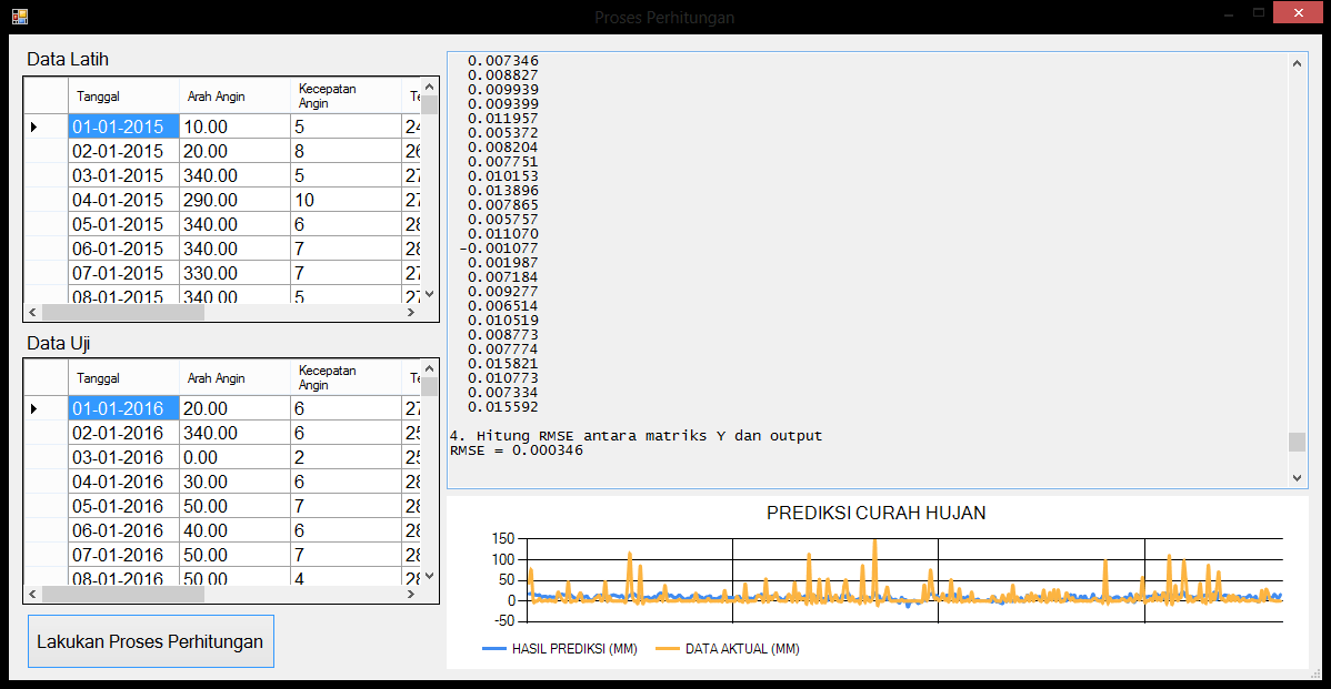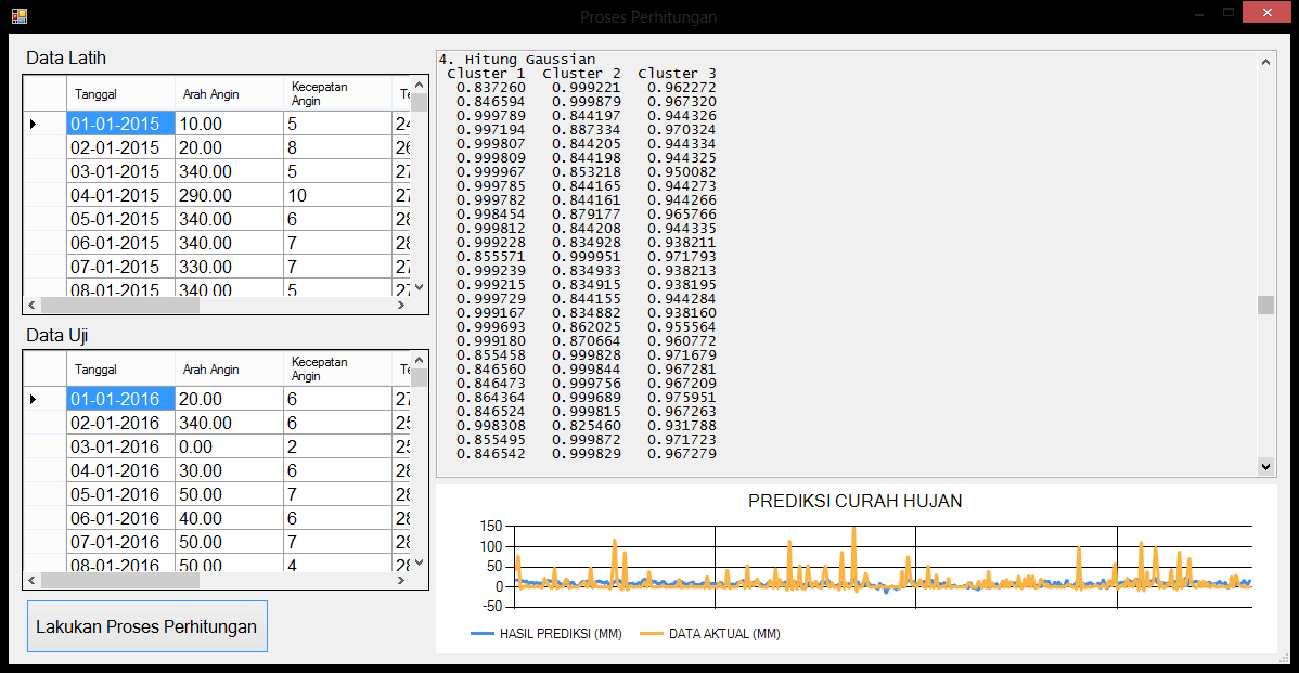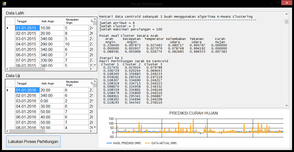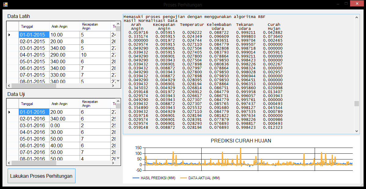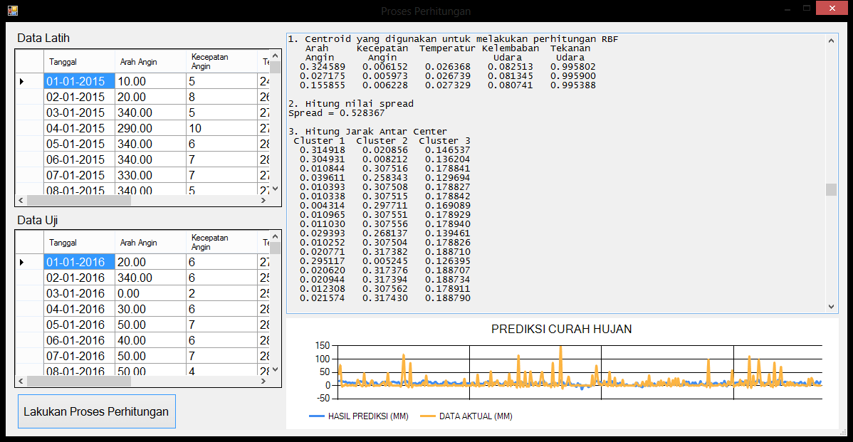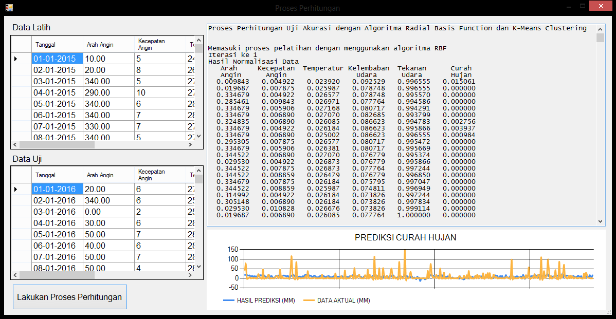 | Fungsi utama aplikasi ini adalah untuk melakukan uji akurasi data curah hujan. Data pelatihan yang digunakan adalah data curah hujan pada tahun 2015, dan data pengujian yang digunakan adalah data curah hujan tahun 2016. Pada saat melakukan proses pengujian, aplikasi akan melakukan pelatihan untuk mendapatkan sistem jaringan, dan kemudian menggunakan sistem tersebut untuk menghitung prediksi terhadap masing-masing data uji. Nilai perbandingan antara data sebenarnya dengan data hasil prediksi kemudian ditampilkan pada grafik. Proses perhitungan dicatat dalam log untuk memudahkan pengguna menganalisa nilai variabel dan skor yang terjadi pada saat proses perhitungan. Metode yang digunakan adalah metode K-Means Clustering dan RBF (Radial Basis Function). Tutorial metode ini dapat dilihat pada link diatas. | |