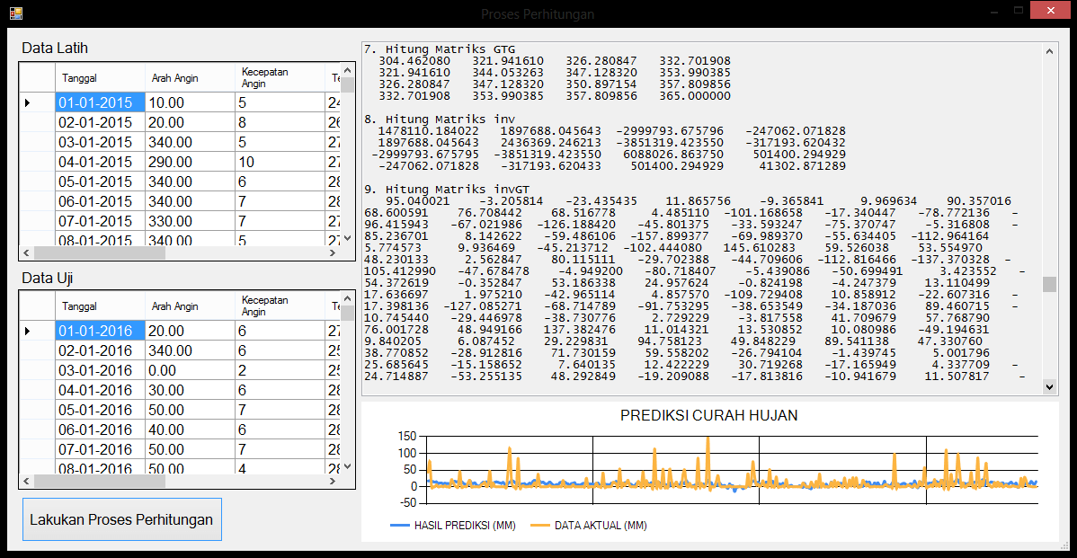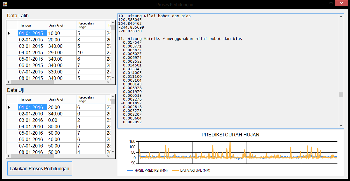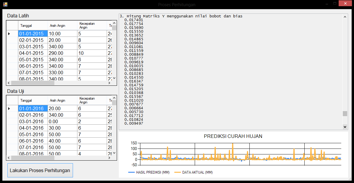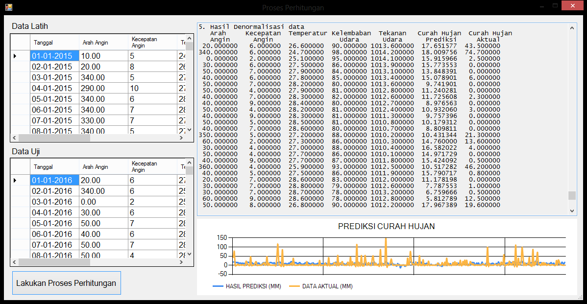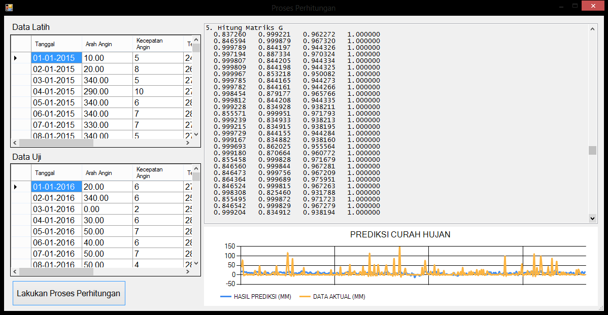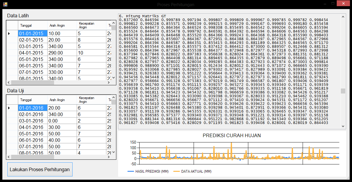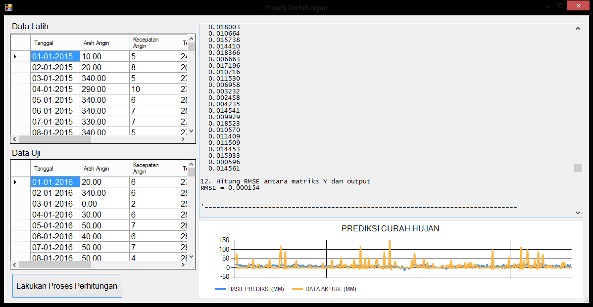 | Fungsi utama aplikasi ini adalah untuk melakukan uji akurasi data curah hujan. Data pelatihan yang digunakan adalah data curah hujan pada tahun 2015, dan data pengujian yang digunakan adalah data curah hujan tahun 2016. Pada saat melakukan proses pengujian, aplikasi akan melakukan pelatihan untuk mendapatkan sistem jaringan, dan kemudian menggunakan sistem tersebut untuk menghitung prediksi terhadap masing-masing data uji. Nilai perbandingan antara data sebenarnya dengan data hasil prediksi kemudian ditampilkan pada grafik. Proses perhitungan dicatat dalam log untuk memudahkan pengguna menganalisa nilai variabel dan skor yang terjadi pada saat proses perhitungan. Metode yang digunakan adalah metode K-Means Clustering dan RBF (Radial Basis Function). Tutorial metode ini dapat dilihat pada link diatas. | |
